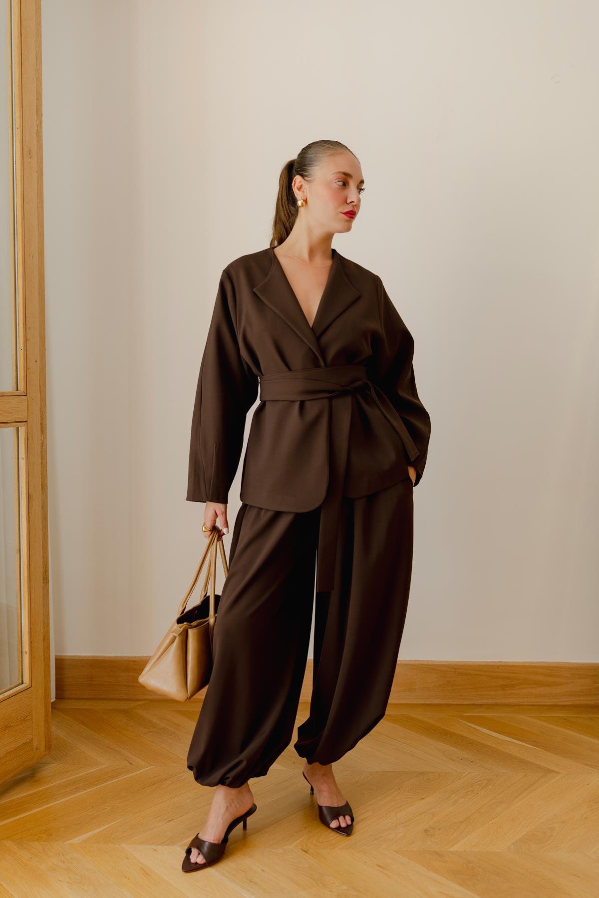 Siyah Balon Kol Kuşaklı Kimono Acı Kahve Balon Kol Kuşaklı Kimono