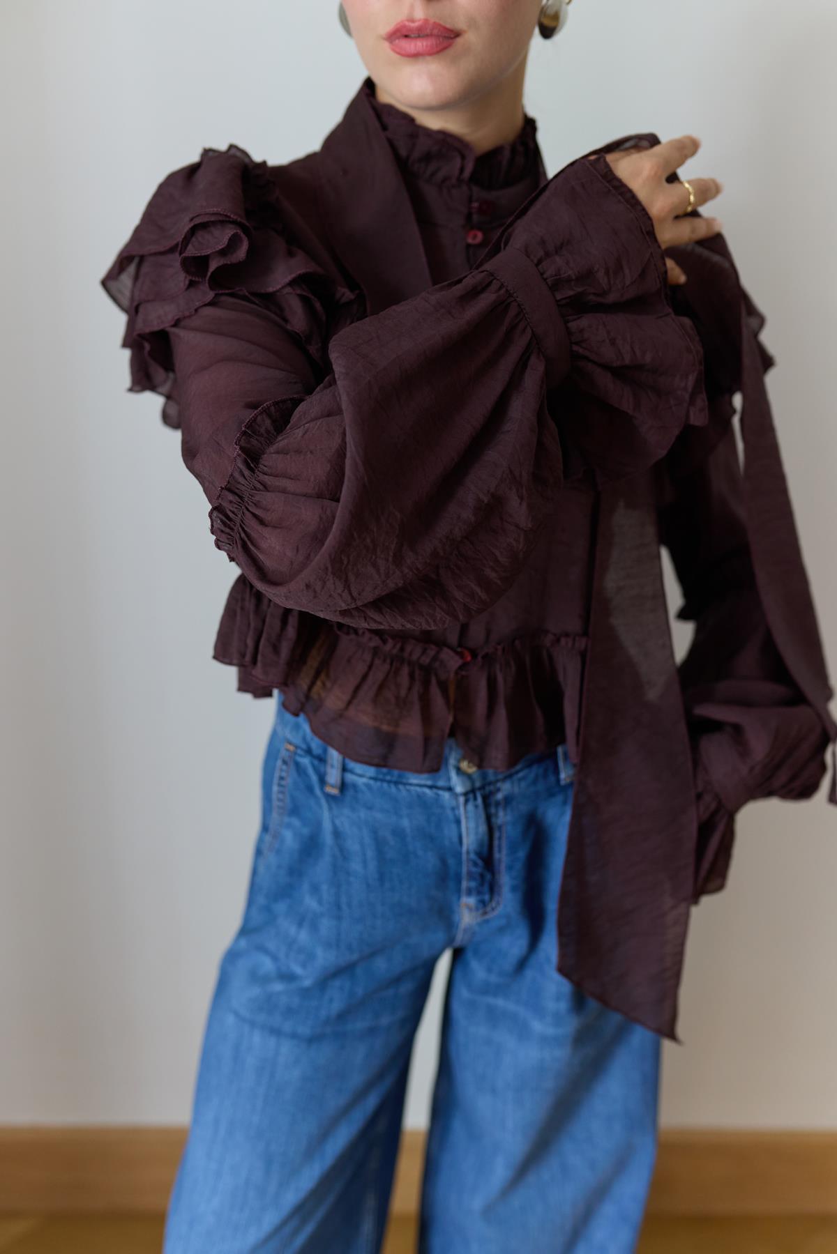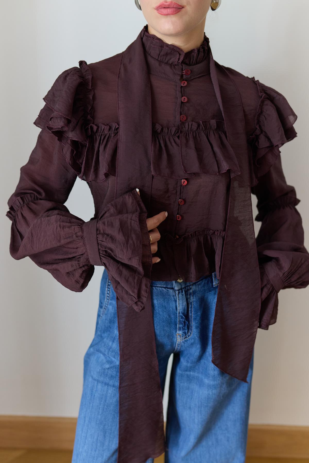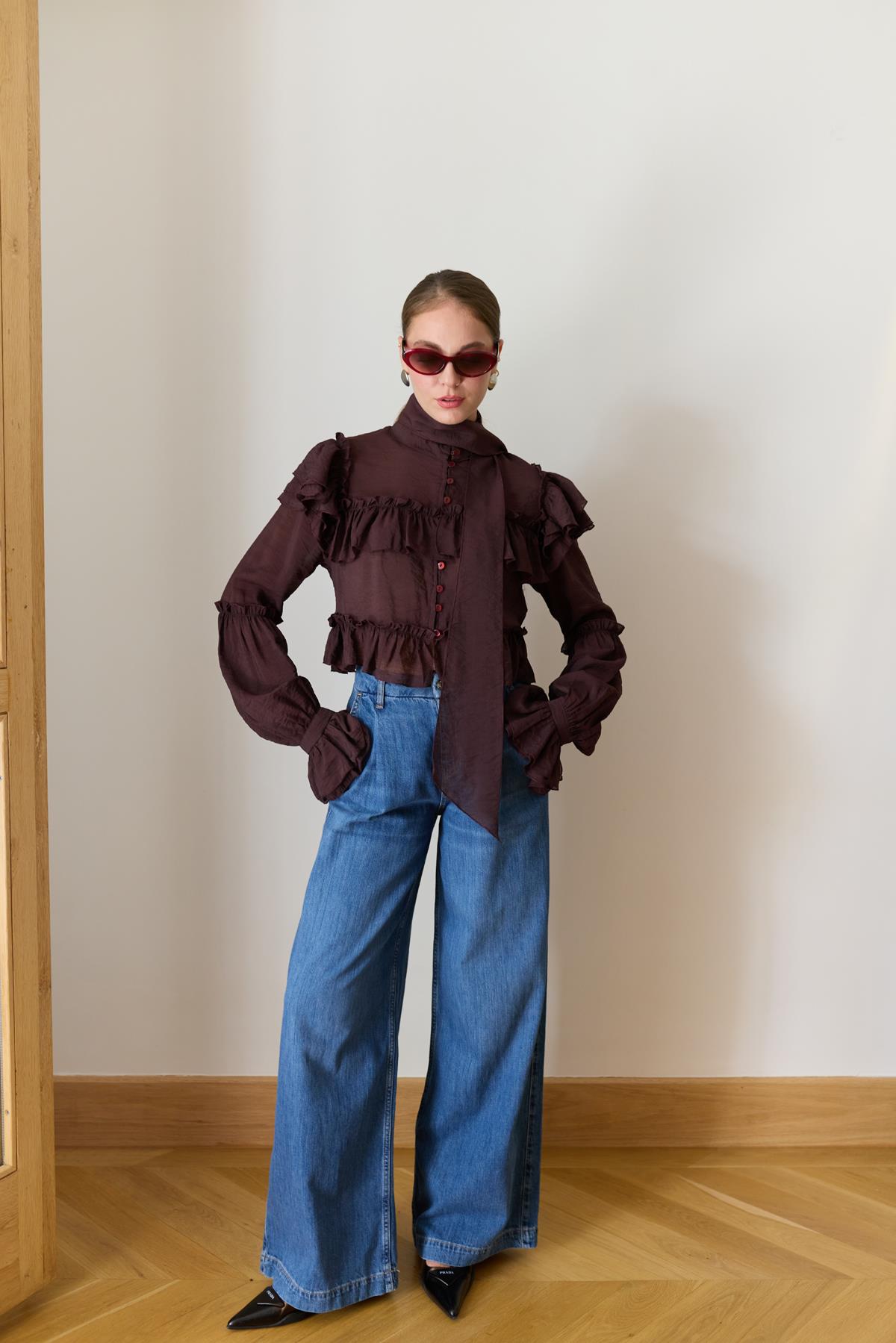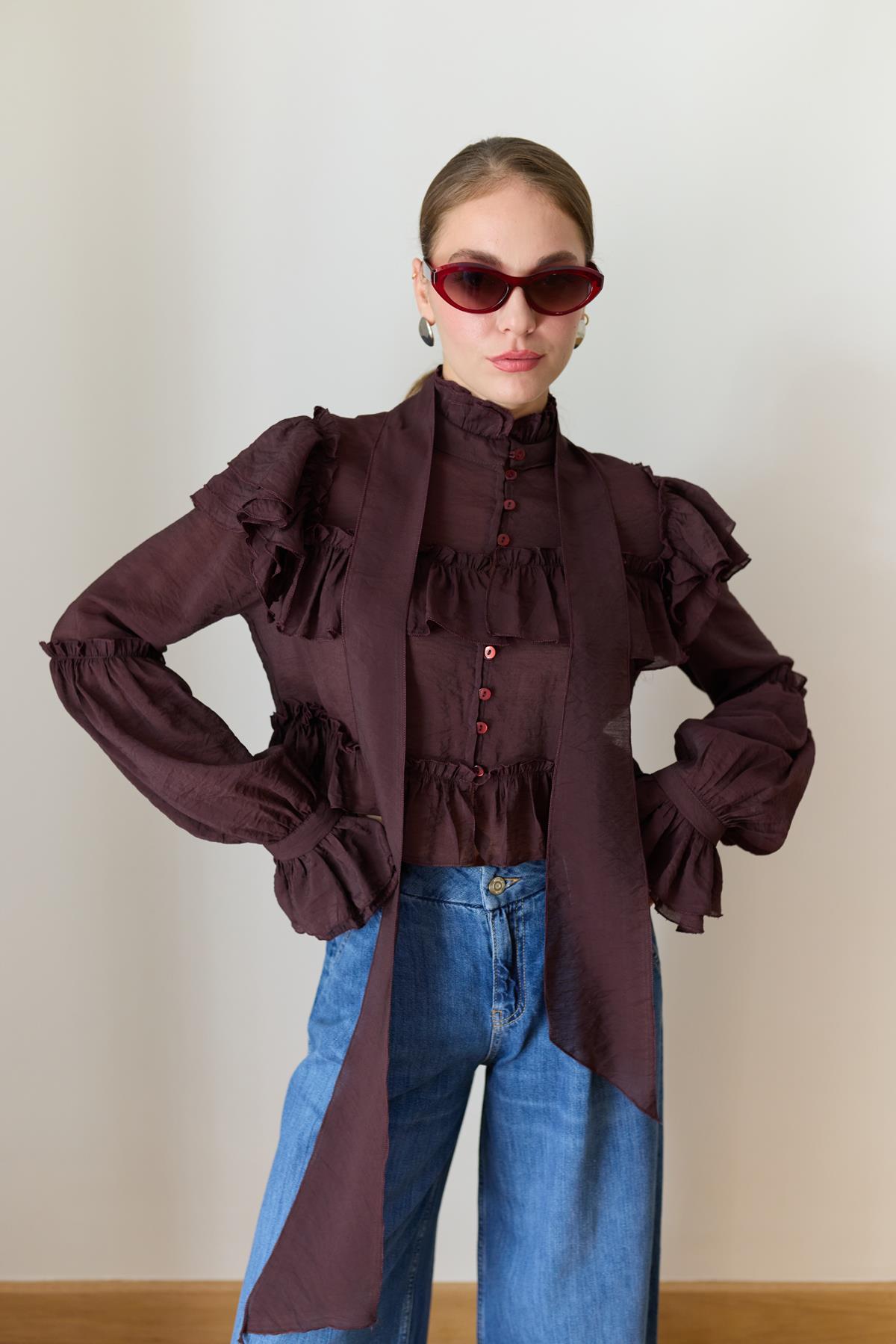 Acı Kahve Hakim Yaka Fırfır Detaylı Ve Kuşaklı Gömlek (103-00728)