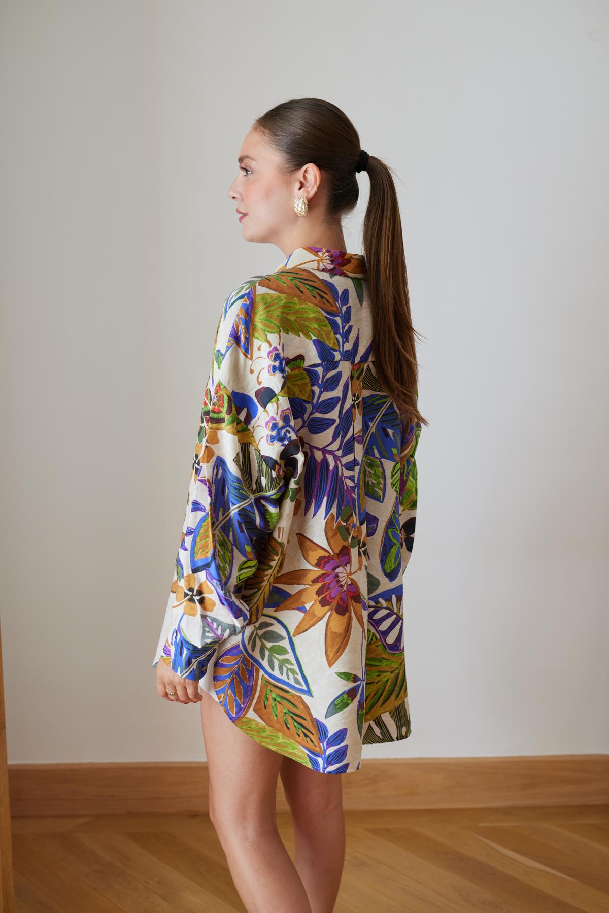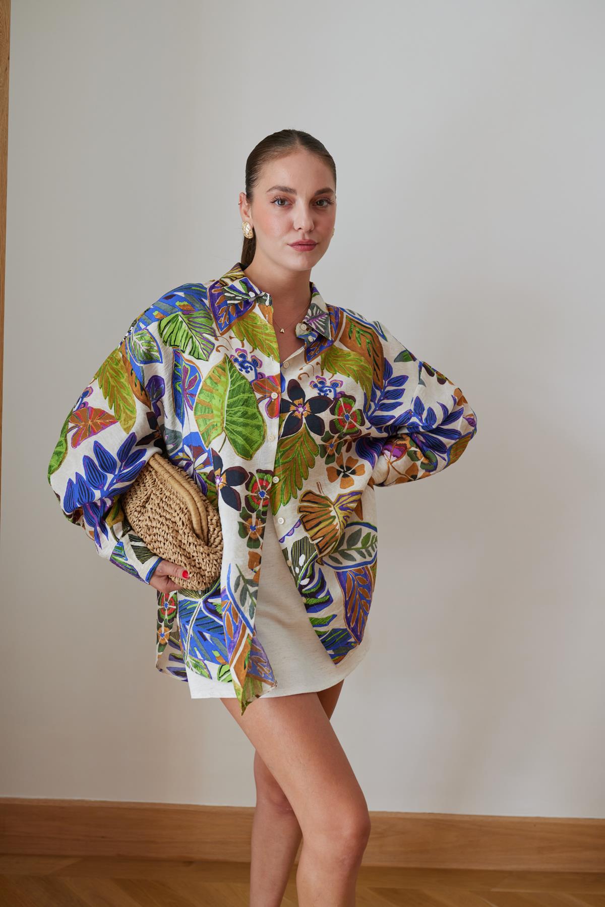 Bej-Lacivert Çiçek Desenli Oversize Gömlek (103-00715)