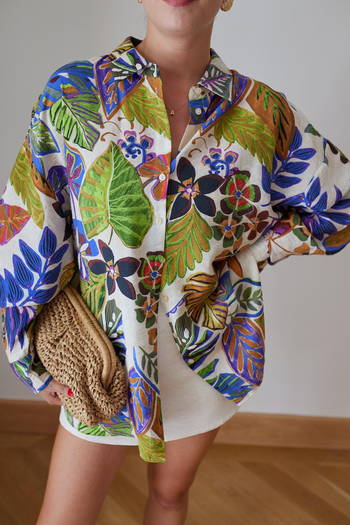 Bej-Lacivert Çiçek Desenli Oversize Gömlek