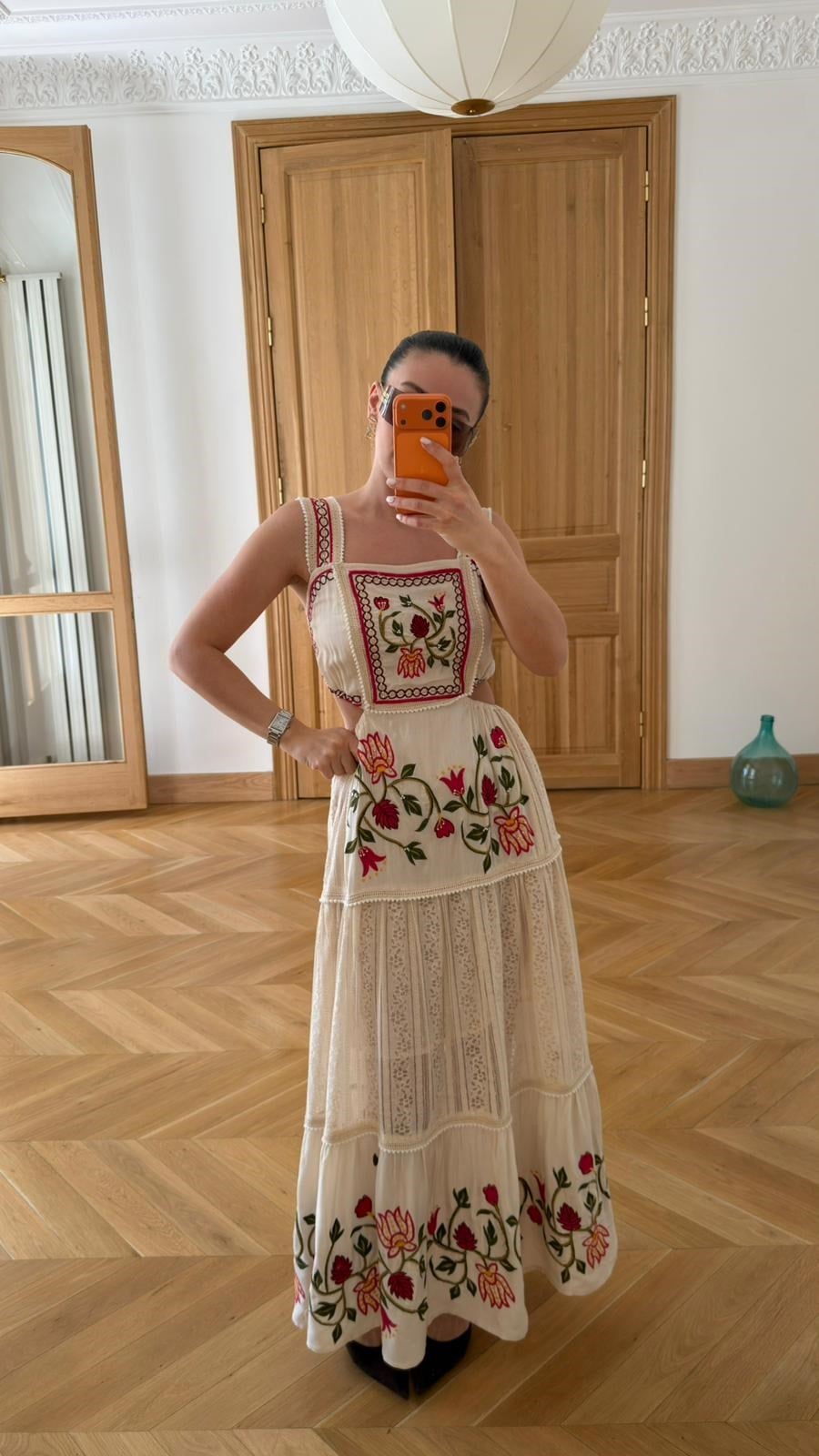 Bej Sırt Dekolteli Boncuk Ve Çiçek Nakışlı Tasarım Elbise