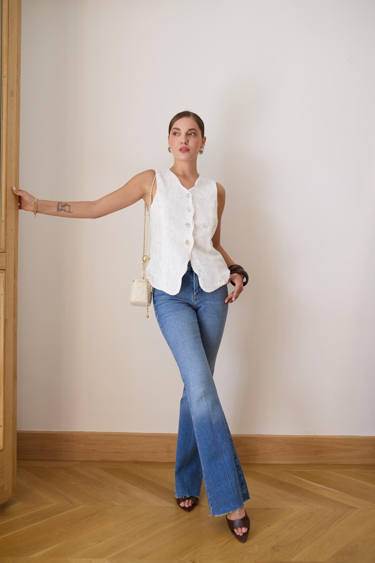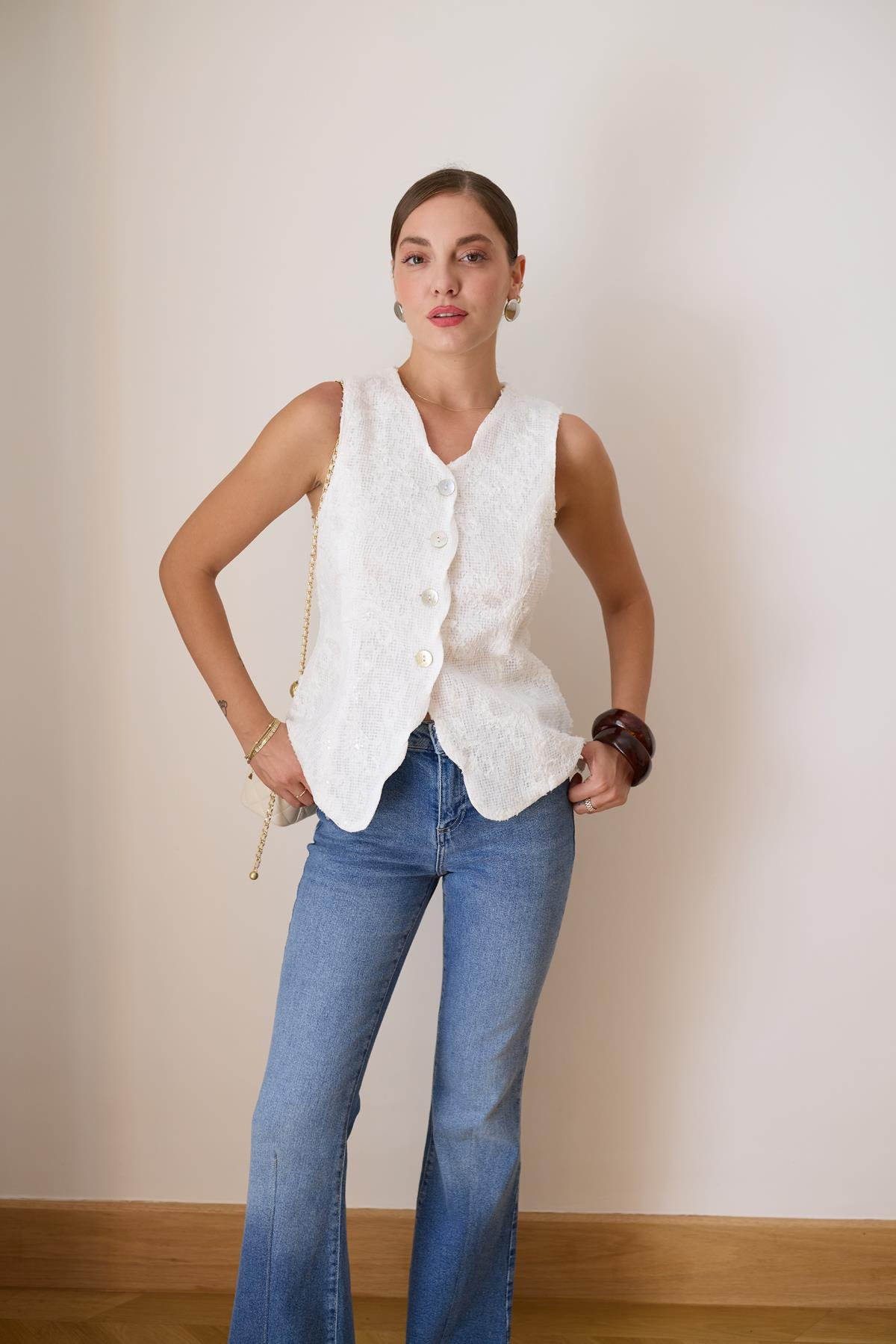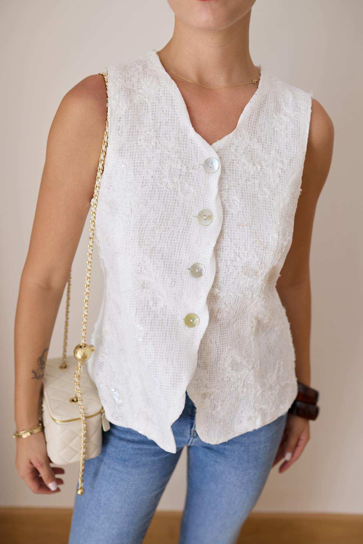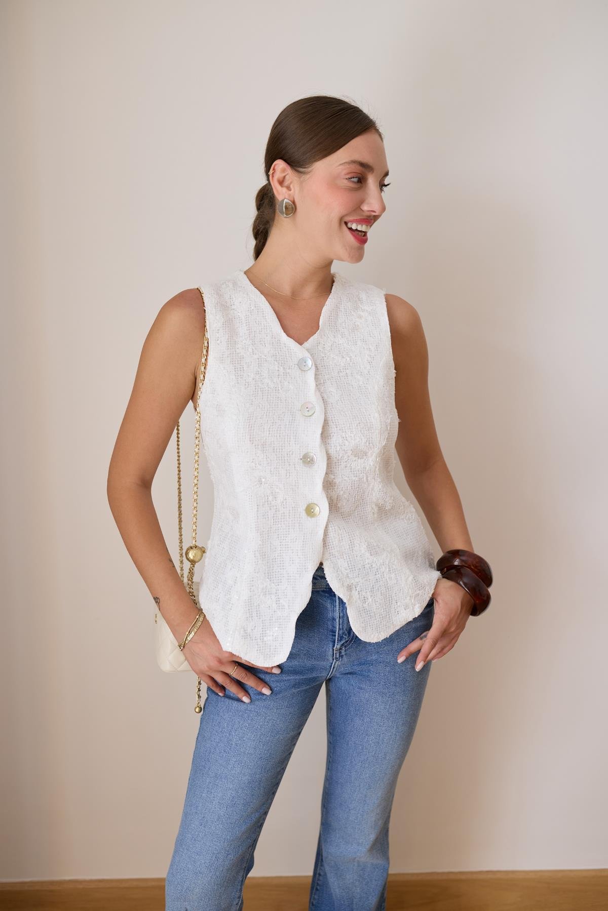 Beyaz Dantel Ve Pul İşlemeli Sedef Düğmeli Yelek