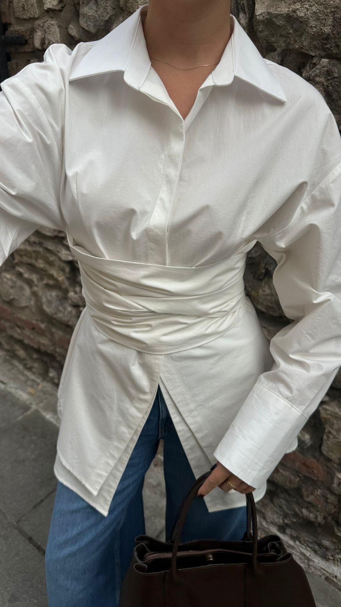 Beyaz Kopçalı Kemer Detaylı Gömlek (103-00743)
