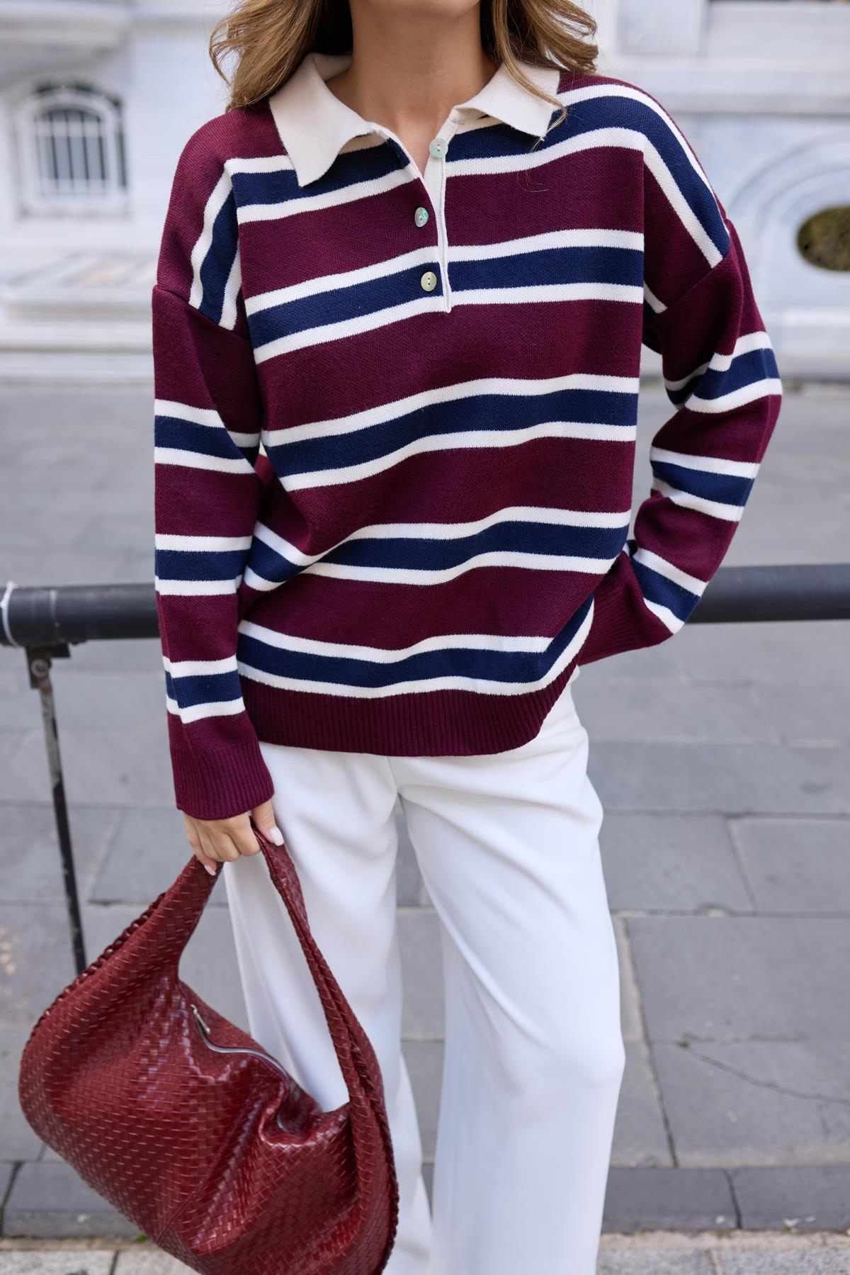 Bordo Polo Yaka Çizgili Oversize Triko (108-00711)