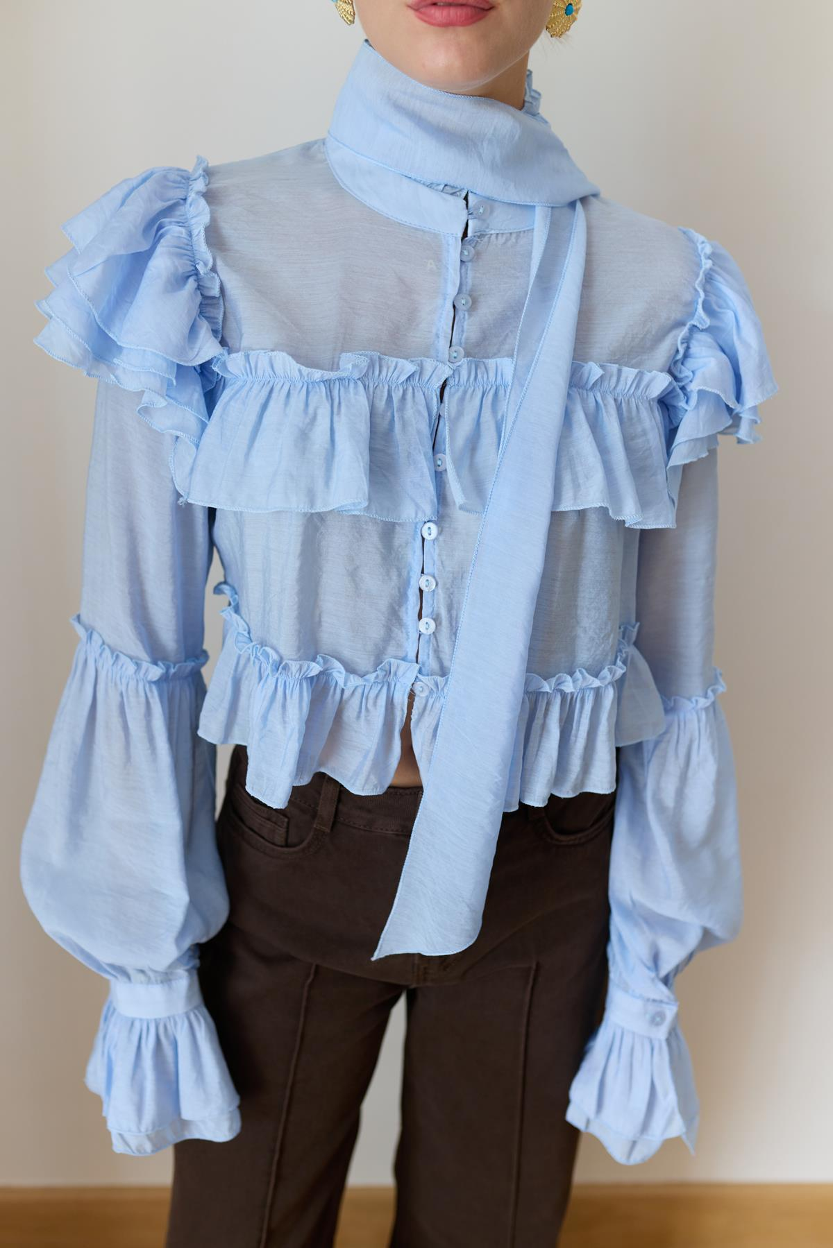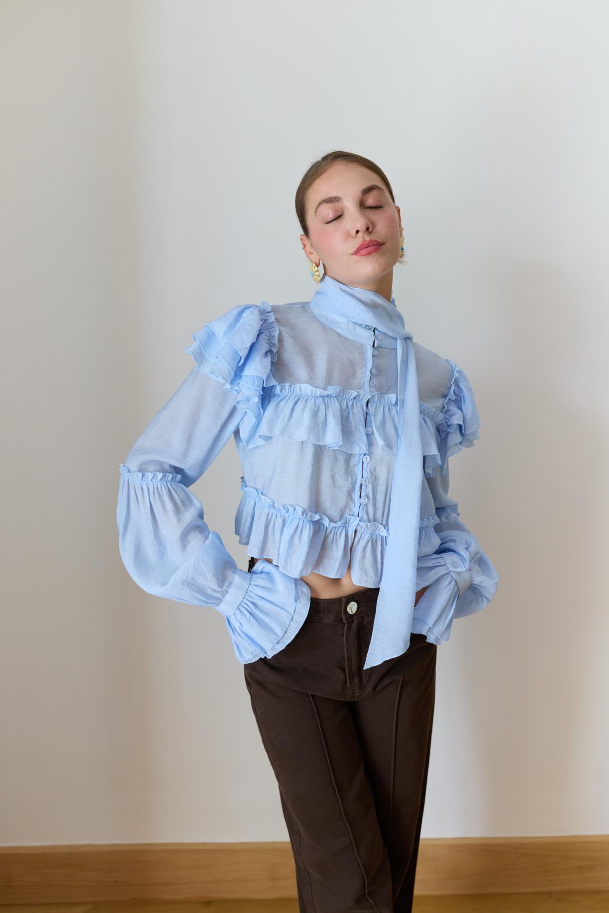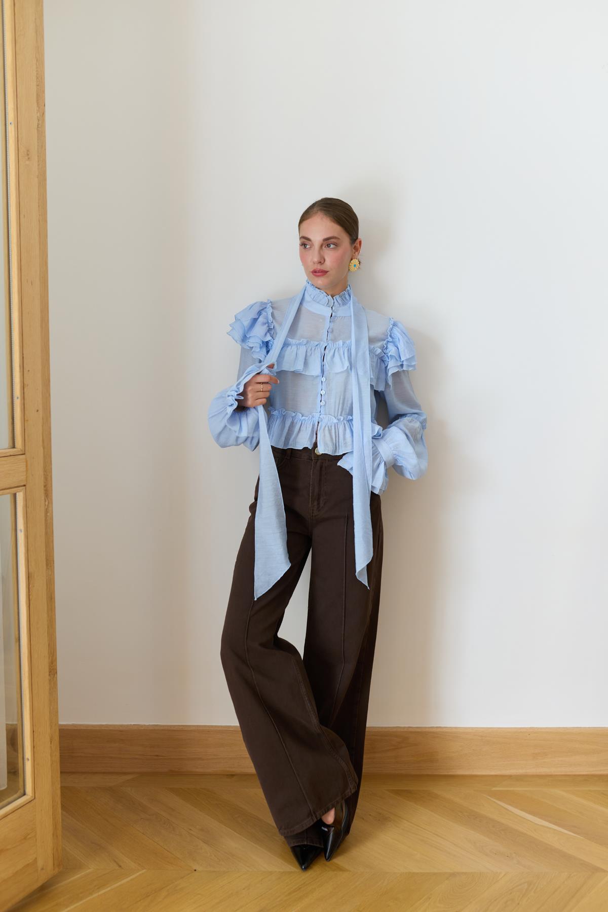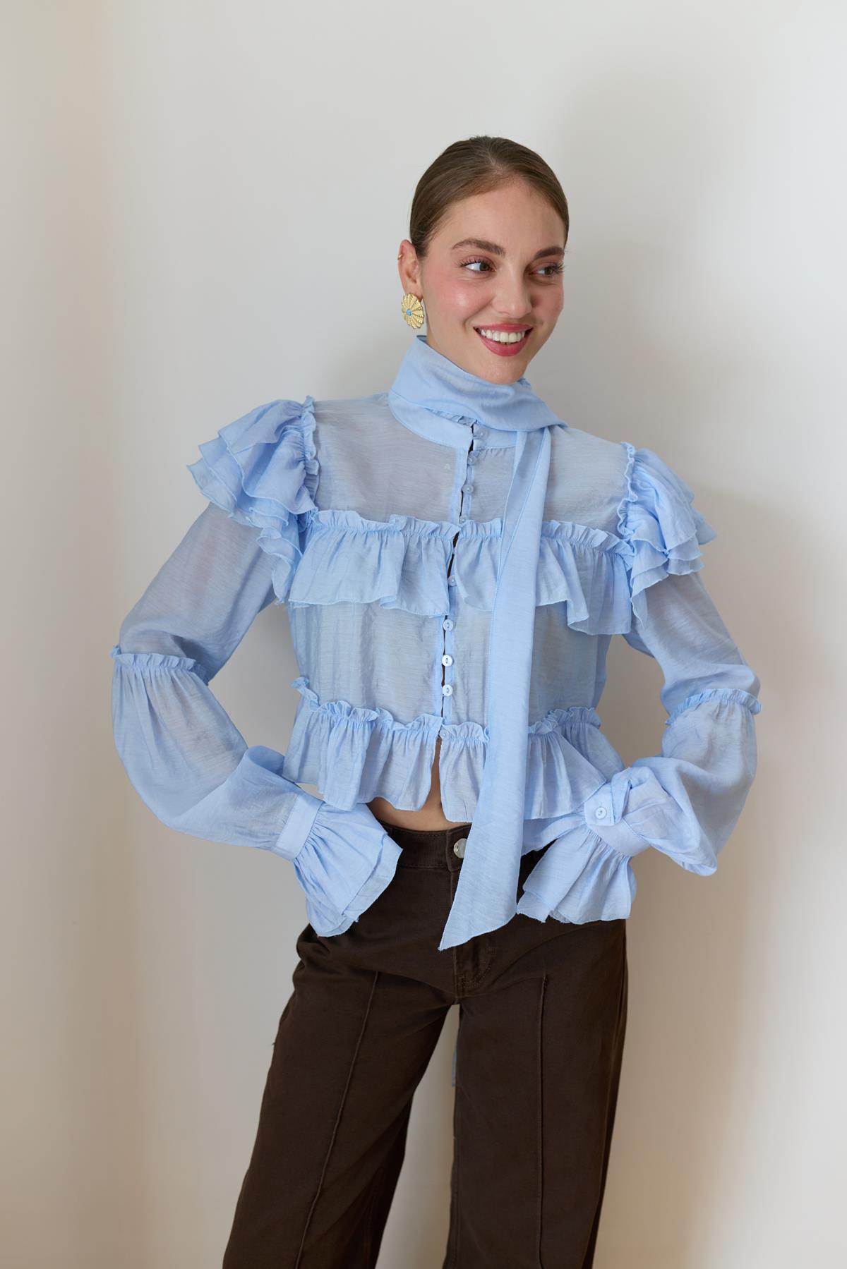Buz Mavi Hakim Yaka Fırfır Detaylı Ve Kuşaklı Gömlek (103-00728)