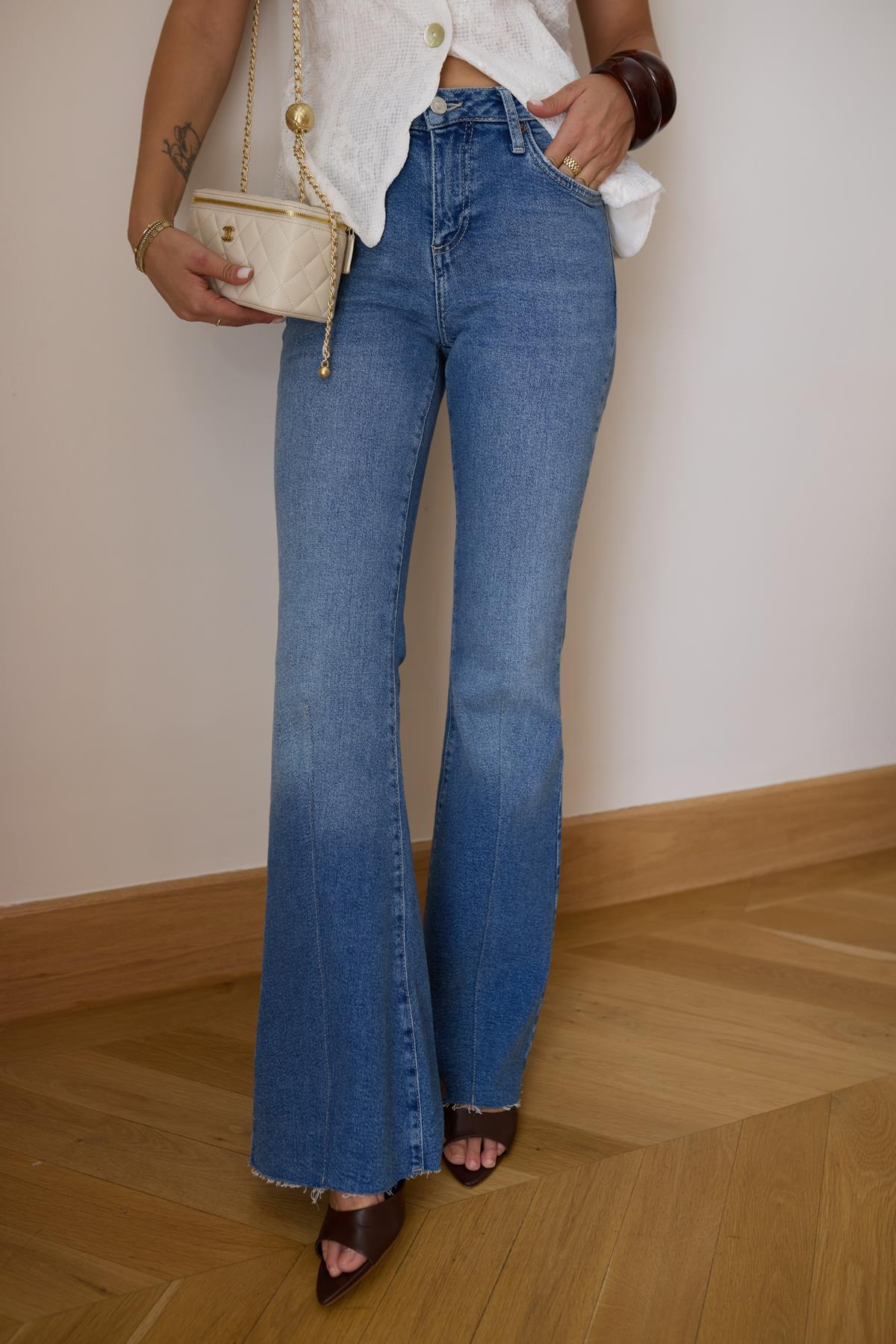 Buz Mavi Ortadan Çizgi Detaylı İspanyol Paça Denim Pantolon