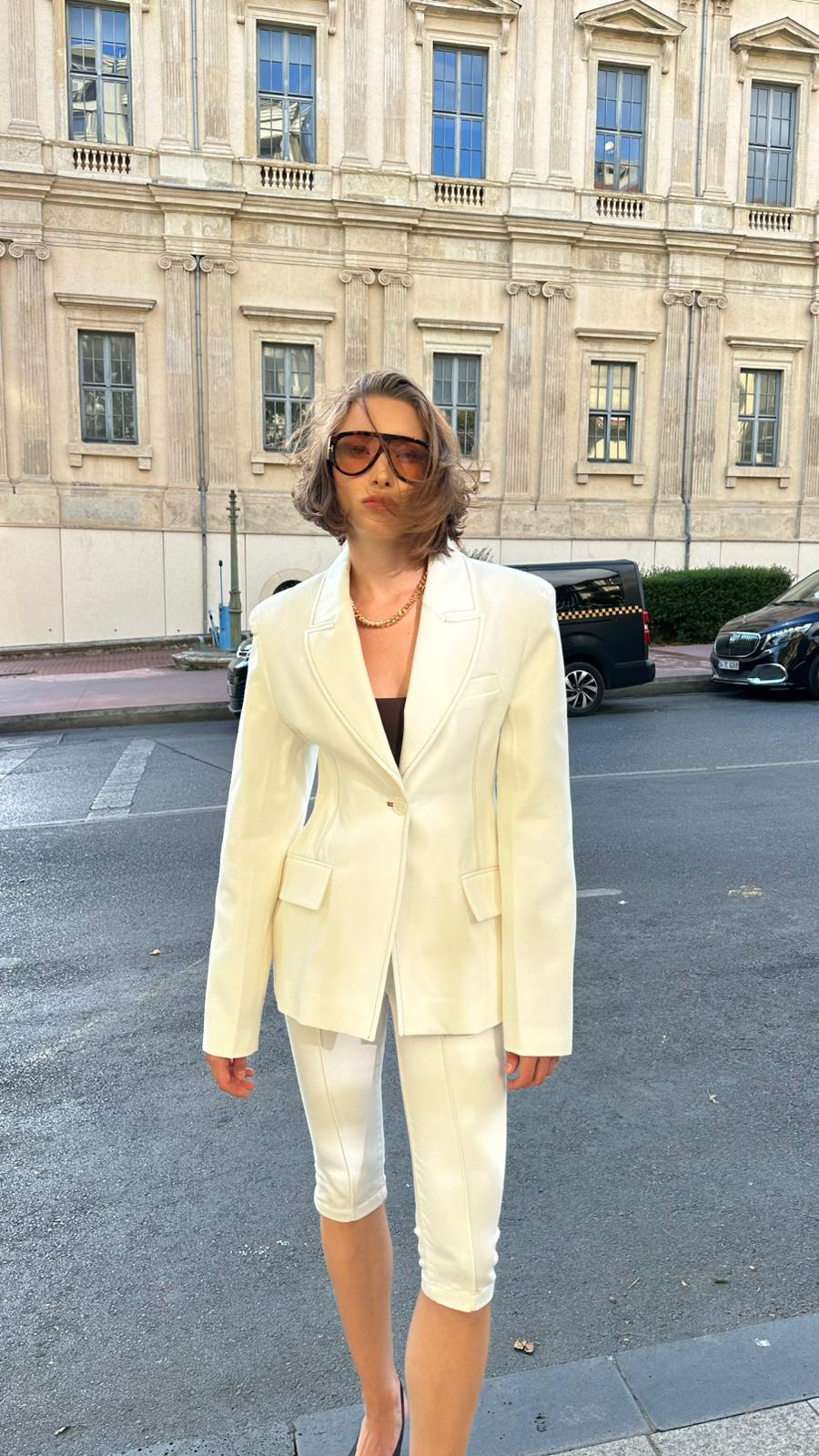 Ekru Belden Oturmalı Dikiş Detaylı Denim Blazer Ceket