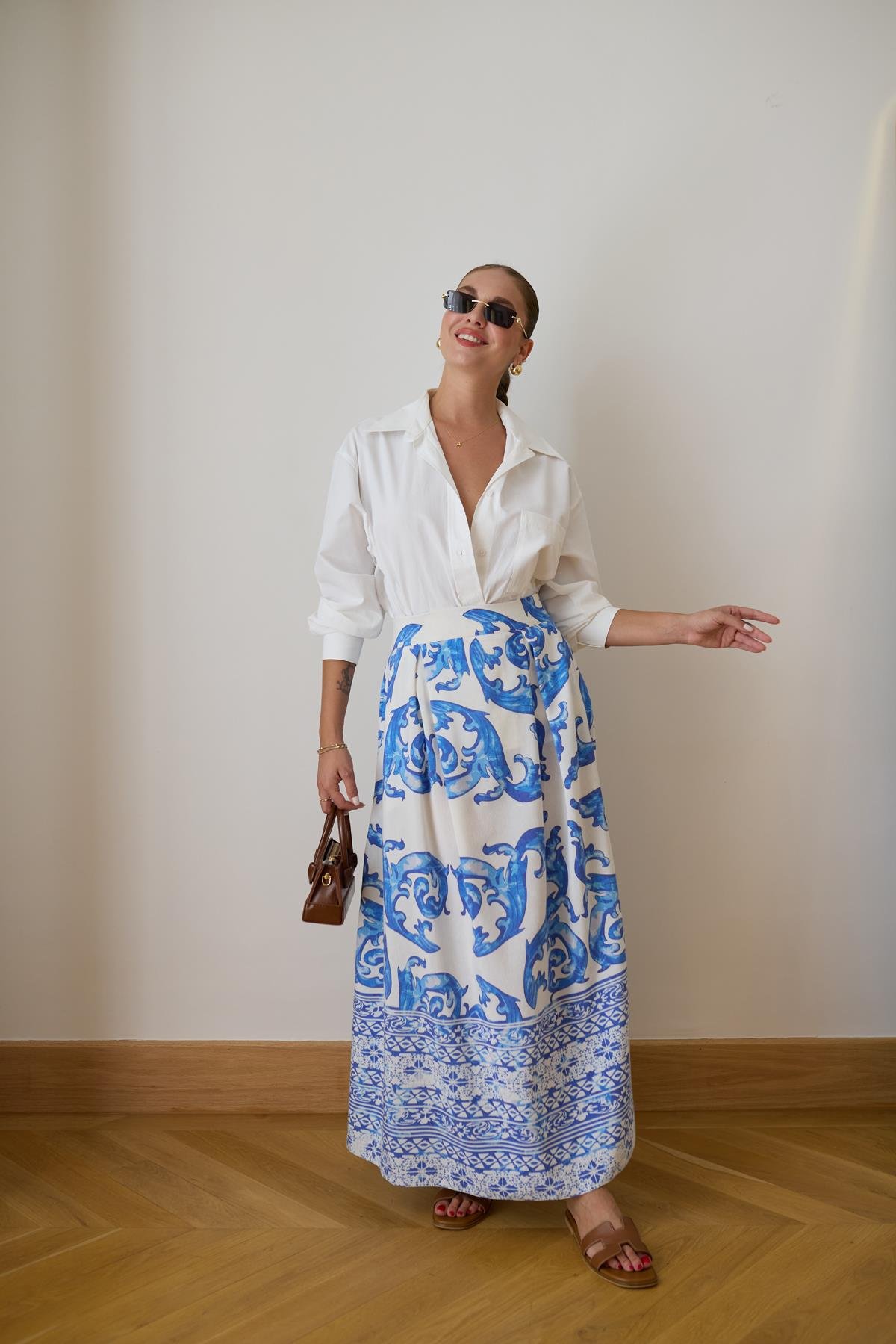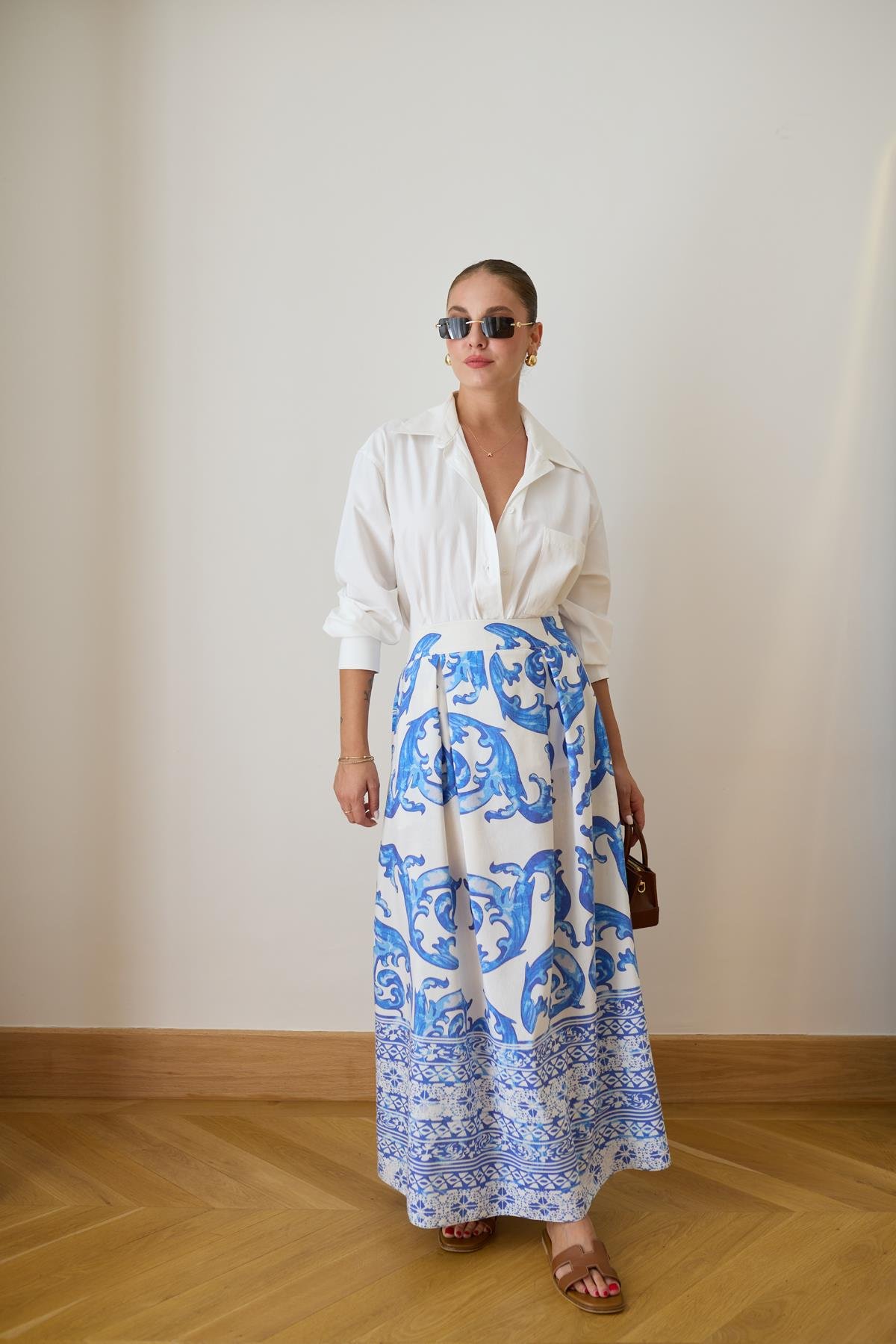 Ekru-Mavi Pens Detaylı Desenli Keten Etek