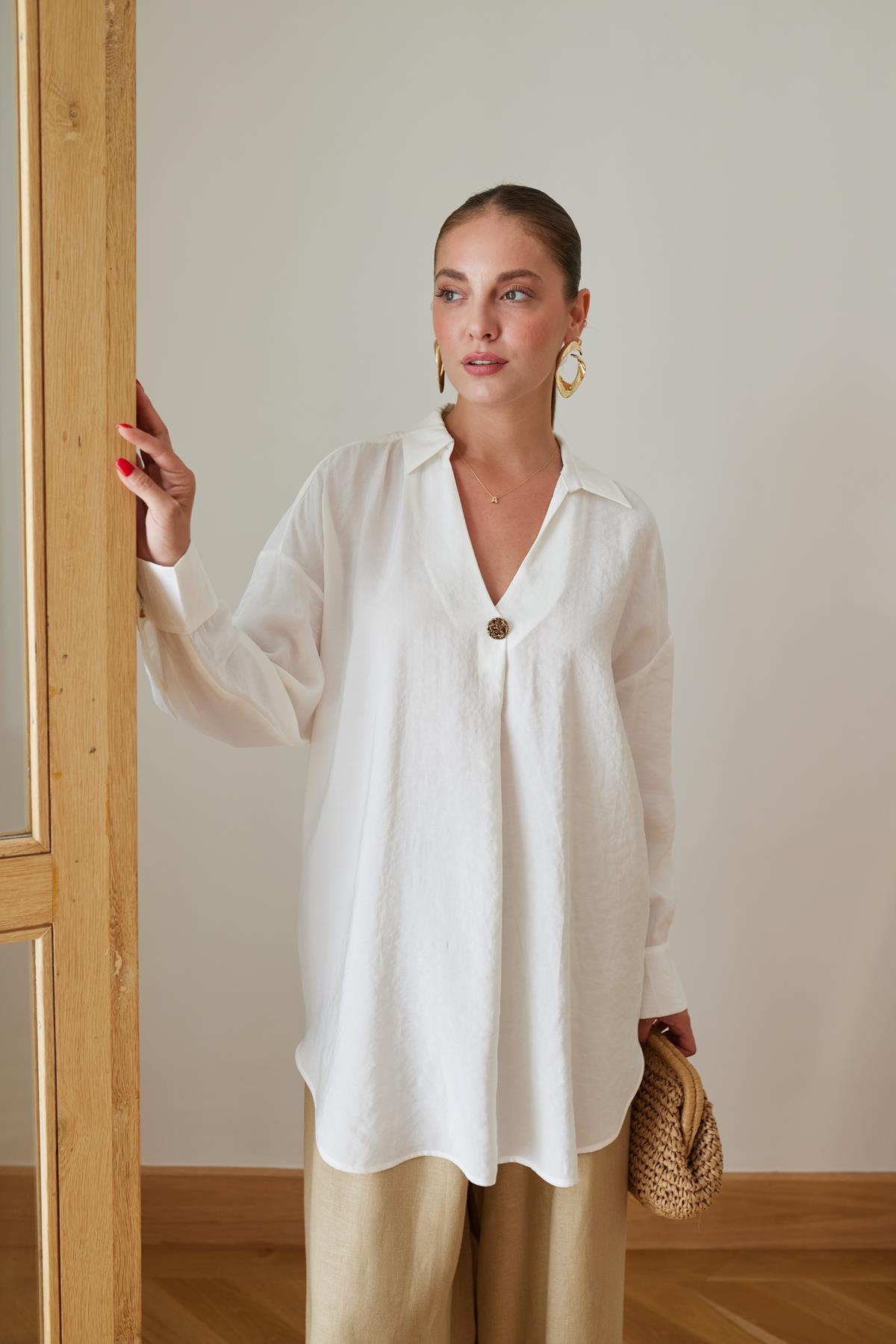 Ekru Önden Aksesuar Detaylı Oversize Tunik Gömlek (103-00720)