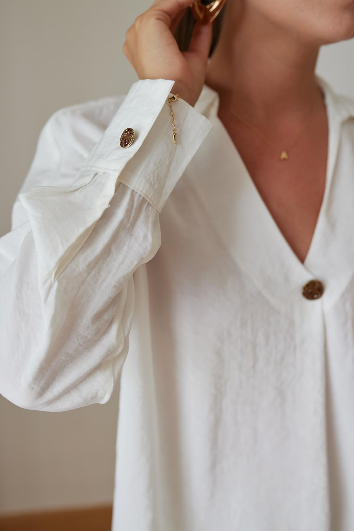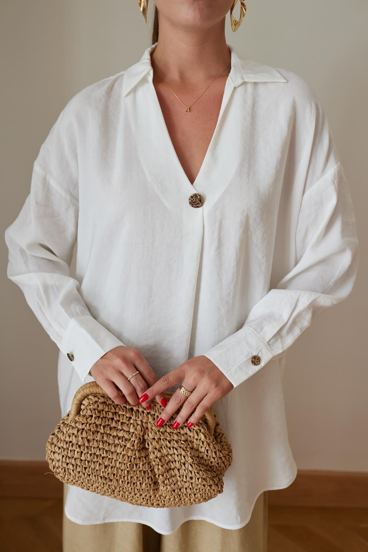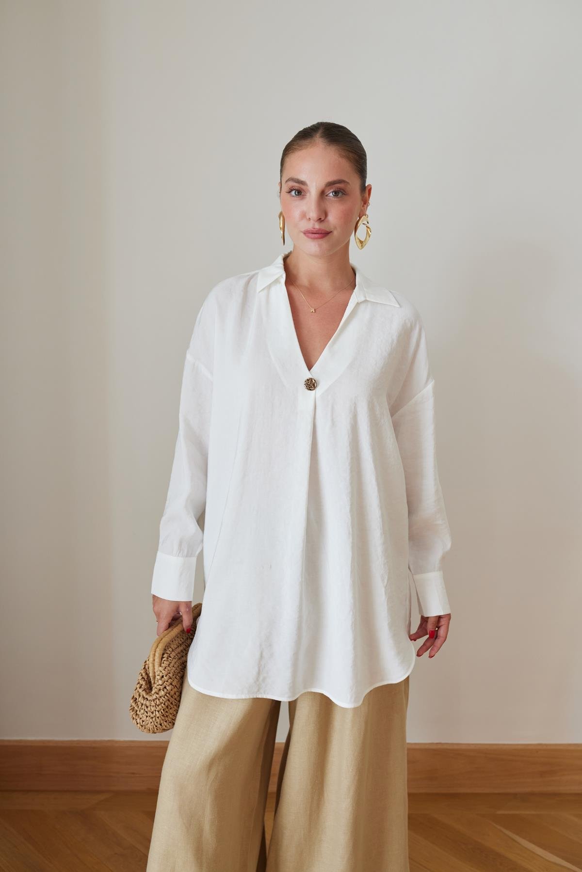 Ekru Önden Aksesuar Detaylı Oversize Tunik Gömlek