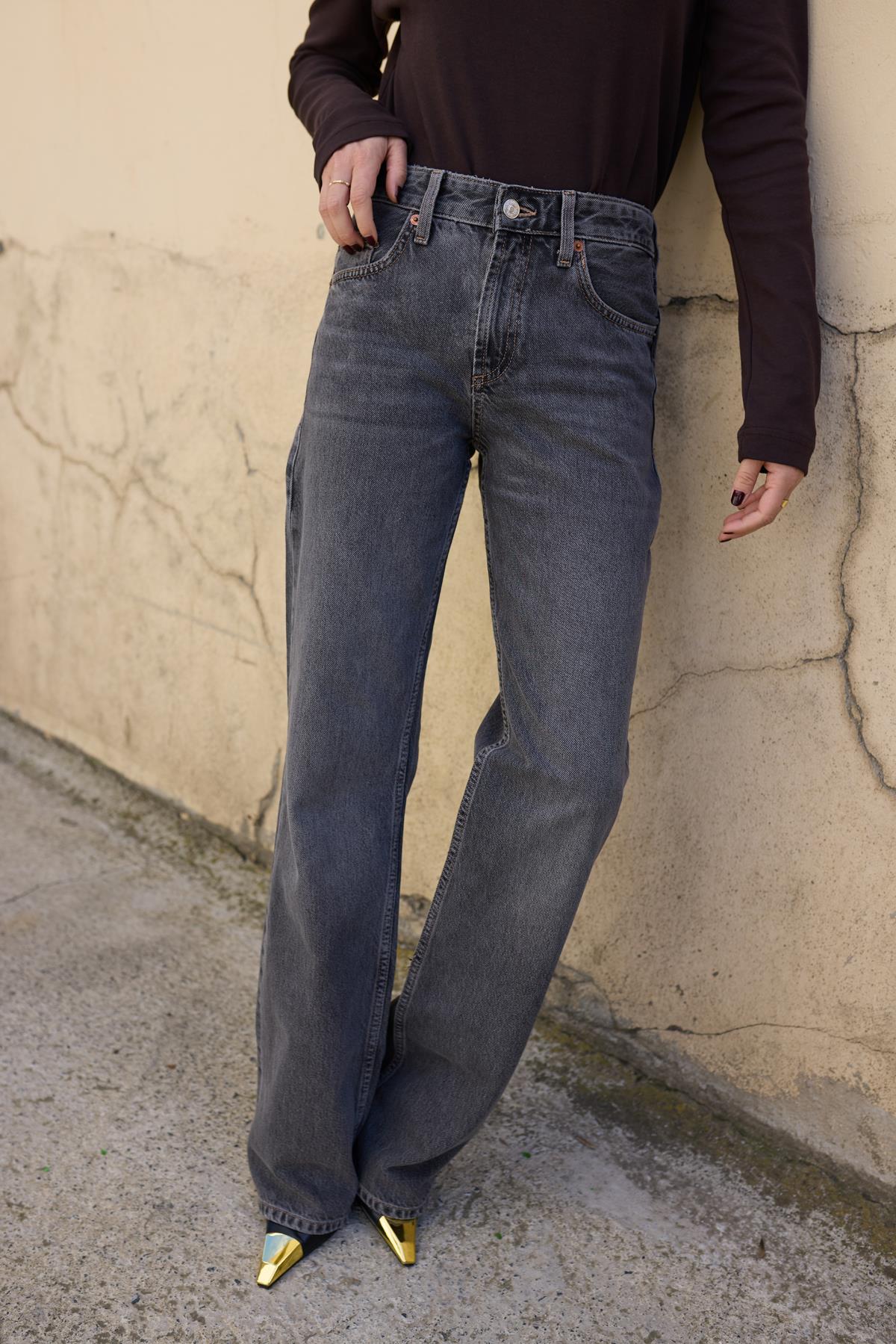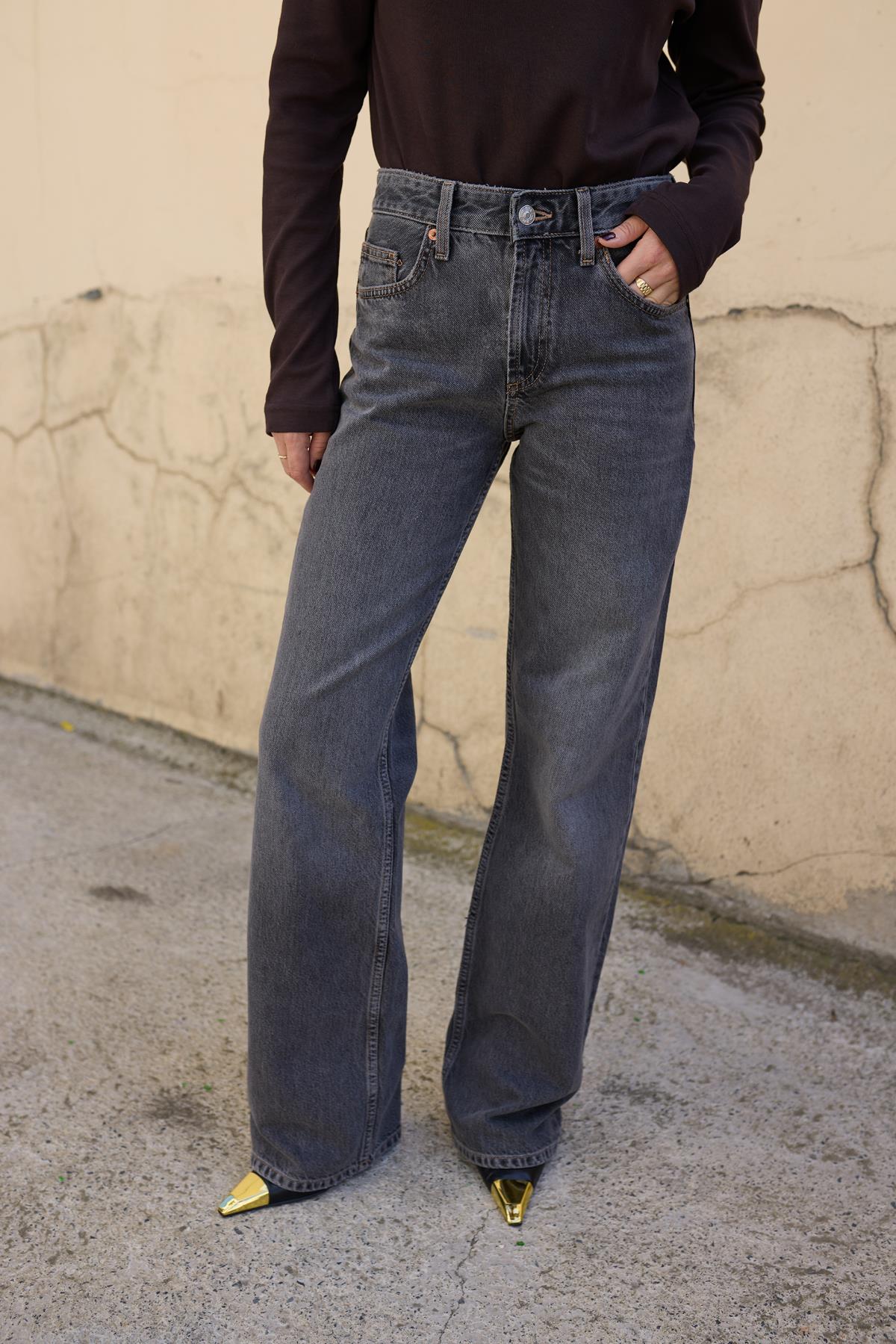 Gri Yüksek Bel Taşlamalı Denim Pantolon