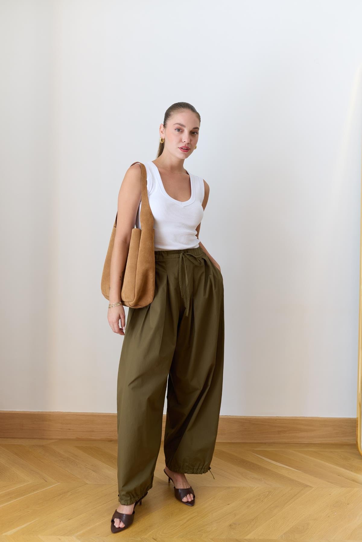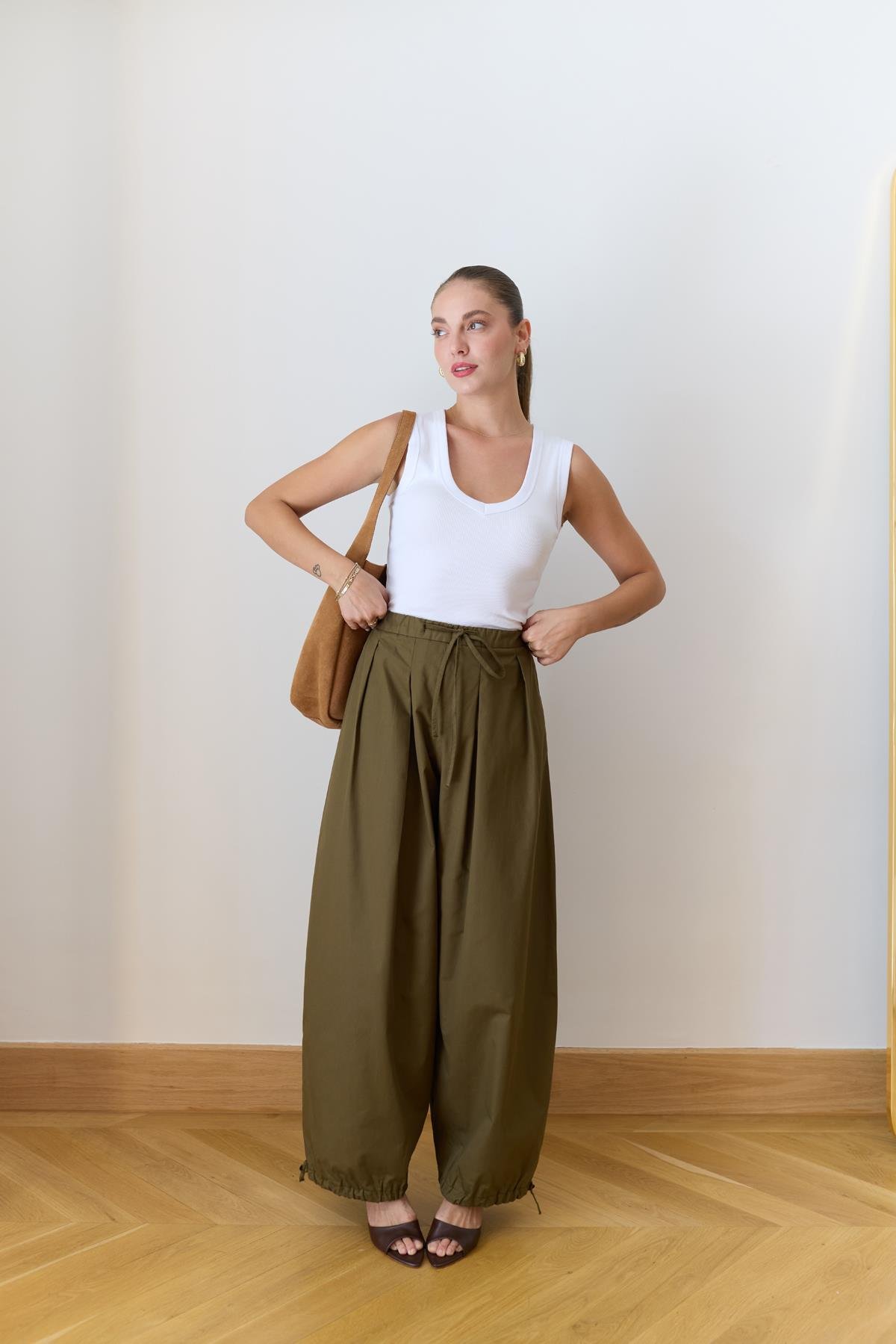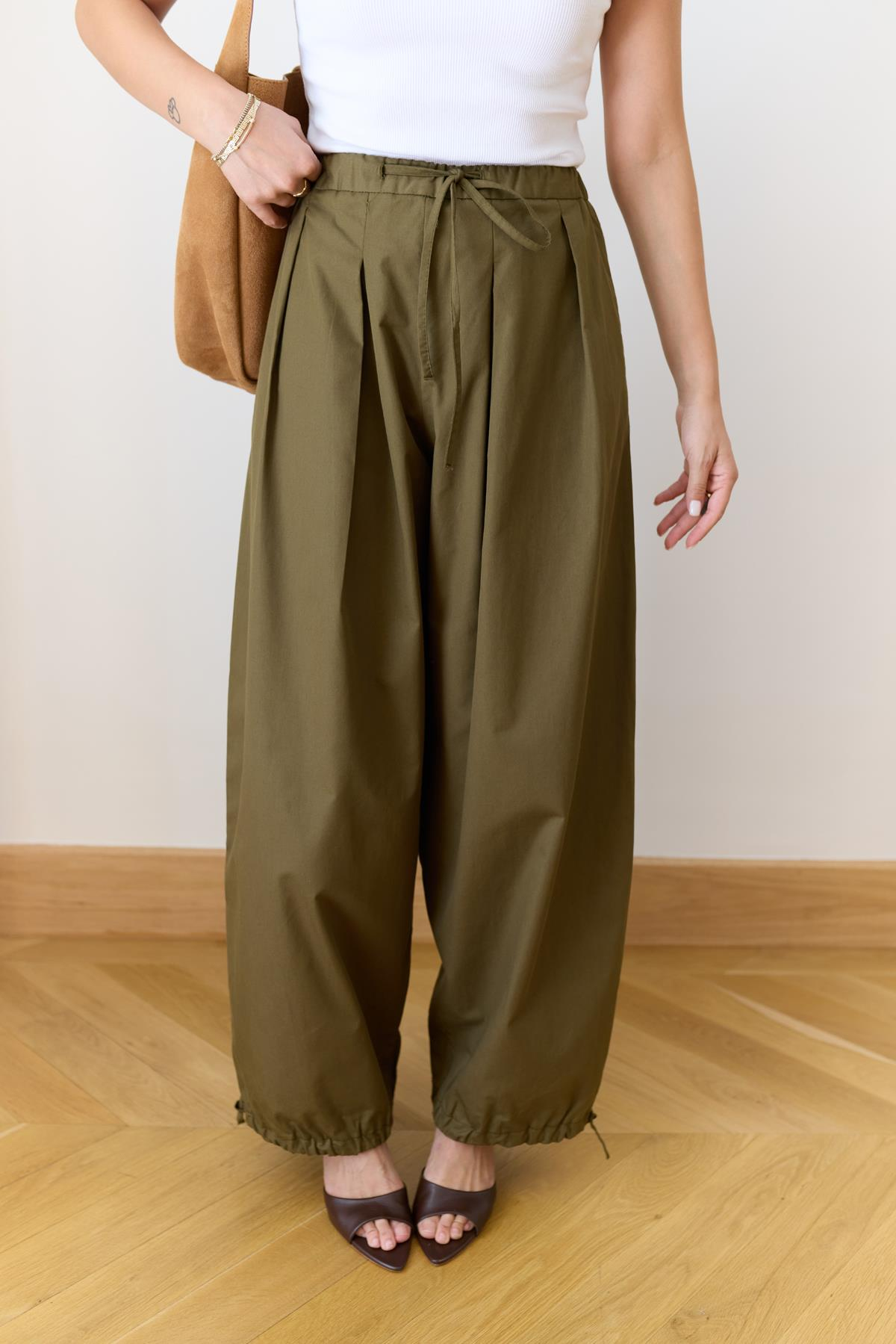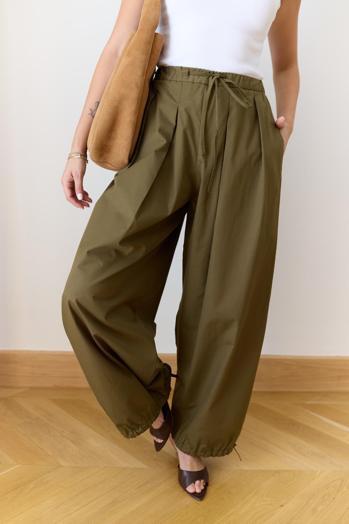 Haki Beli Lastikli Ve Kuşaklı Şalvar Pantolon (110-00749)