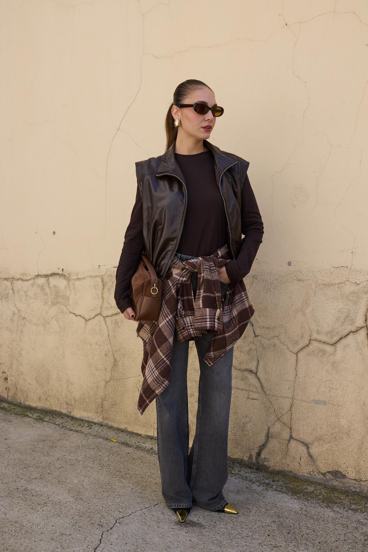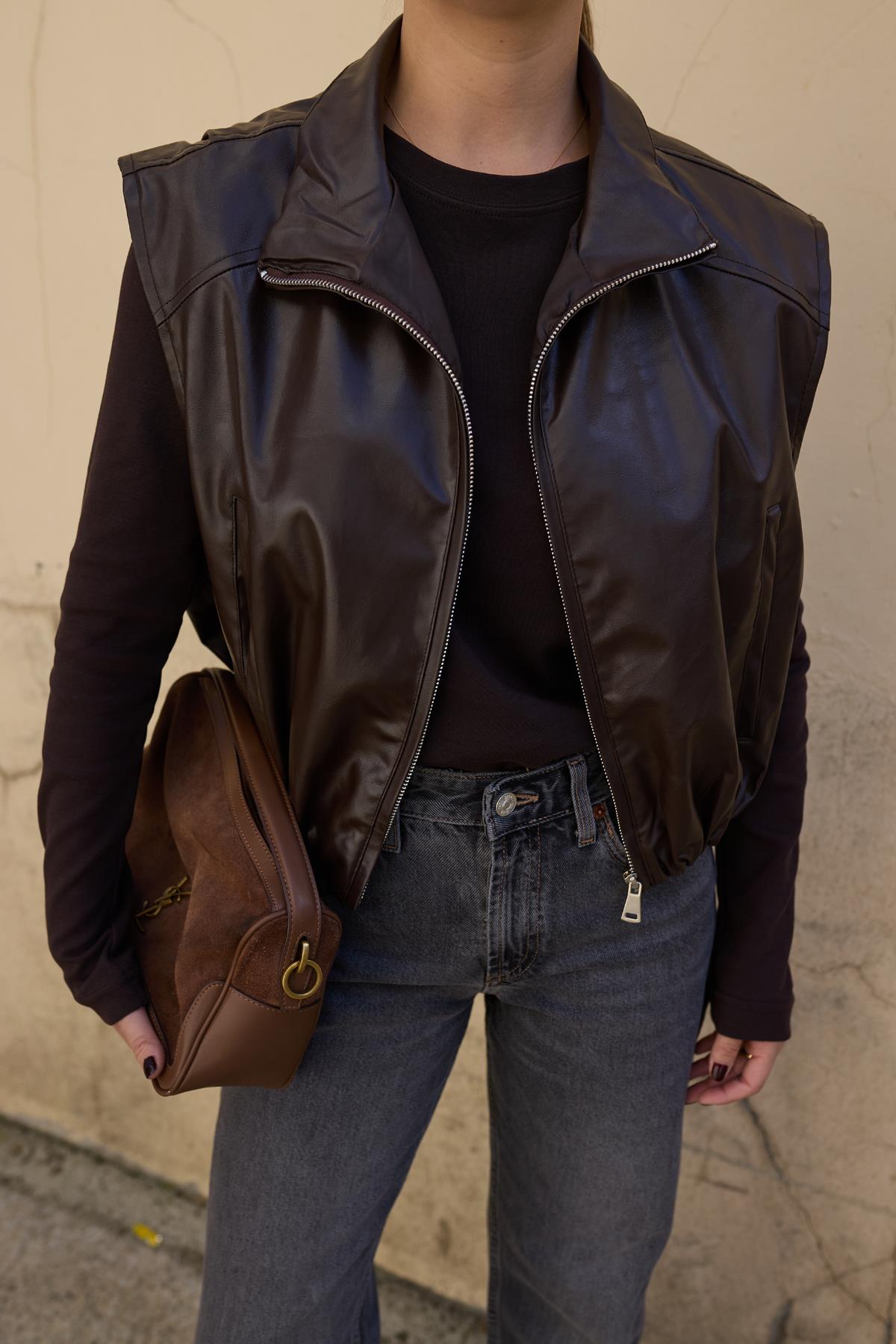 Kahve Beli Lastikli Deri Yelek (124-00216)