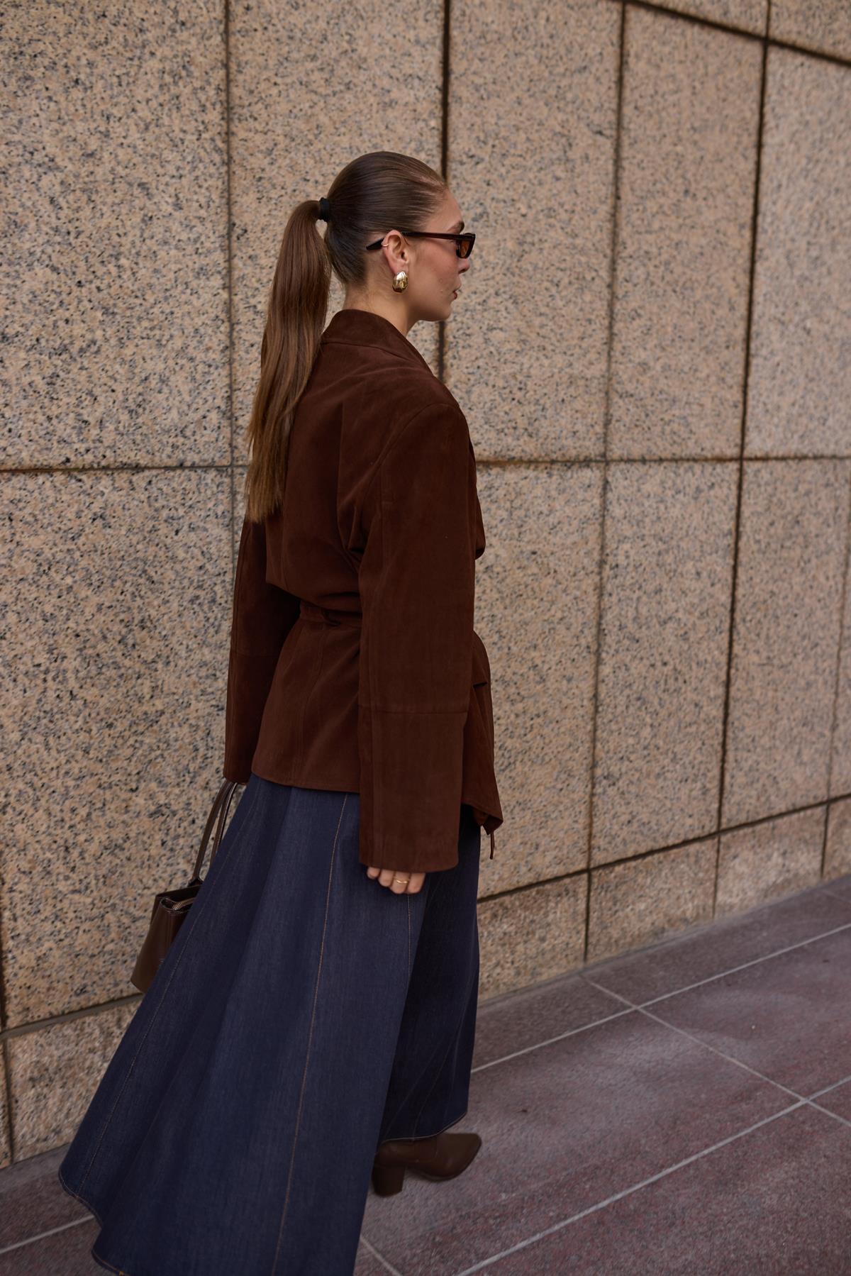 Kahve Önden Cep Detaylı Kuşaklı Süet Ceket