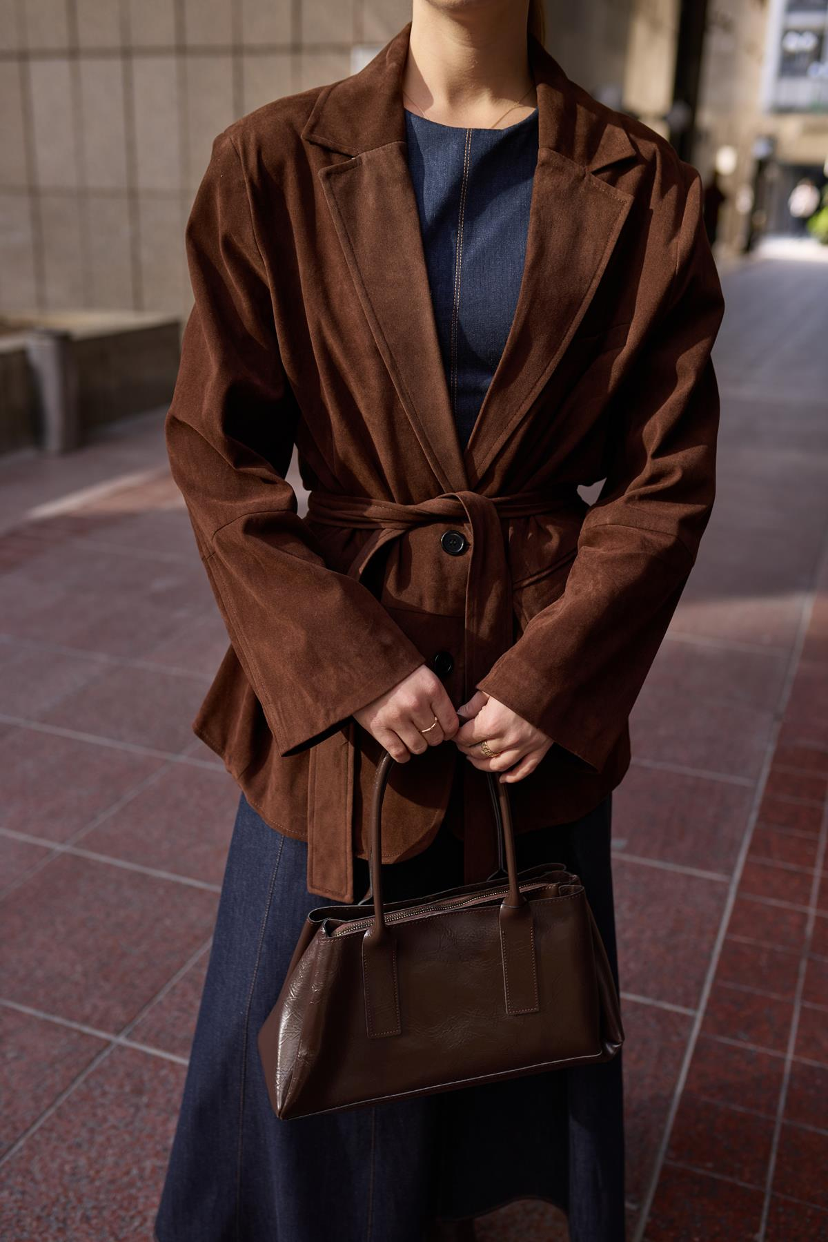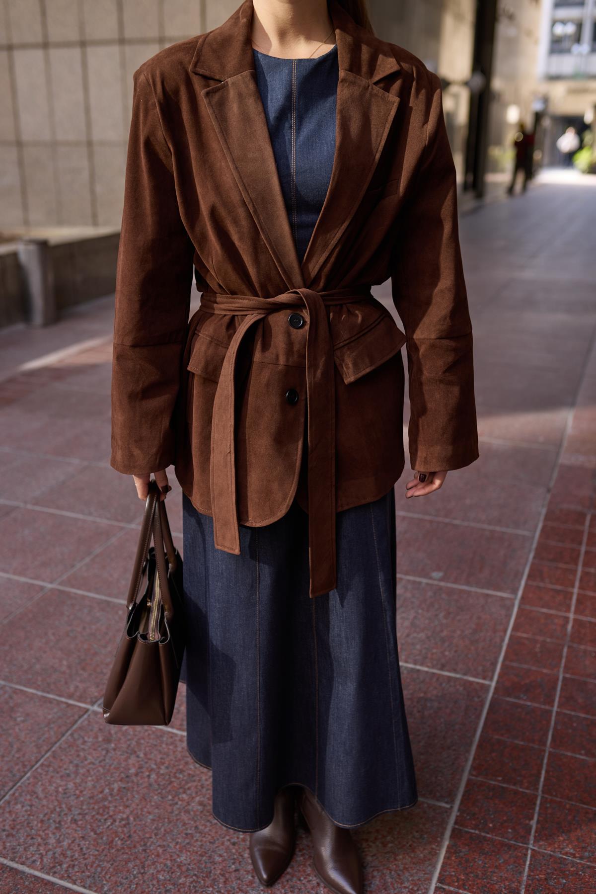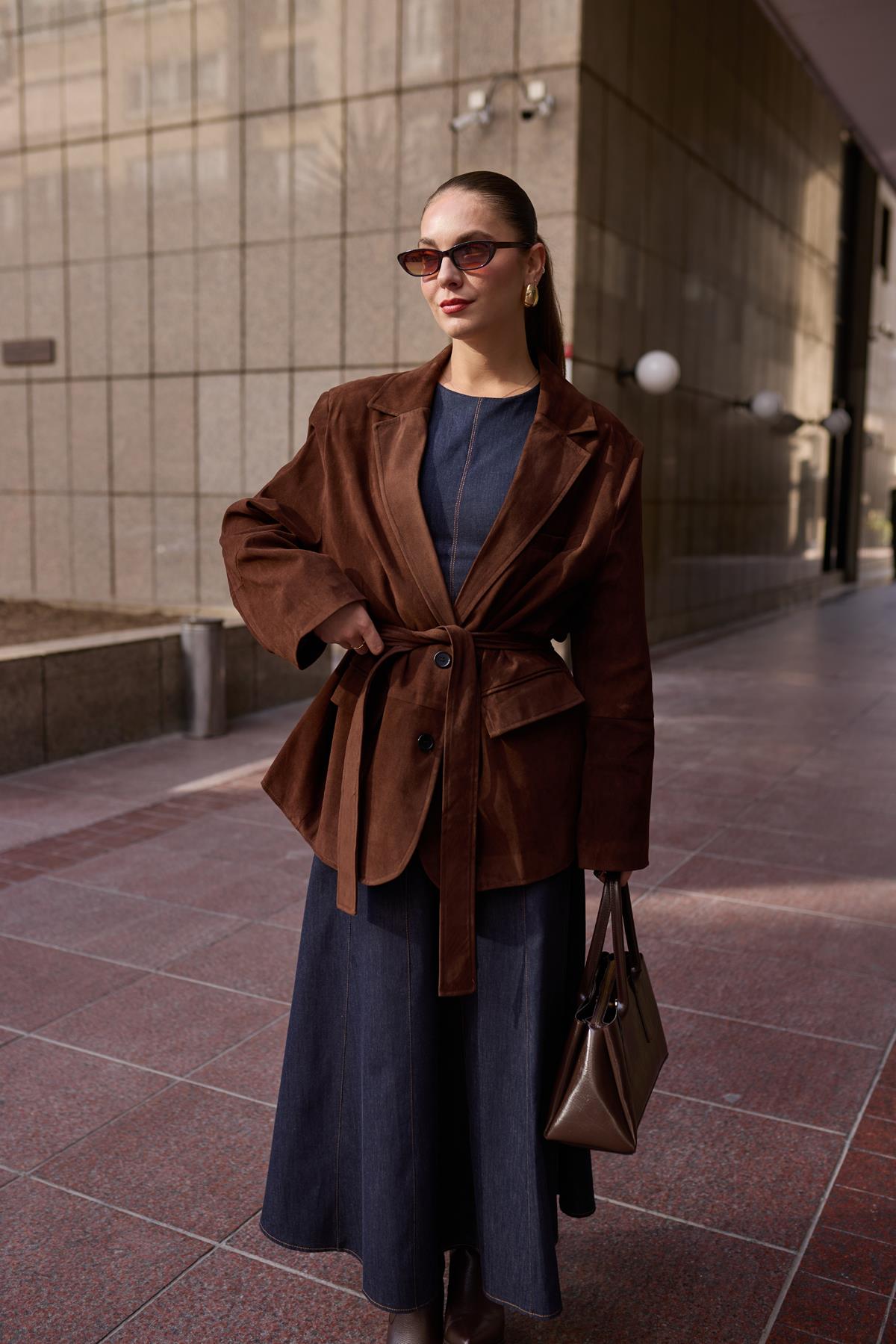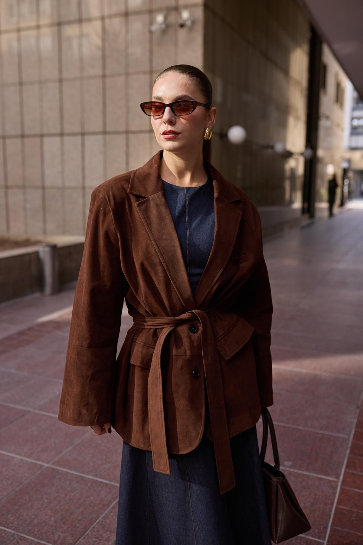 Kahve Önden Cep Detaylı Kuşaklı Süet Ceket (115-00640)