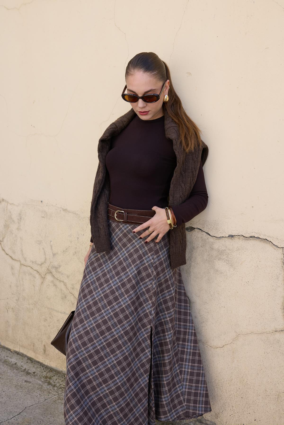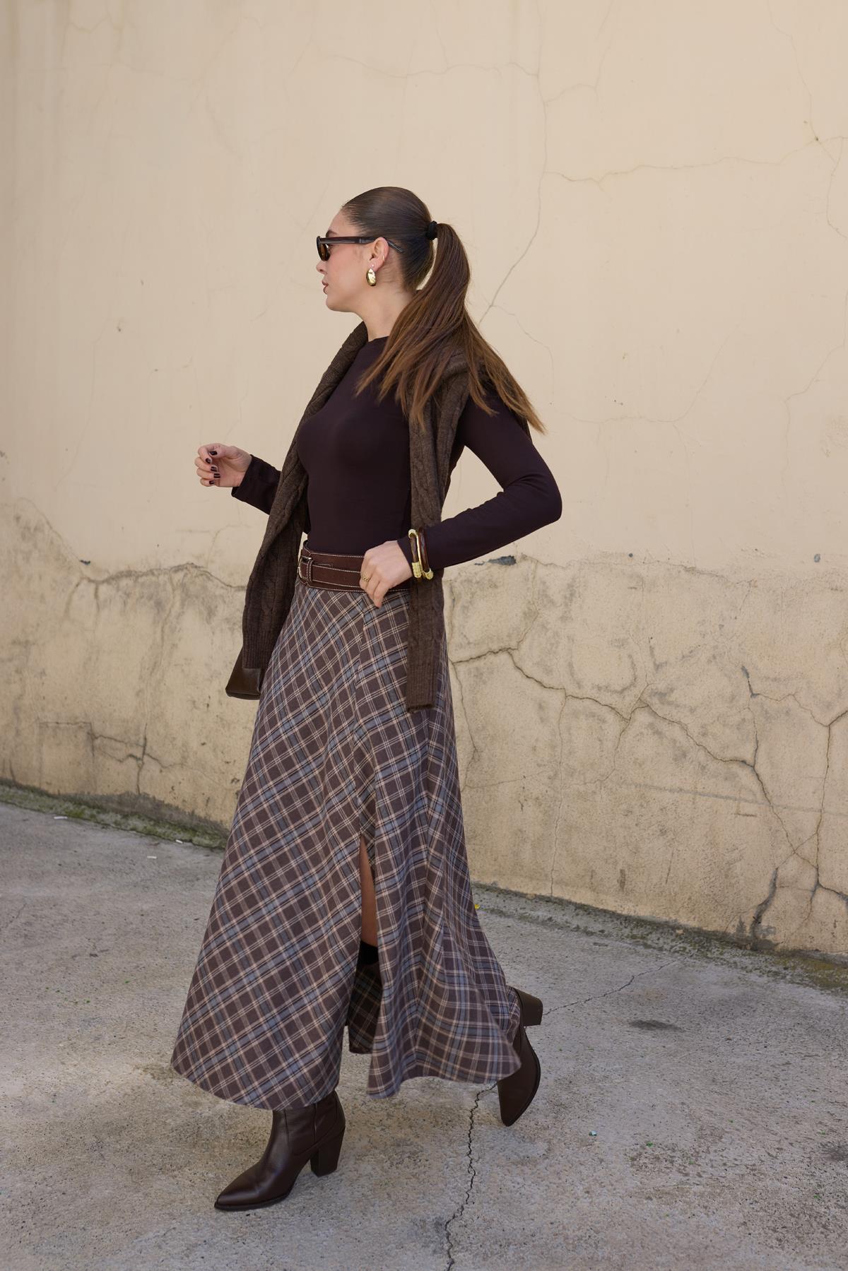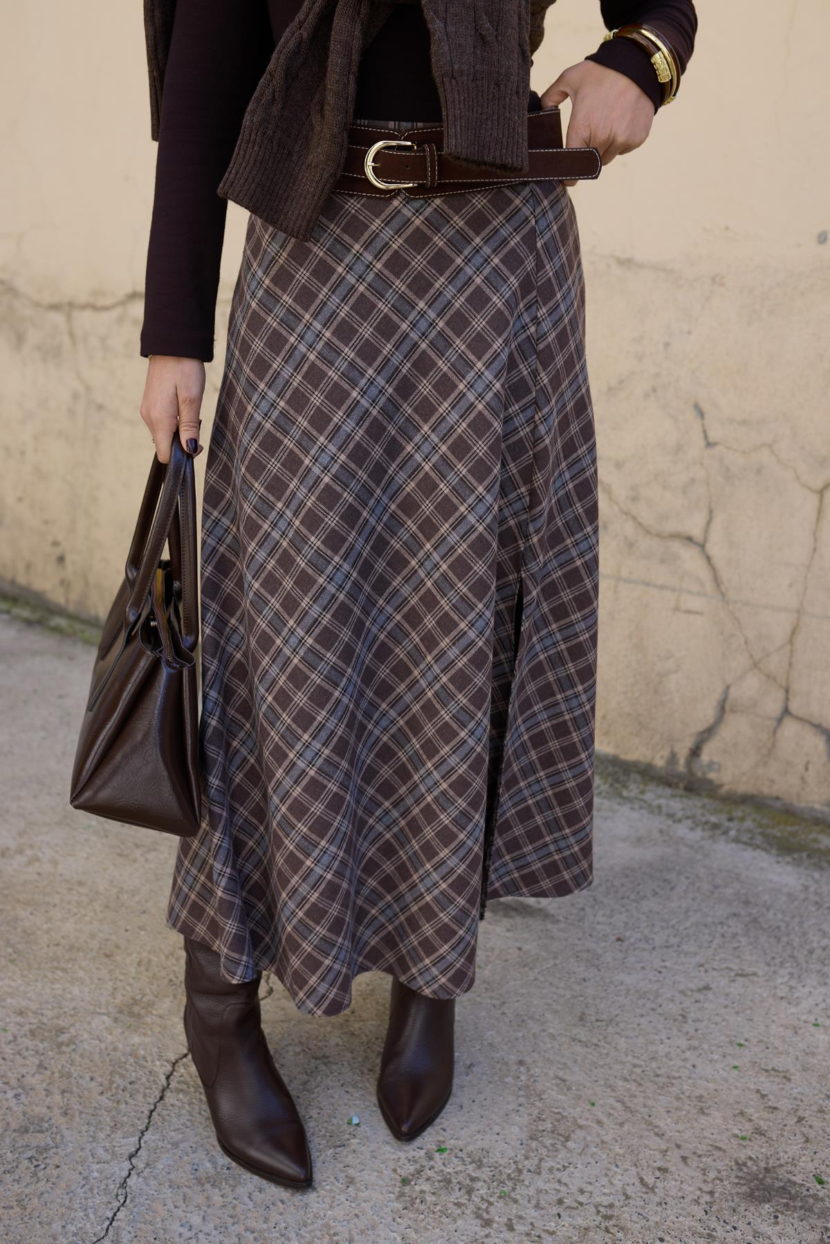Kahve Önden Yırtmaç Detaylı Kemerli Ekoseli Etek (109-00474)