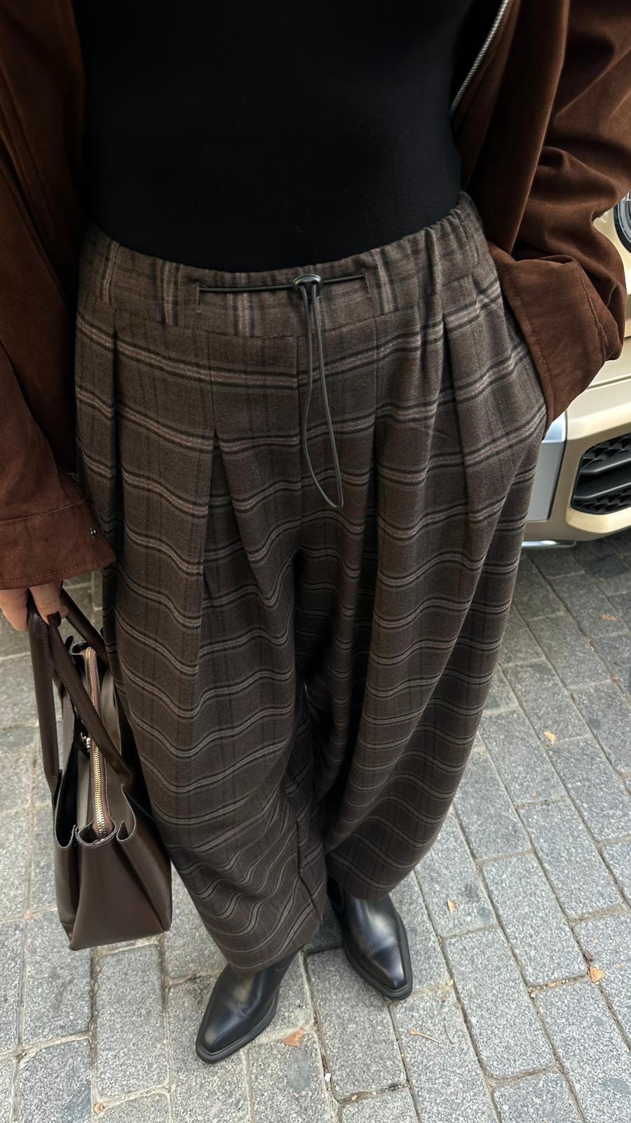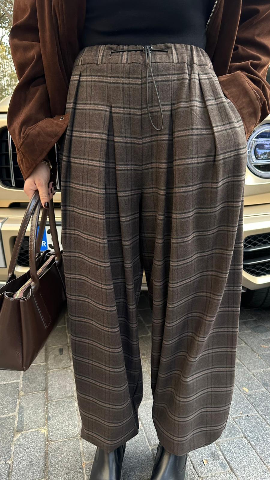Kahve Paçası Ve Beli Büzgülü Ekoseli Pantolon (110-00765)