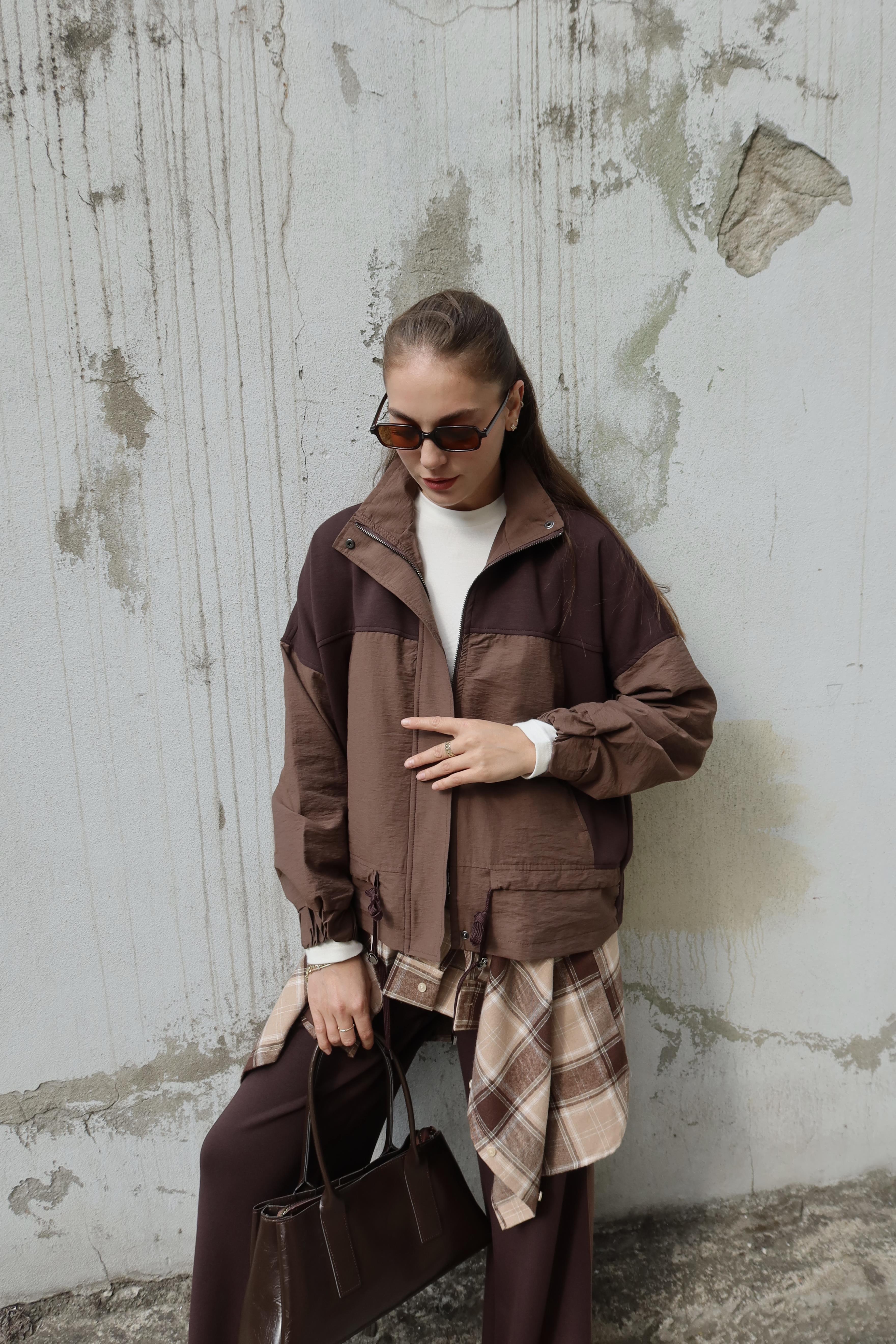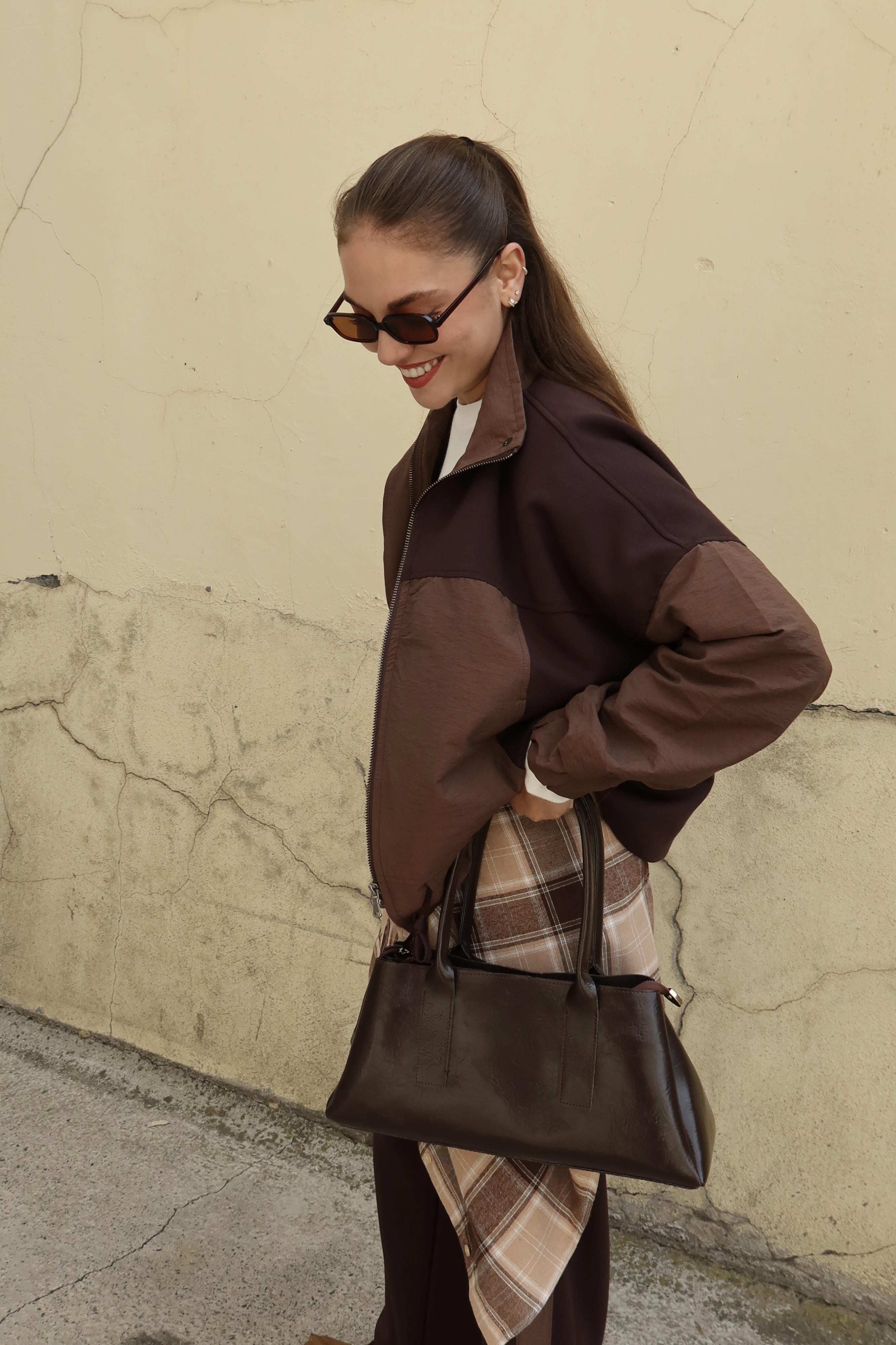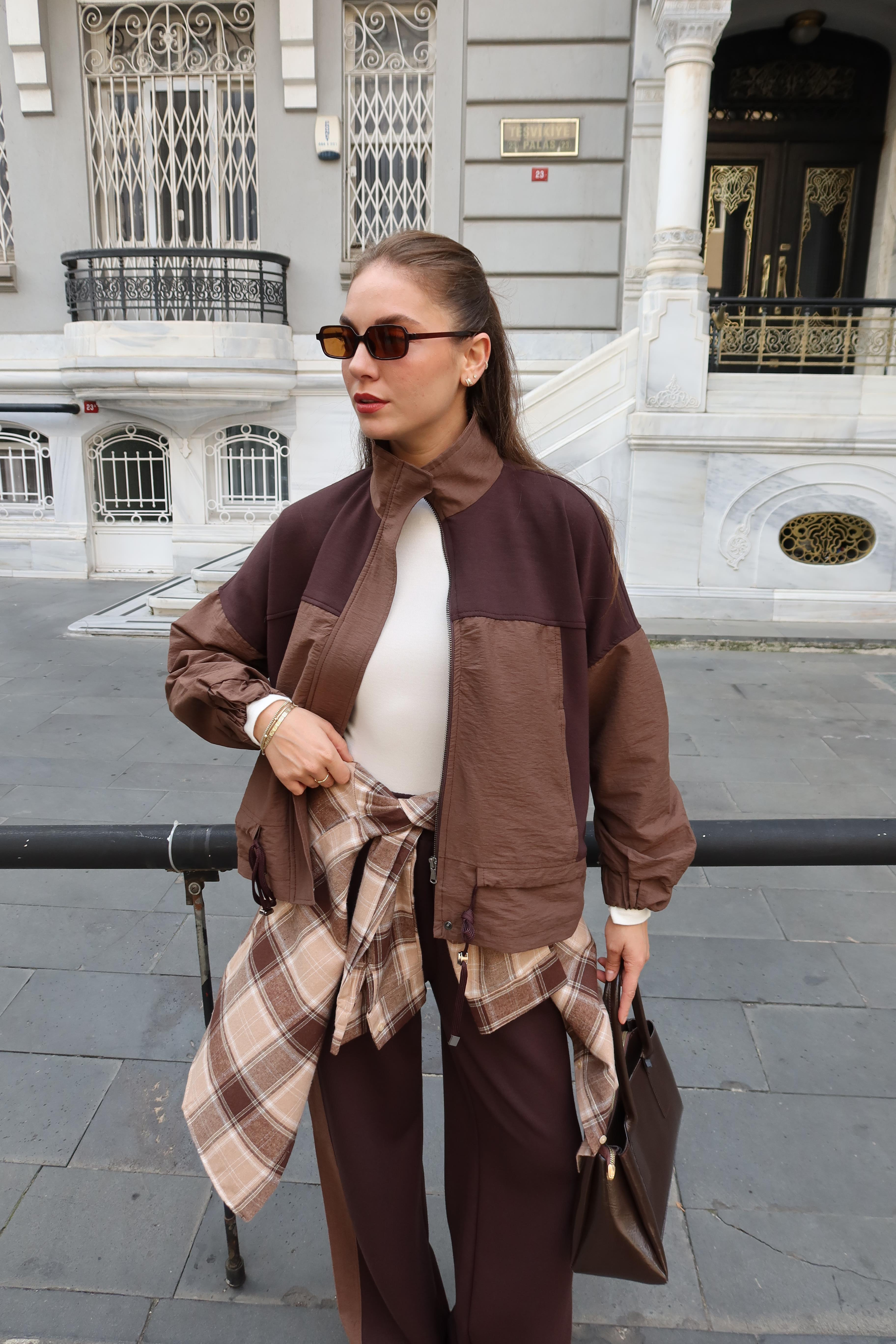 Kahve Parça Detaylı Fermuarlı Ve Çıt Çıtlı Sweat Eşofman Takım