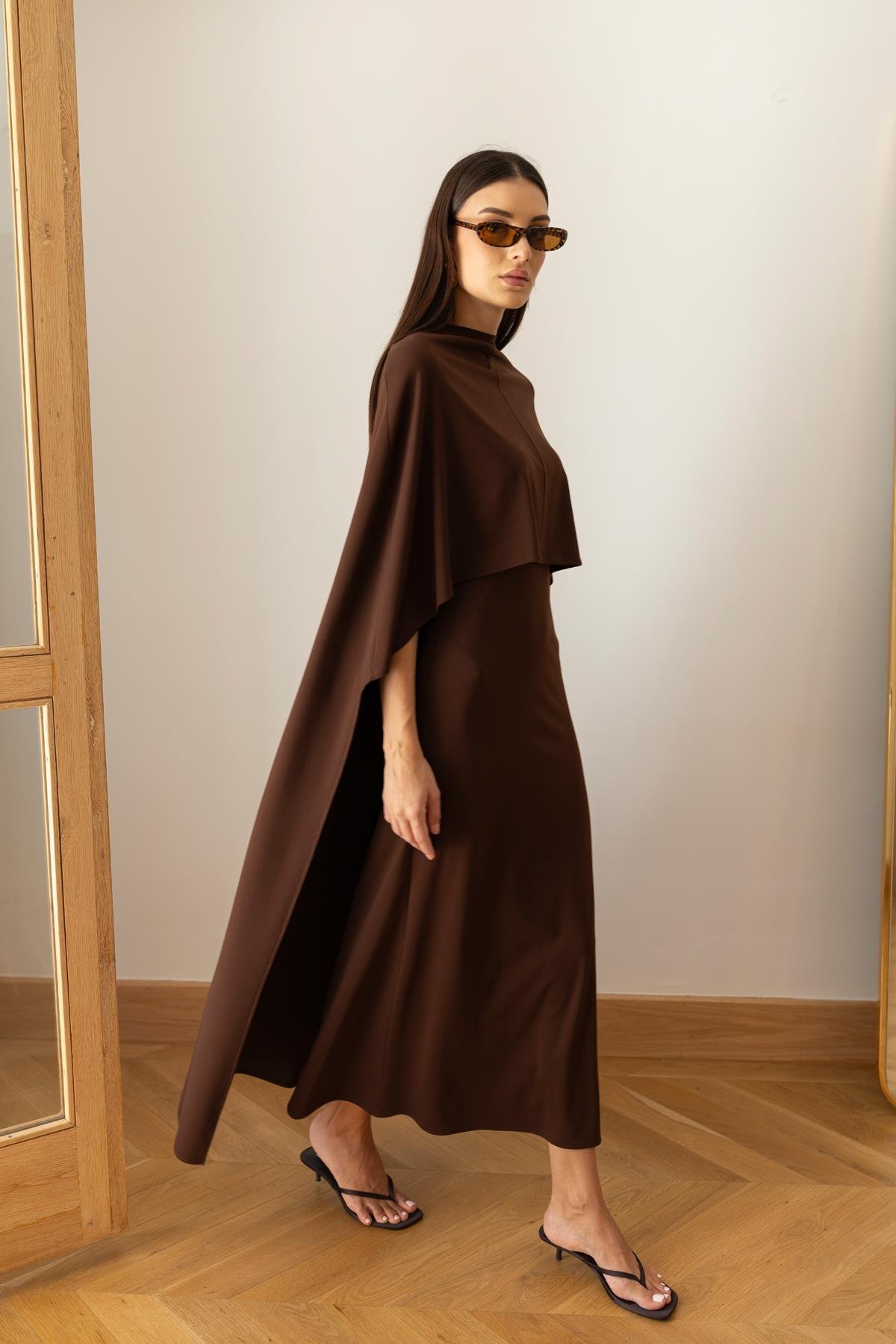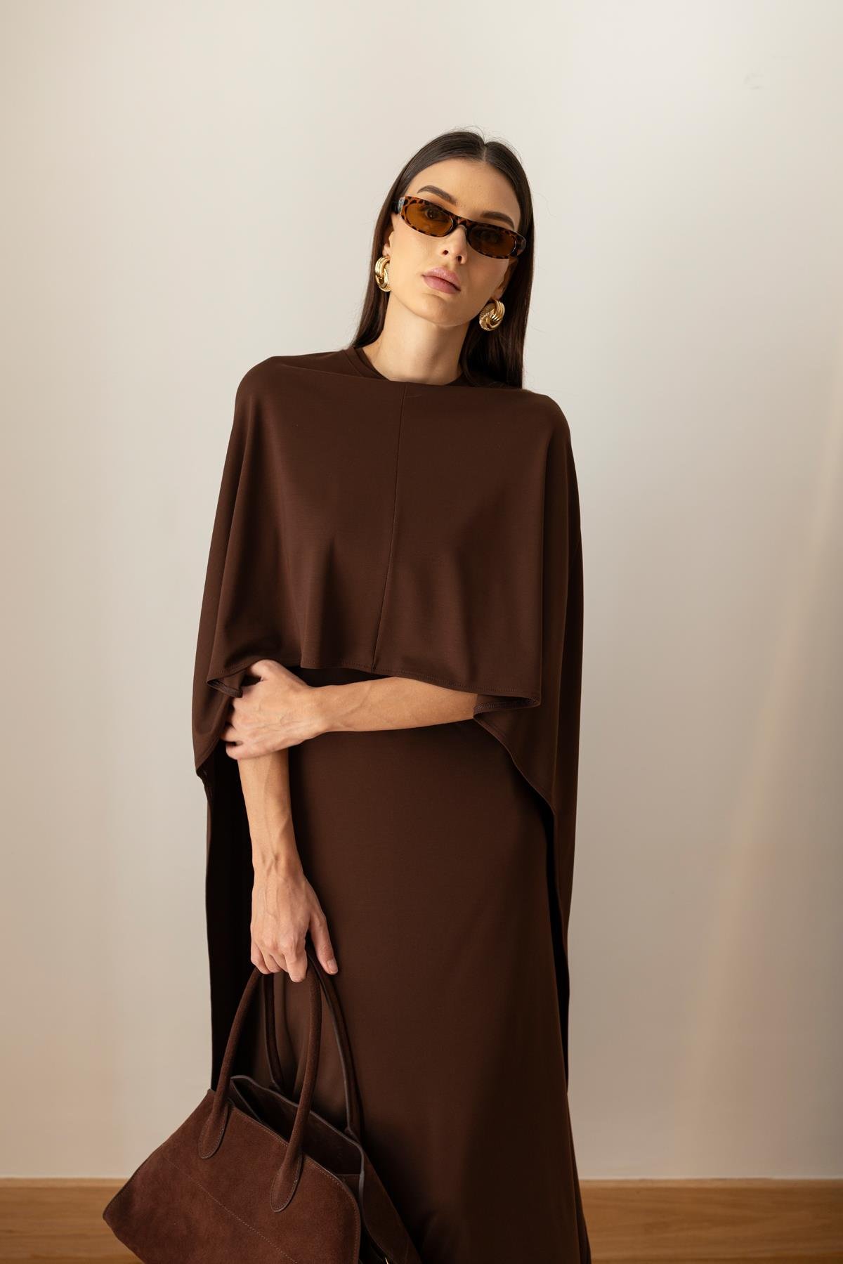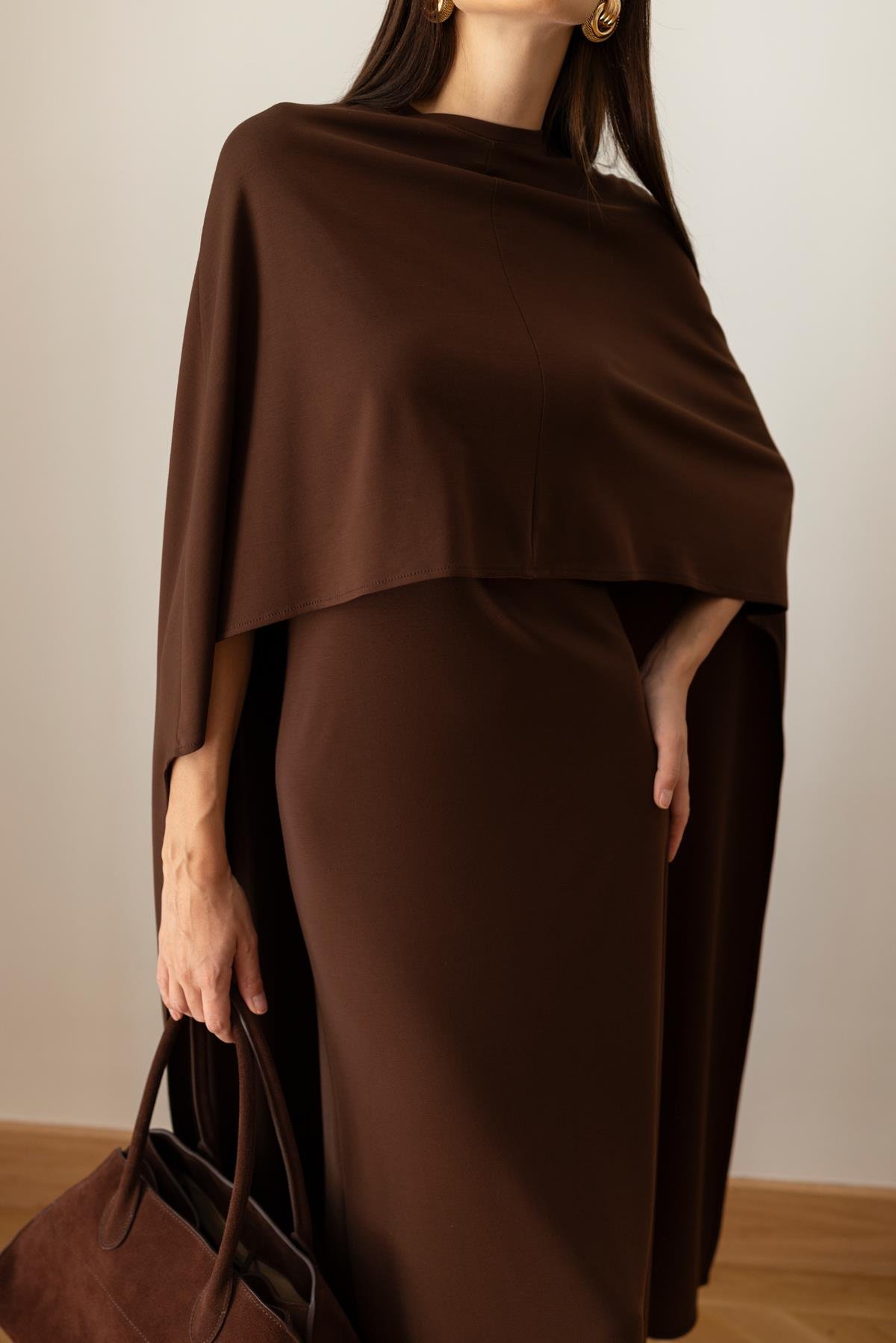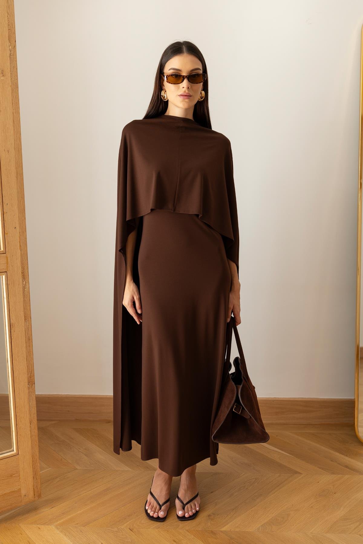 Kahve Pelerin Detaylı Bisiklet Yaka Kısa Koll Elbise (101-01803)