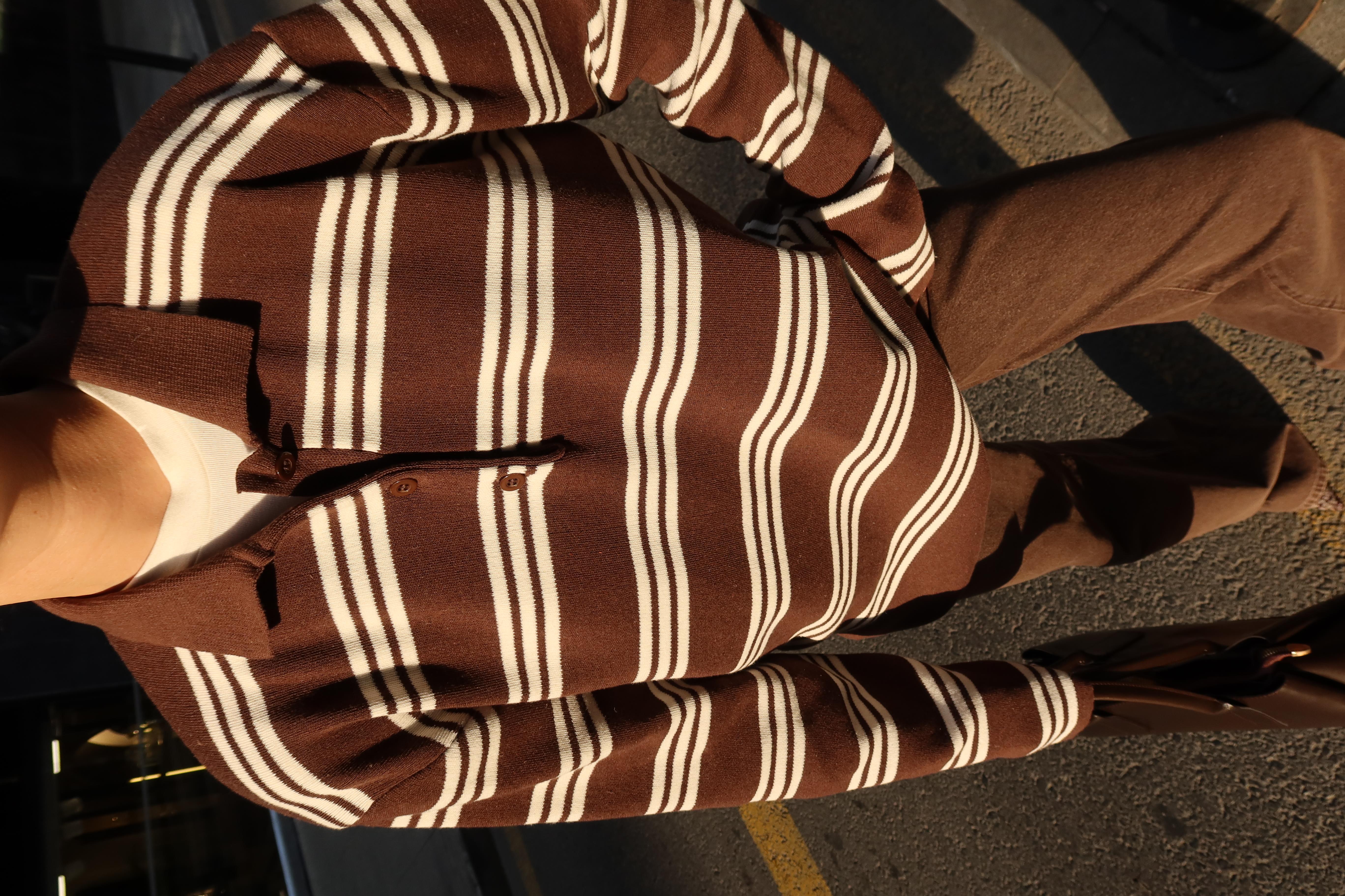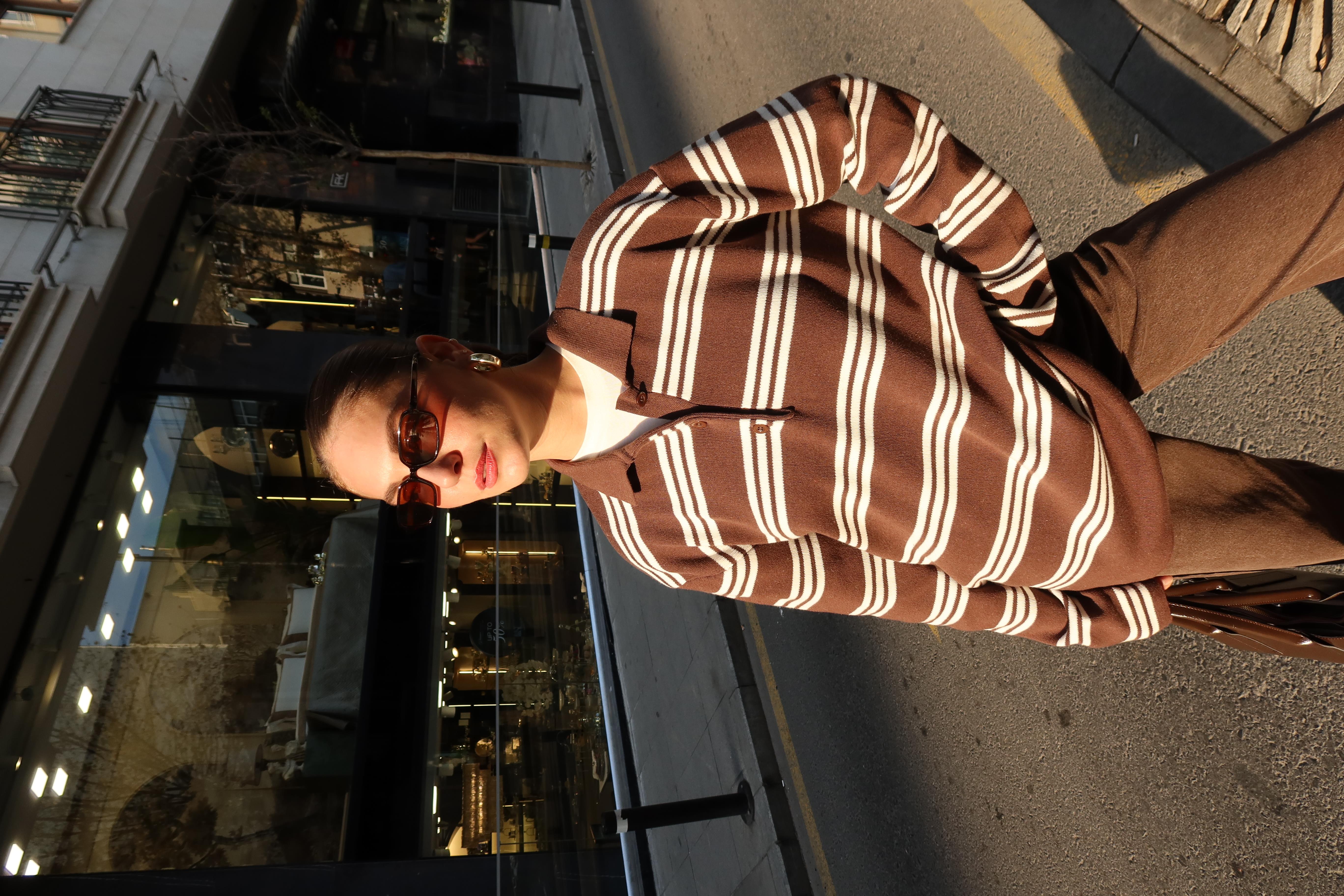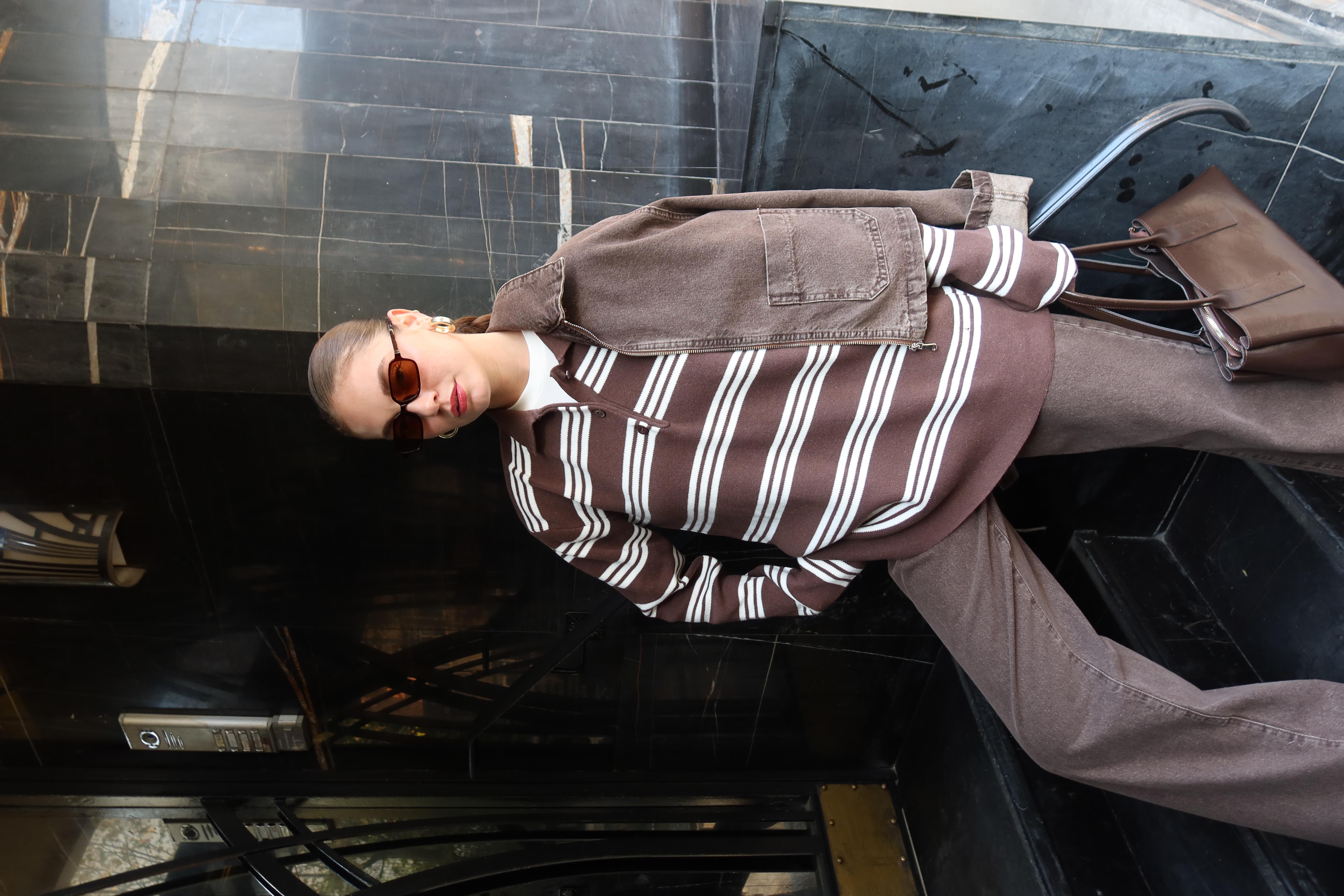 Ekru Polo Yaka Çizgili Oversize Triko Kahve Polo Yaka Çizgili Oversize Triko