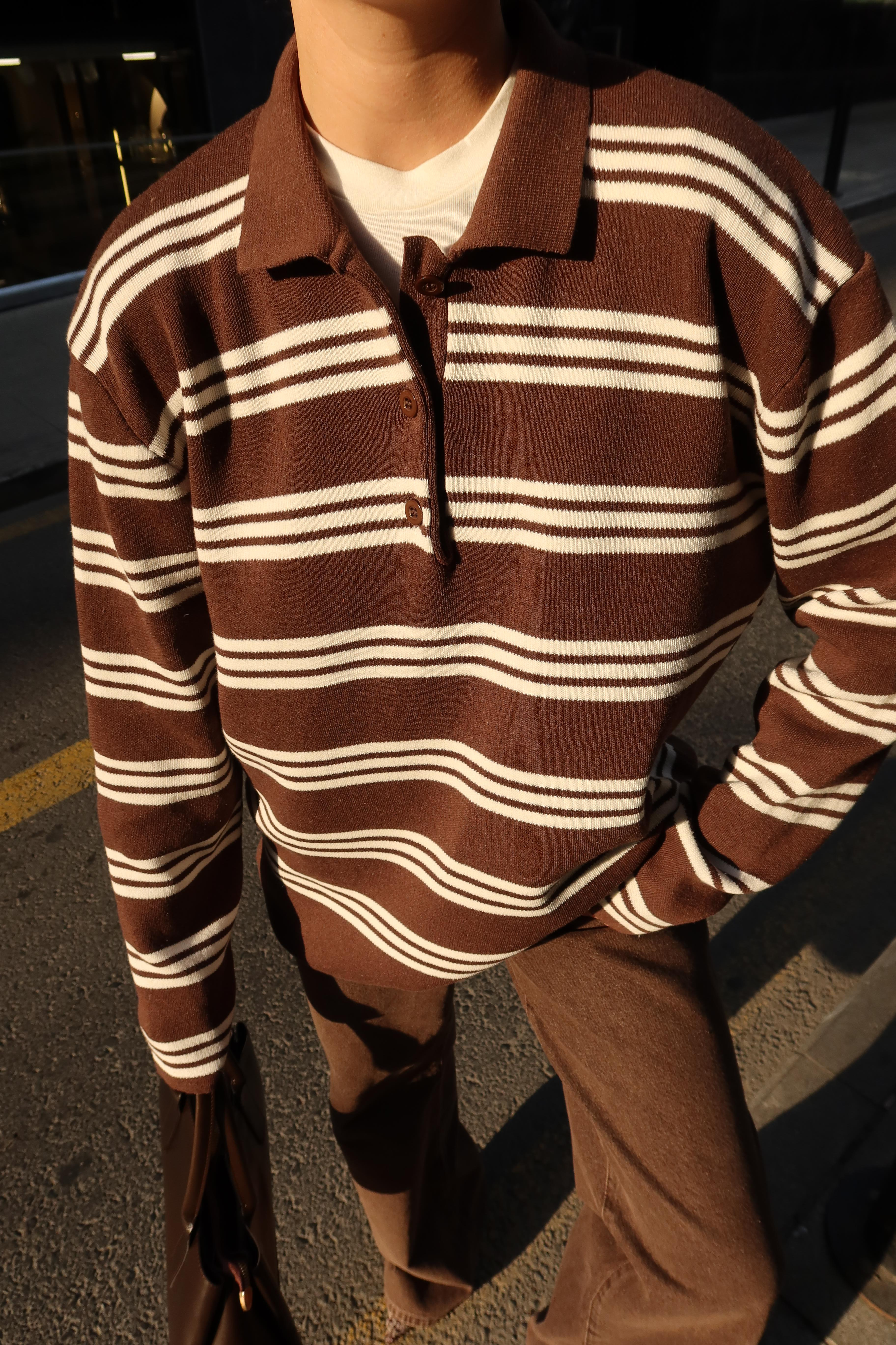 Kahve Polo Yaka Çizgili Oversize Triko (108-00717)