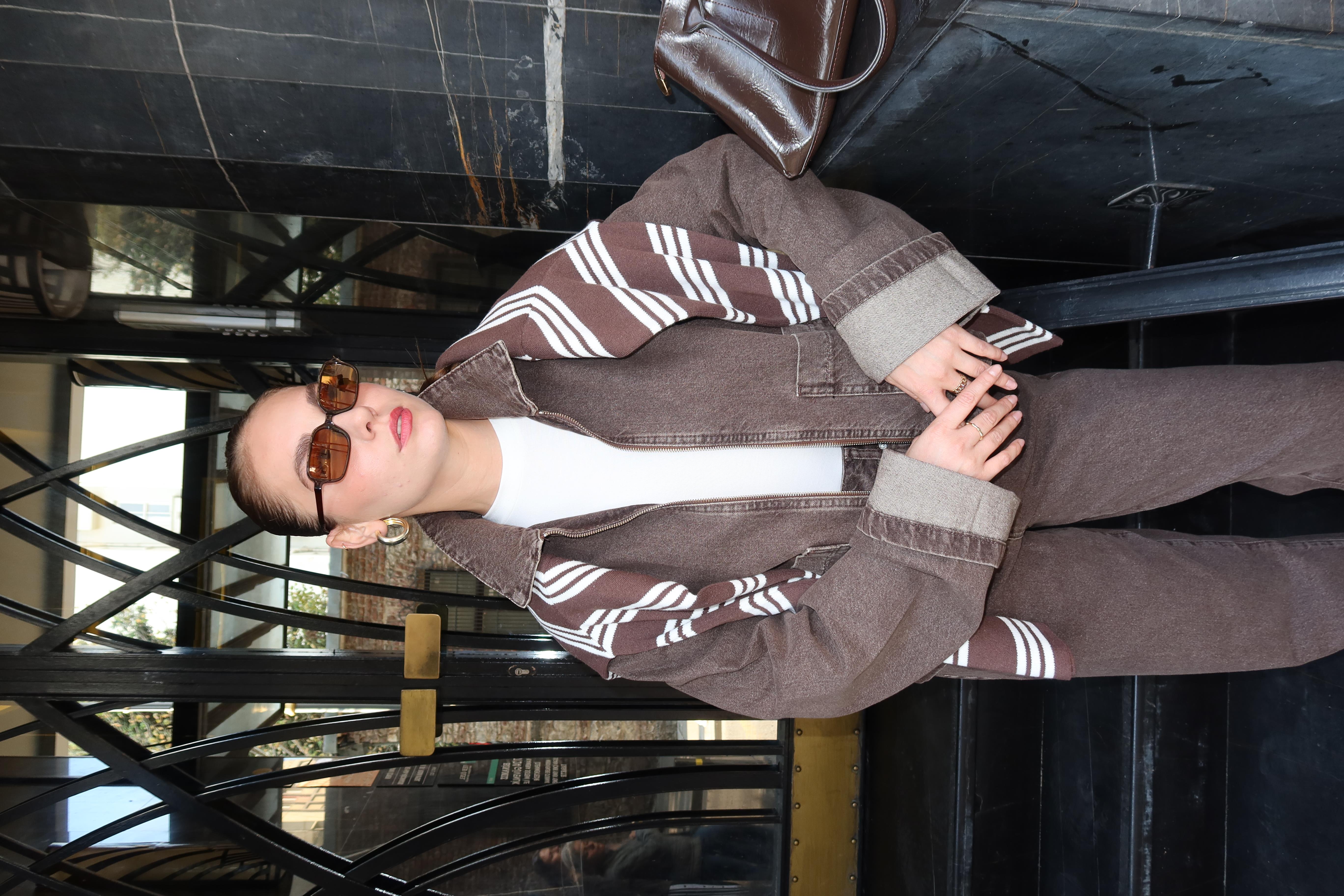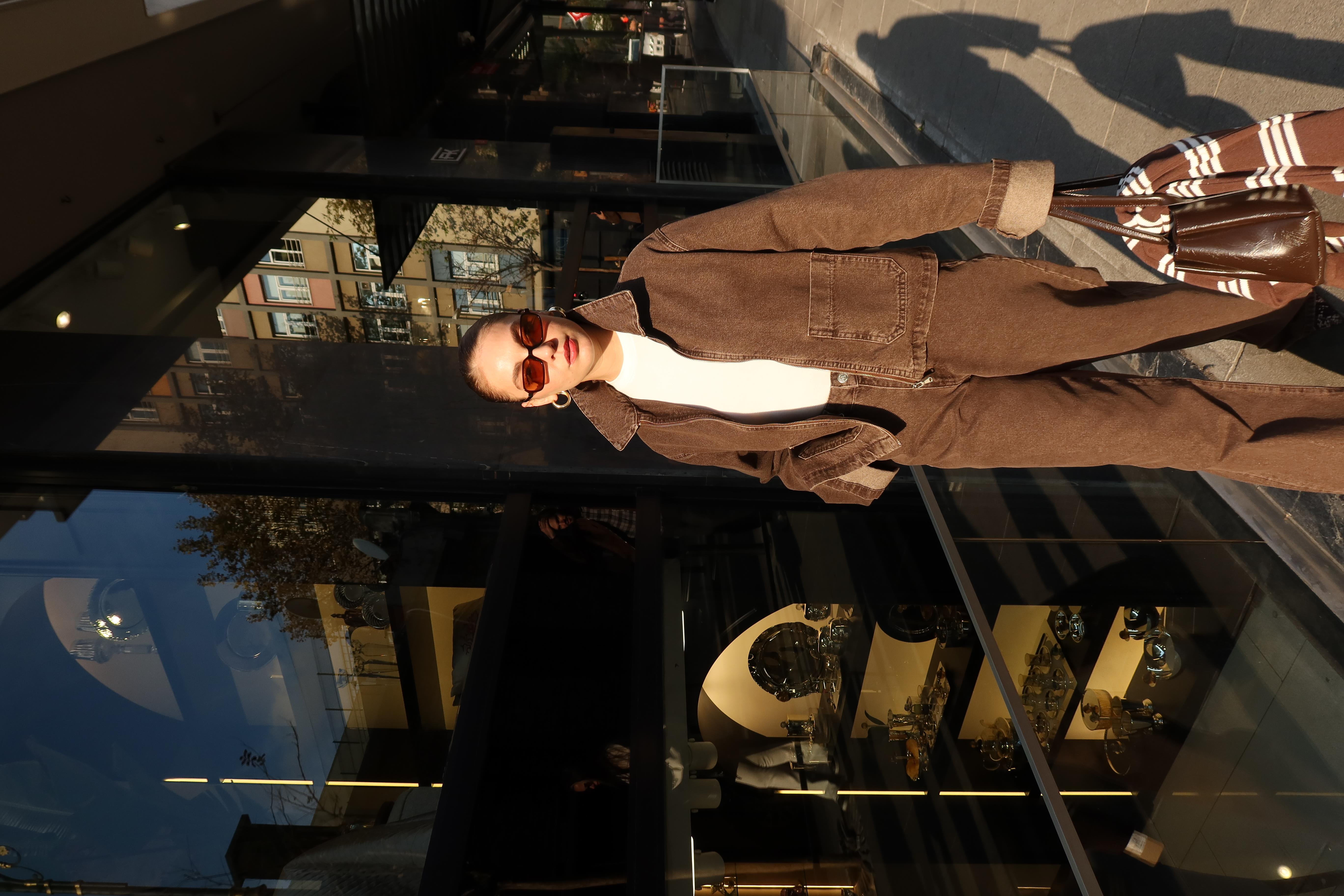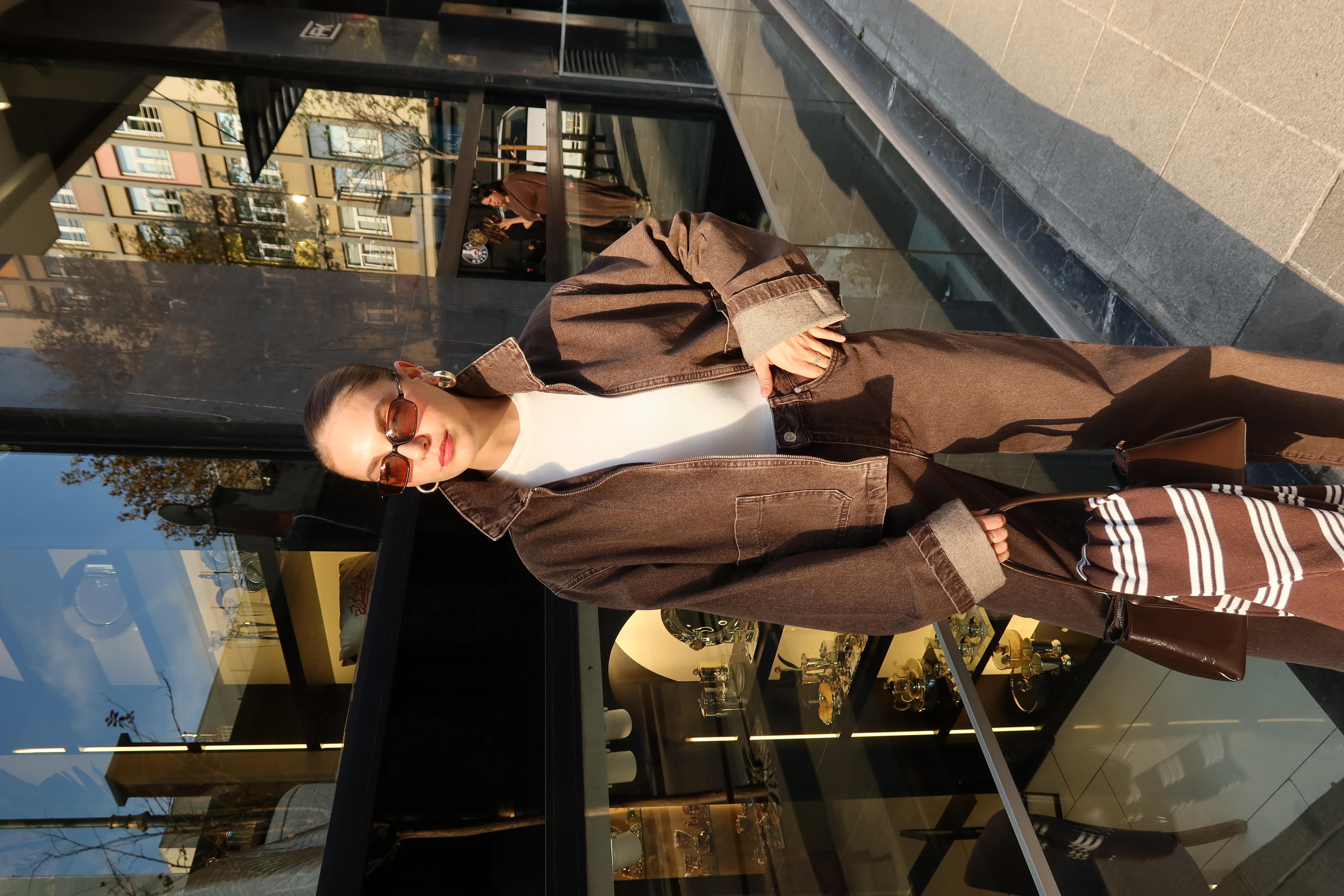 Kahve Polo Yaka Fermuarlı Önden Cepli Denim Ceket