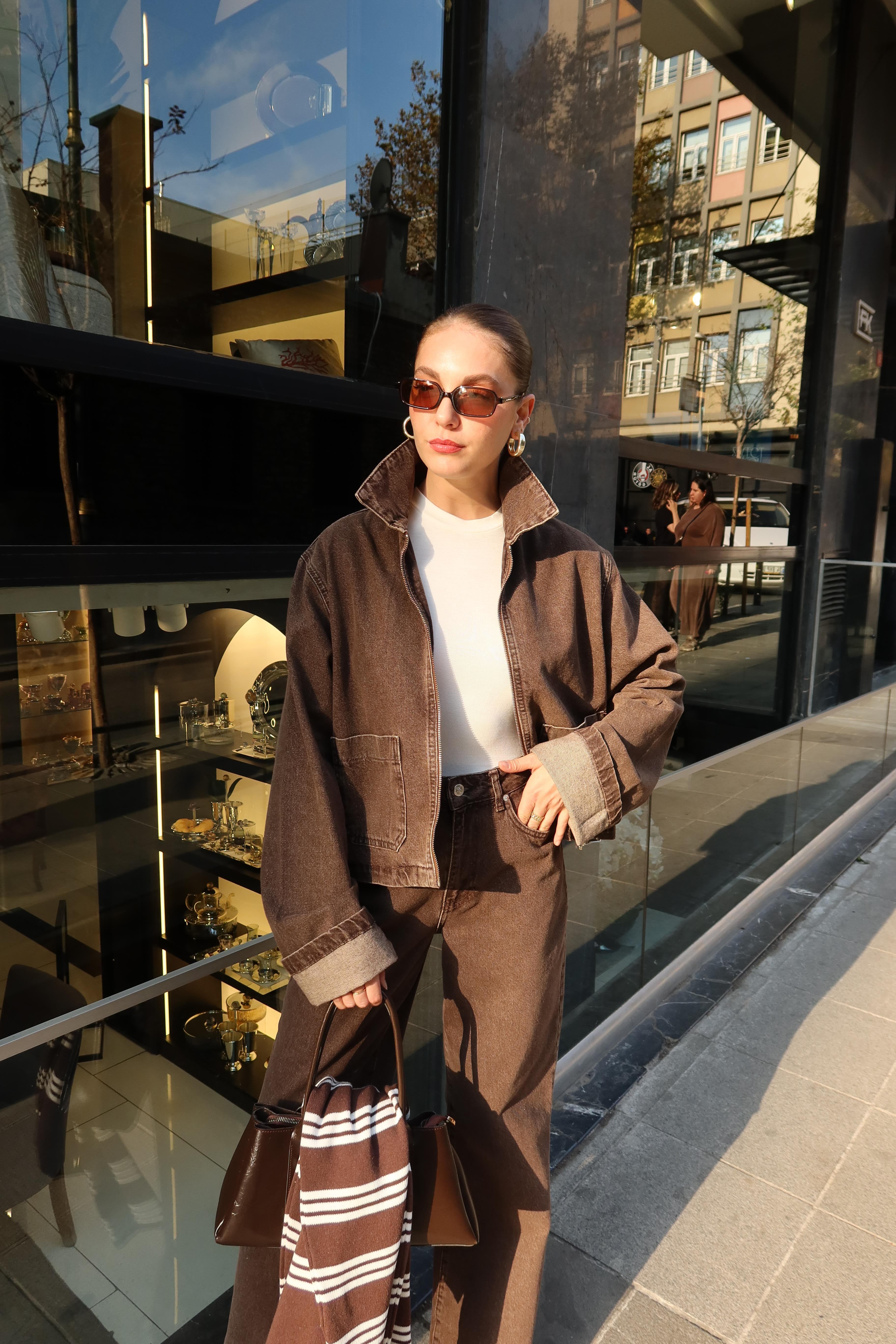 Kahve Polo Yaka Fermuarlı Önden Cepli Denim Ceket (115-00639)