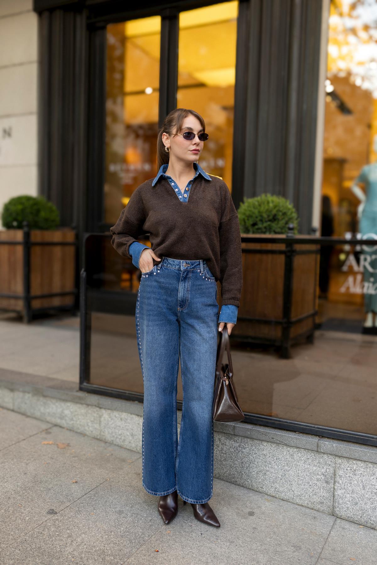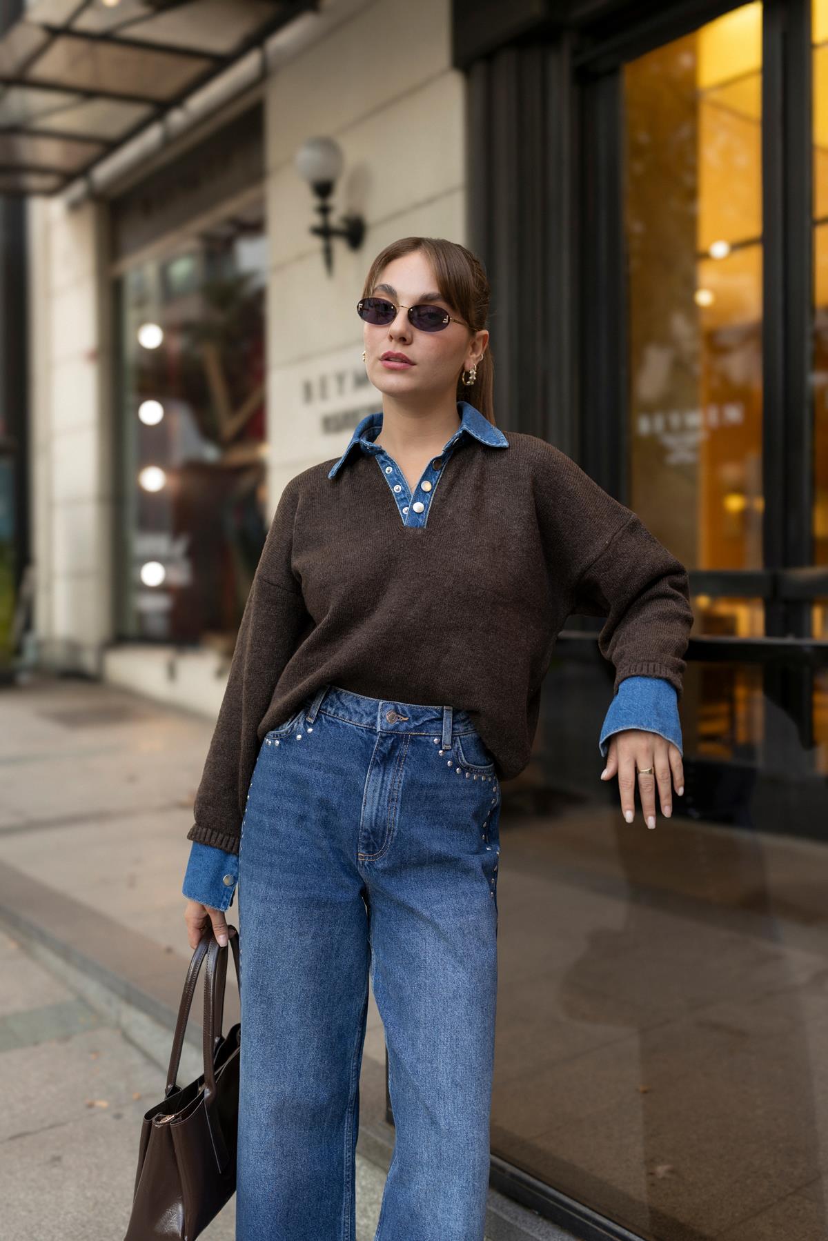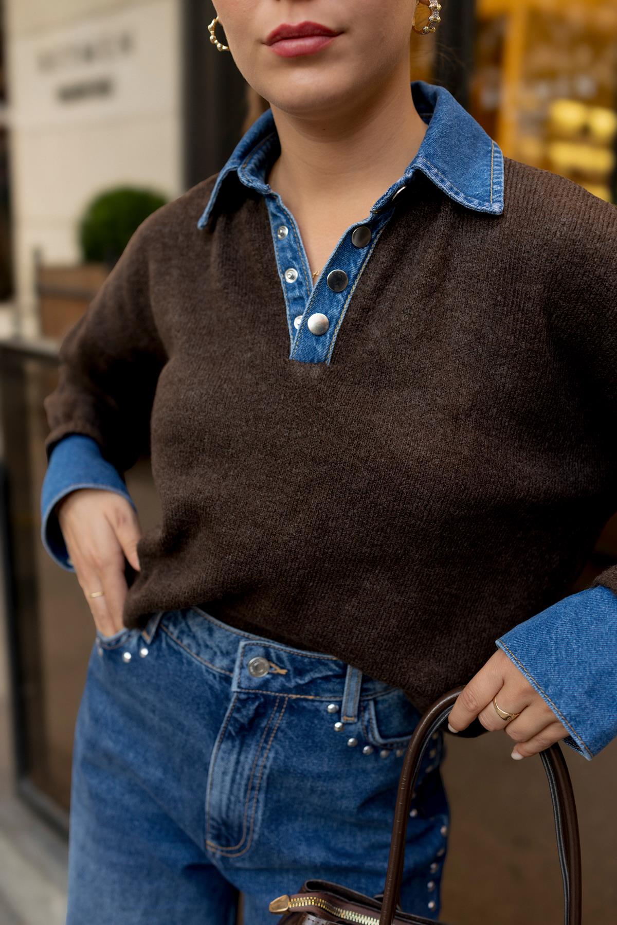 Kahve Polo Yaka Parça Denim Detyalı Triko (108-00712)