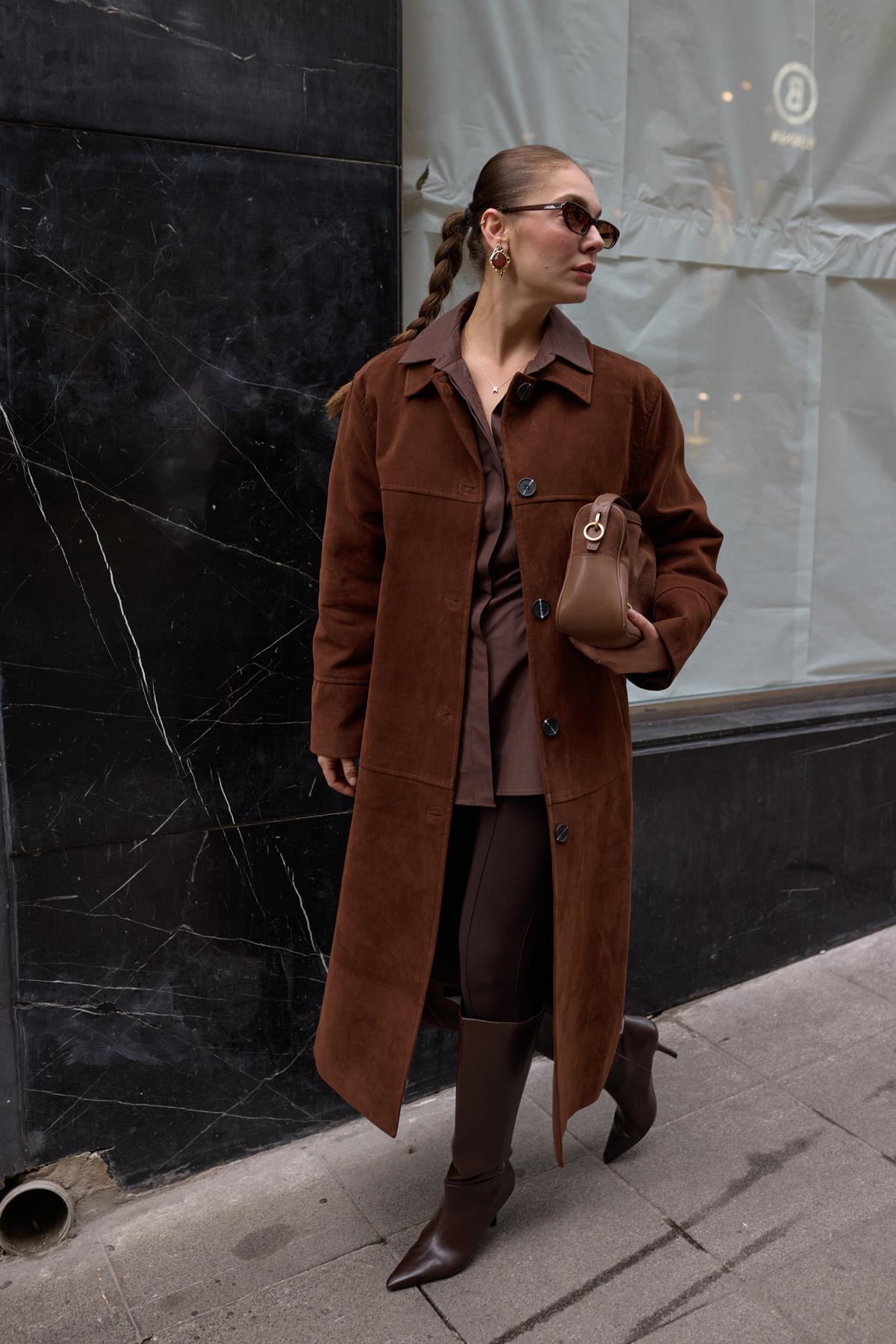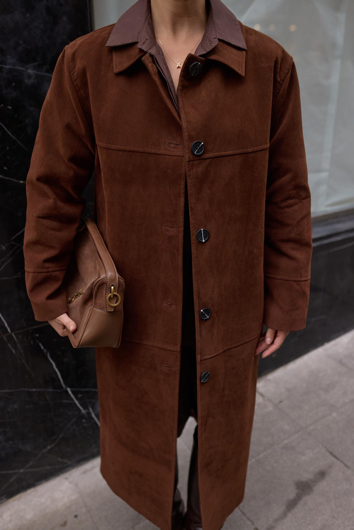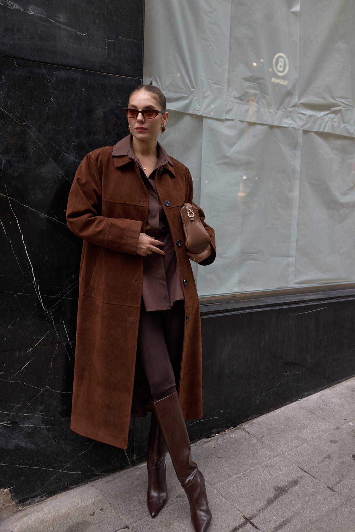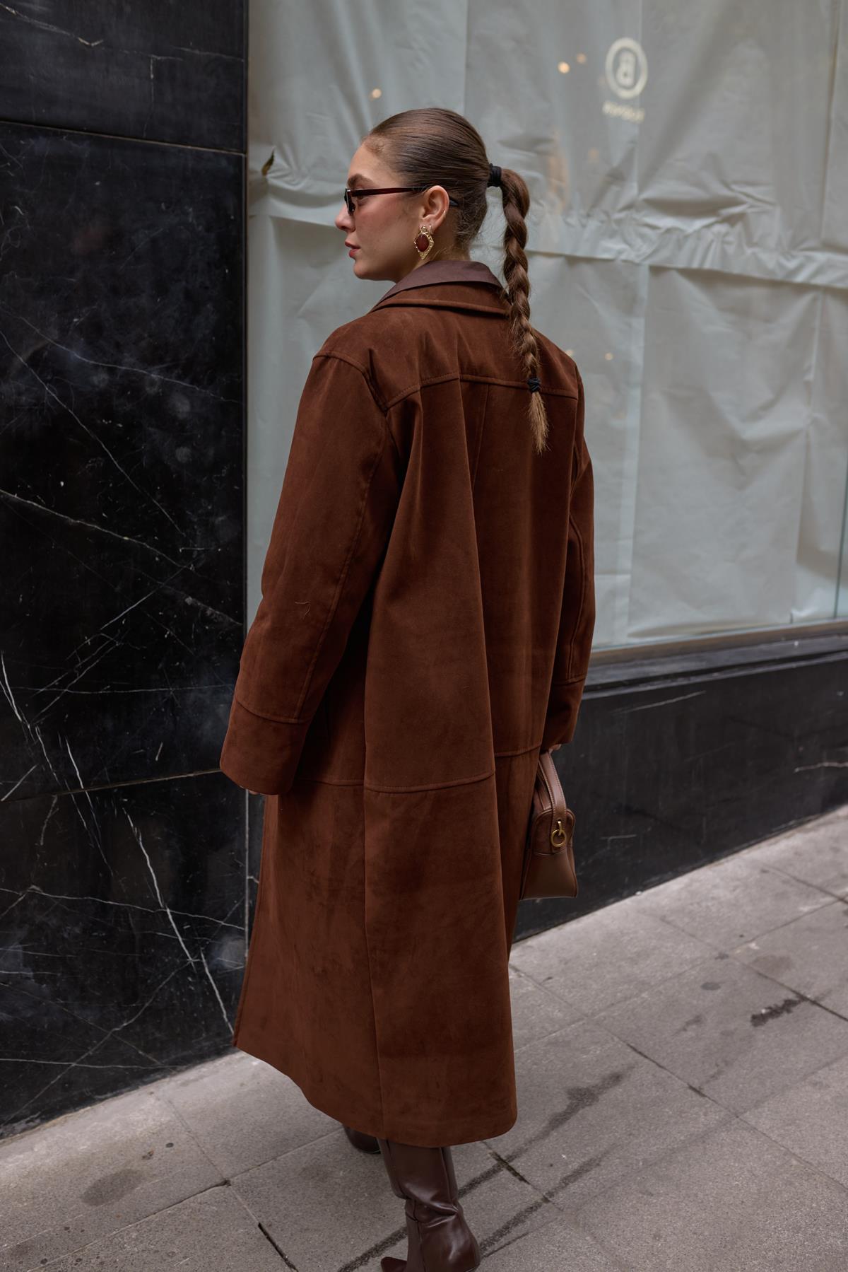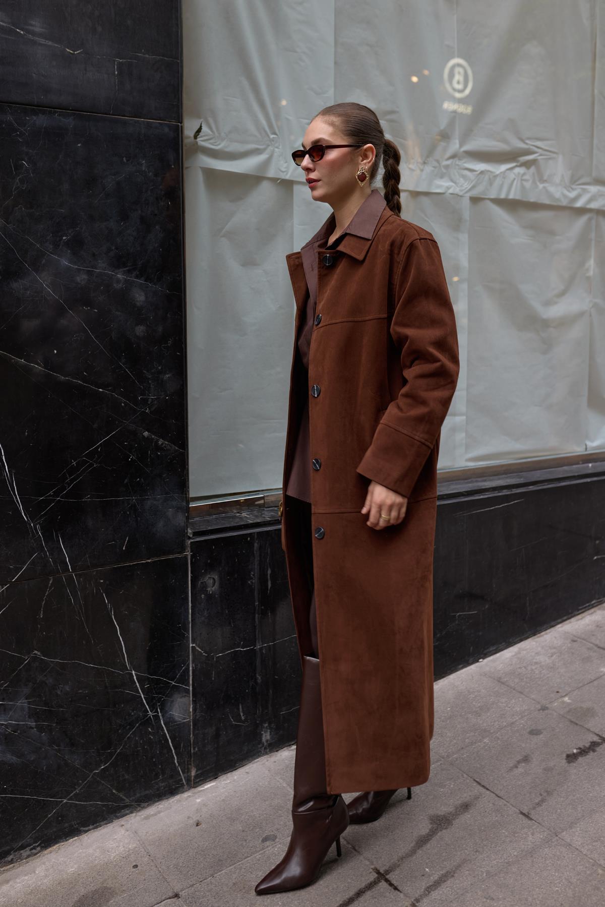 Kahve Polo Yaka Uzun Nubuk Kaban (117-00086)