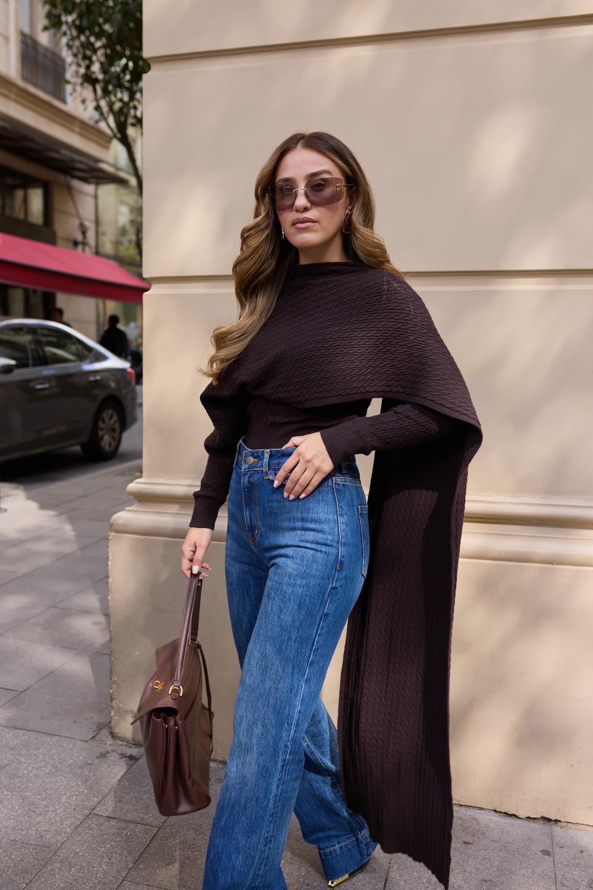 Kahve Şal Detaylı Örgü Kazak (108-00708)