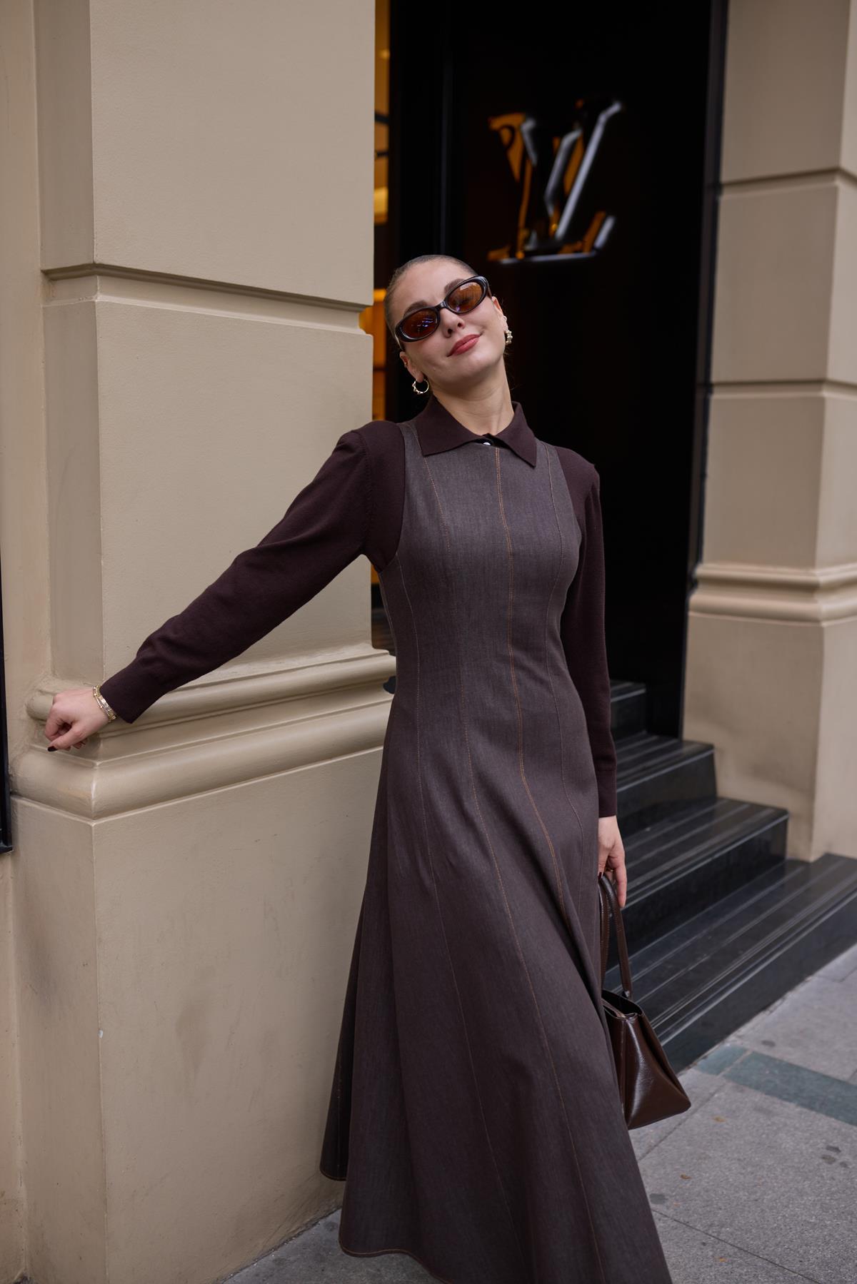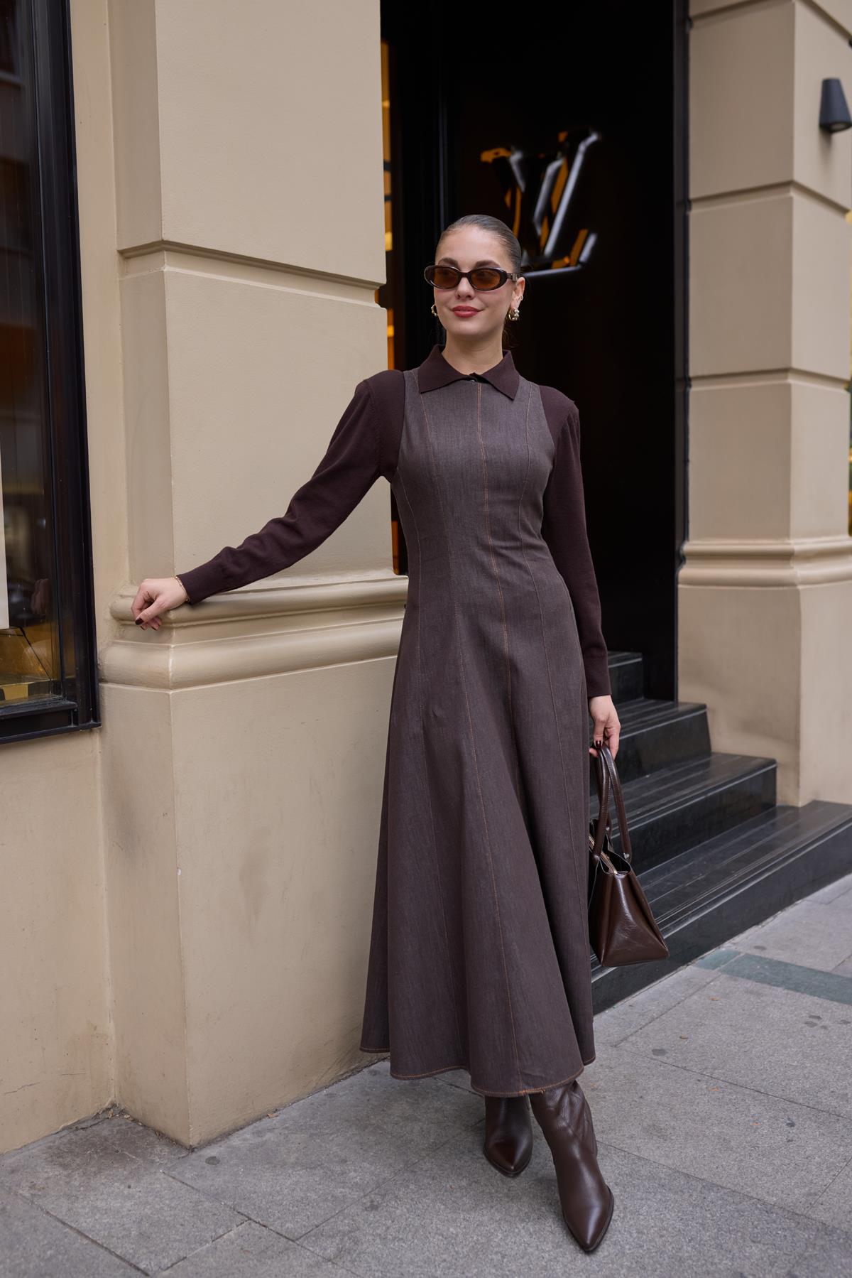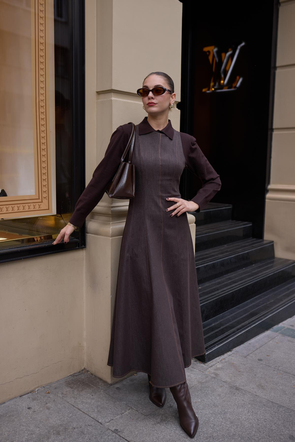 Kahve Sıfır Kol Dikiş Detaylı Denim Elbise (101-01811)
