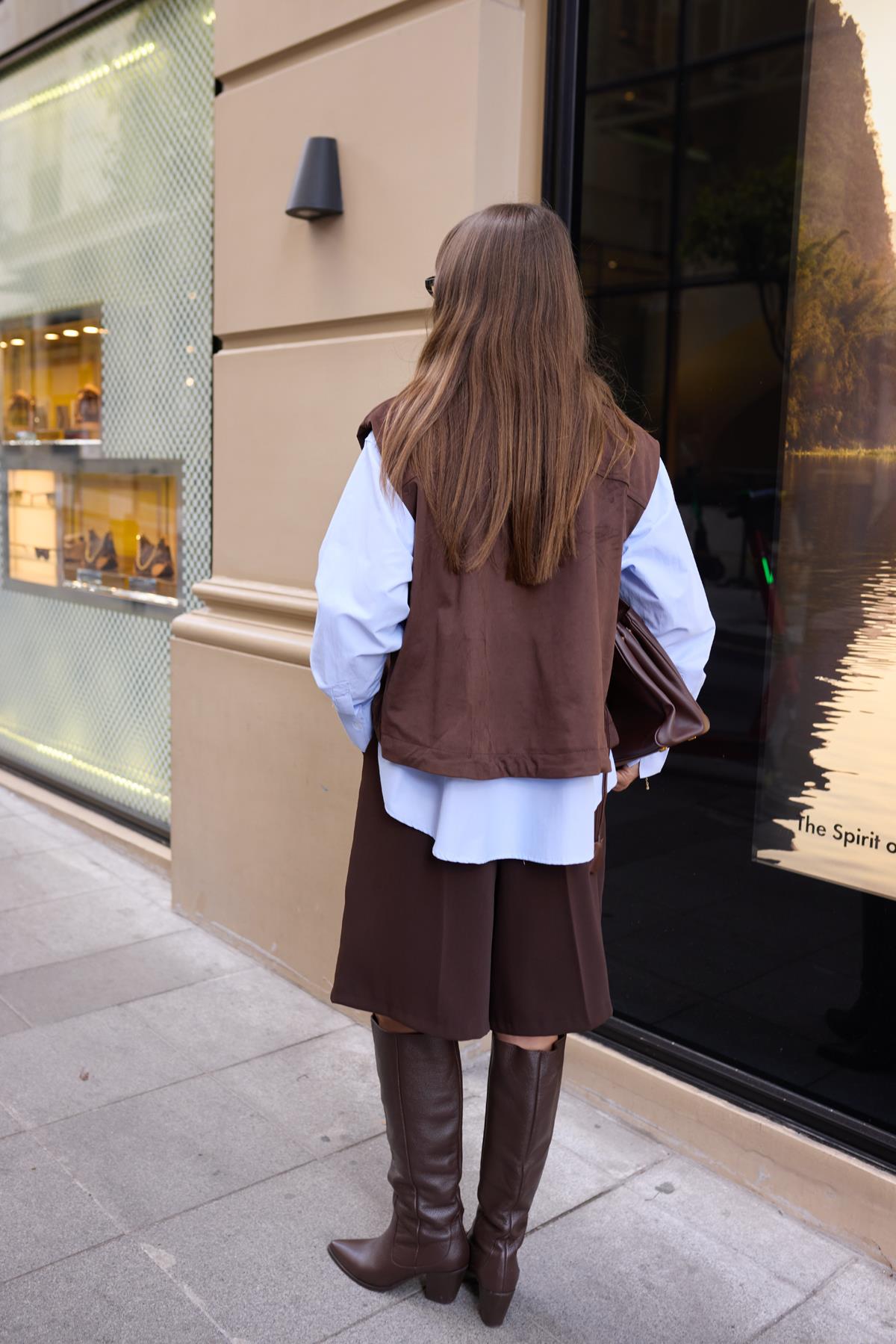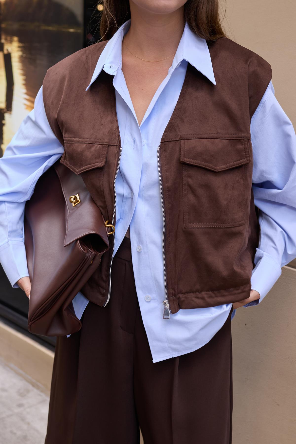 Kahve Torba Cepli Alttan Büzgü Detaylı Nubuk Yelek (124-00208)