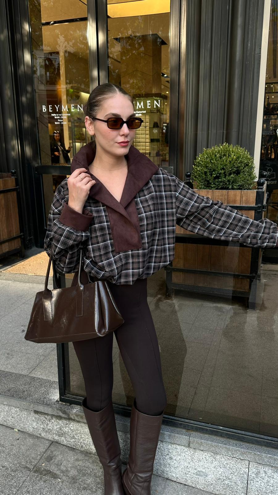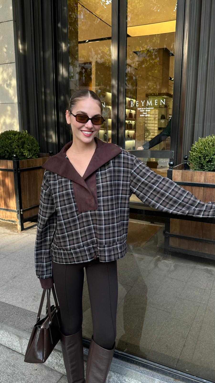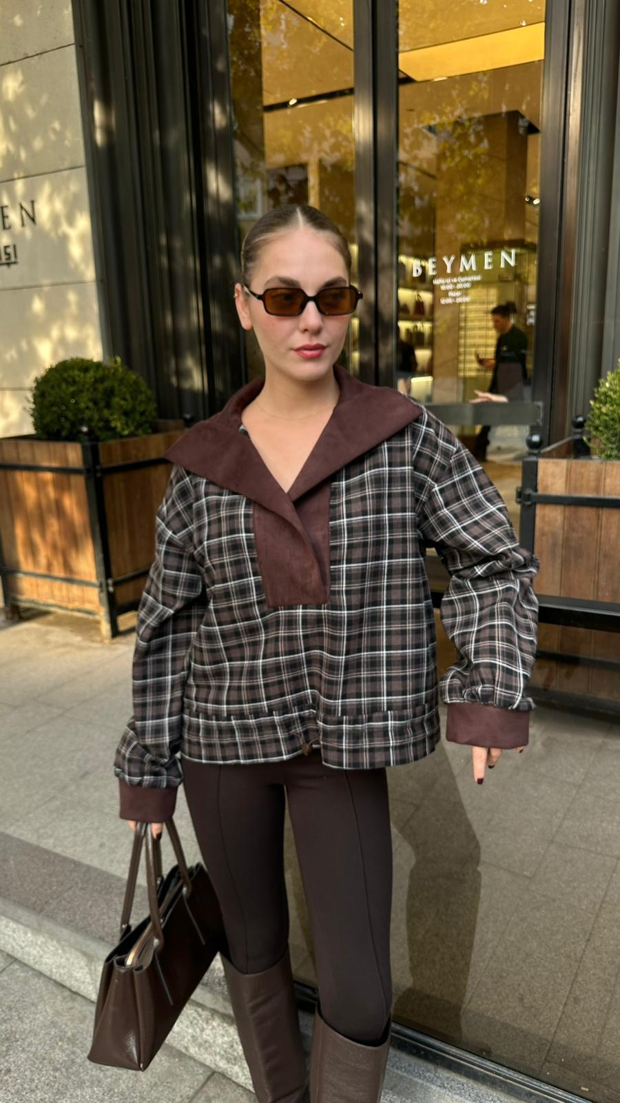 Kahve Yakası Süet Detaylı Alttan Büzgülü Ekoseli SweatShirt