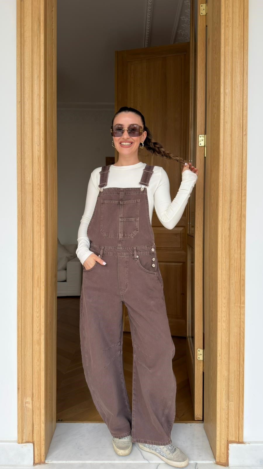 Kahve Yanlardan Düğmeli Slouchy Tulum (113-00150)