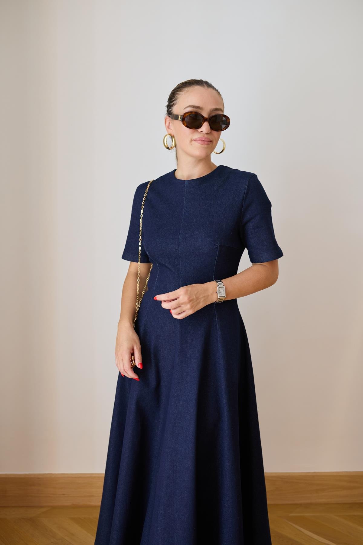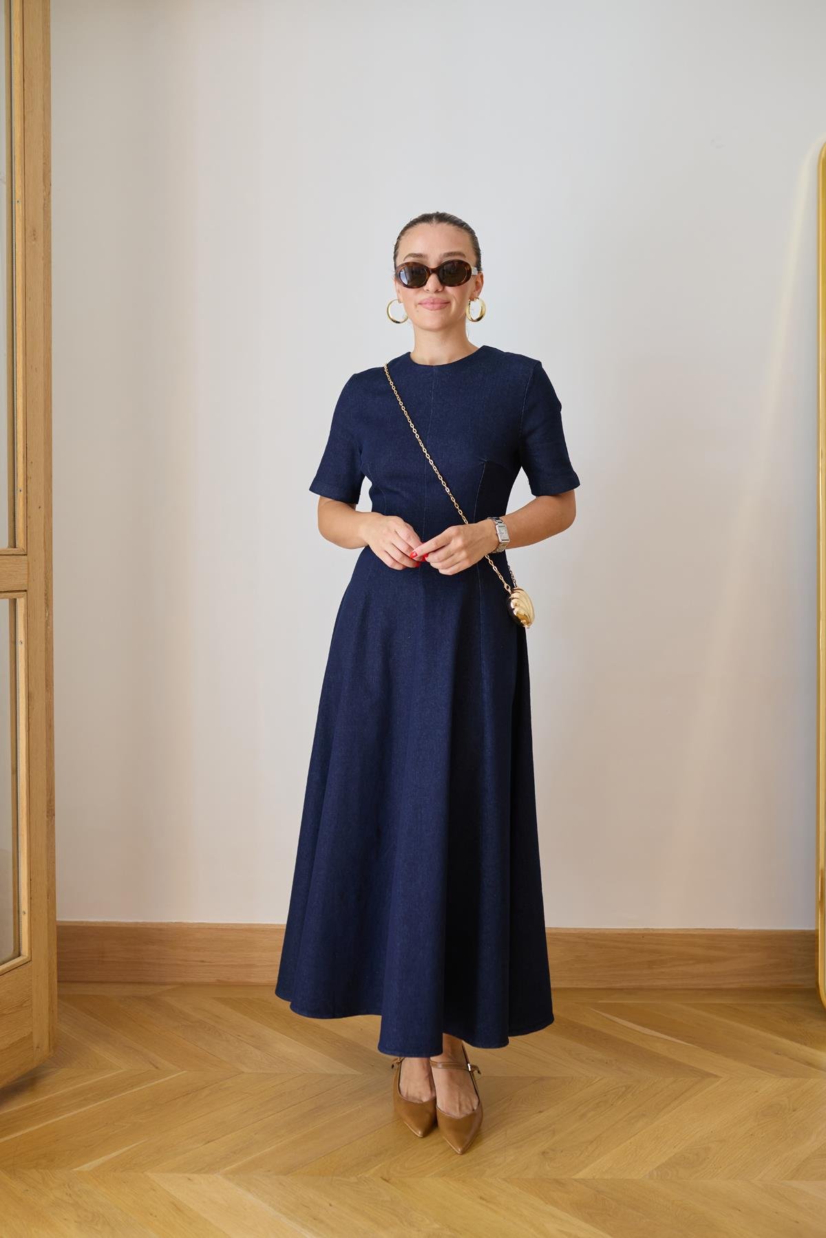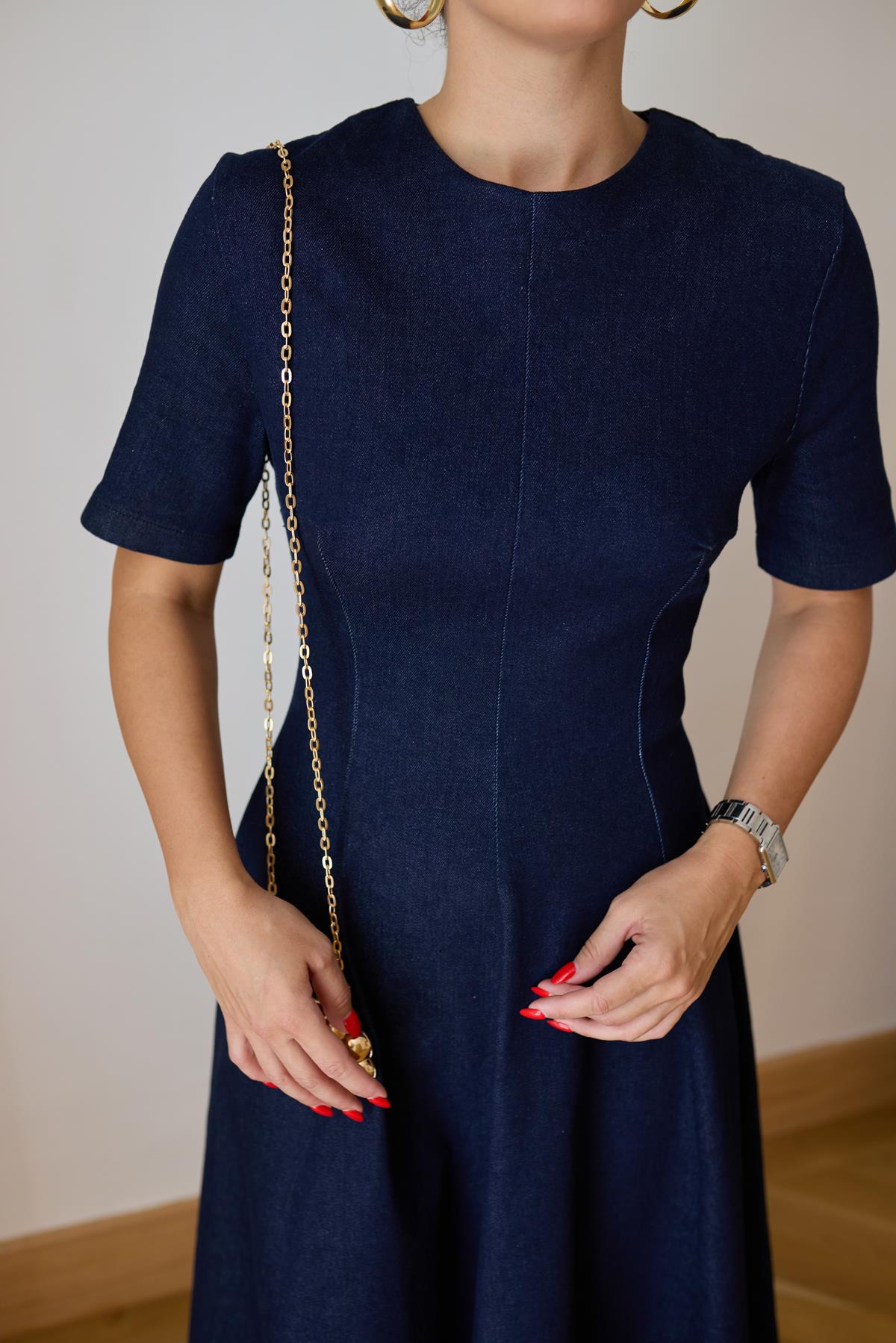 Klasik Jean Rengi Bisiklet Yaka Belden Oturmalı Arkadan Fermuarlı Denim Elbise