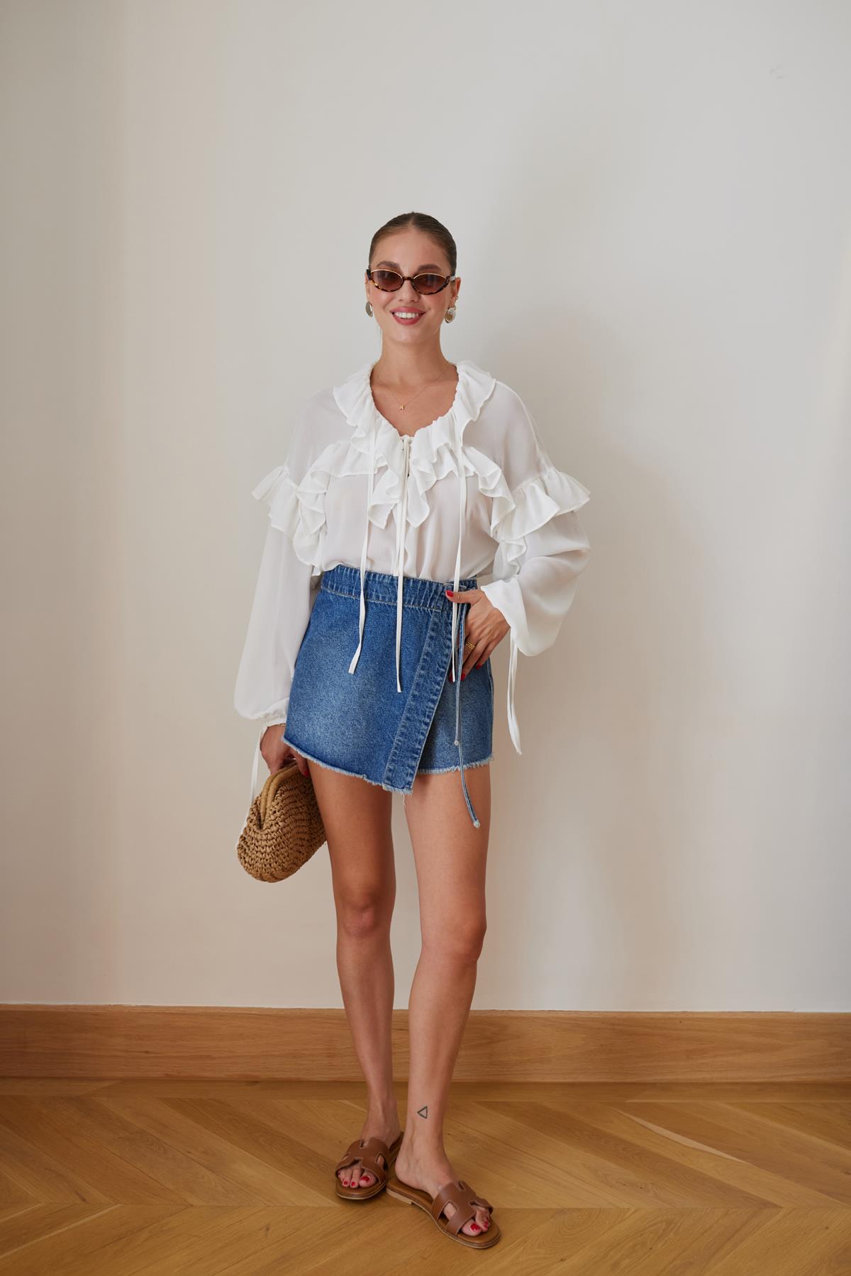 Klasik Jean Rengi Denim Mini Şort Etek (111-00110)