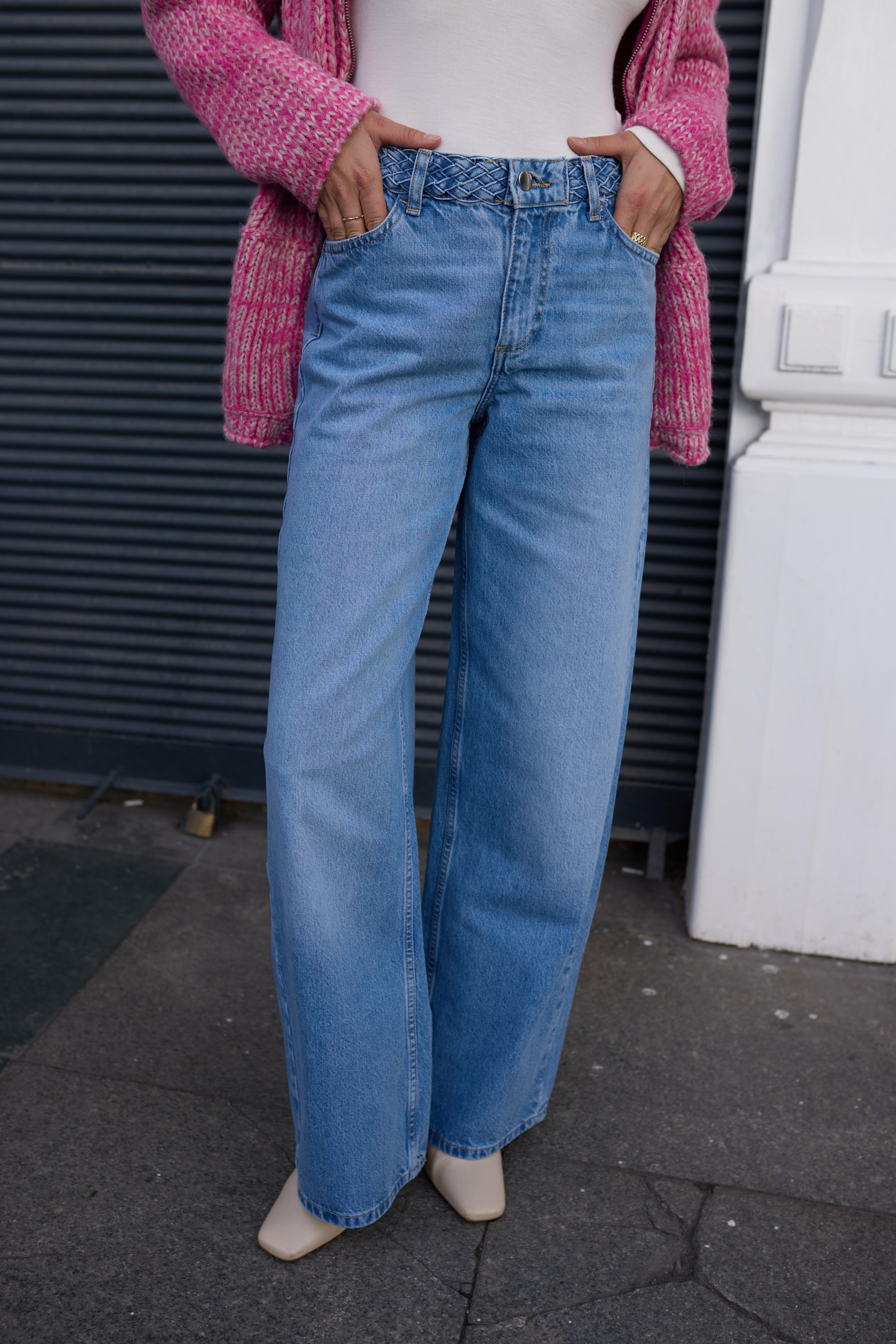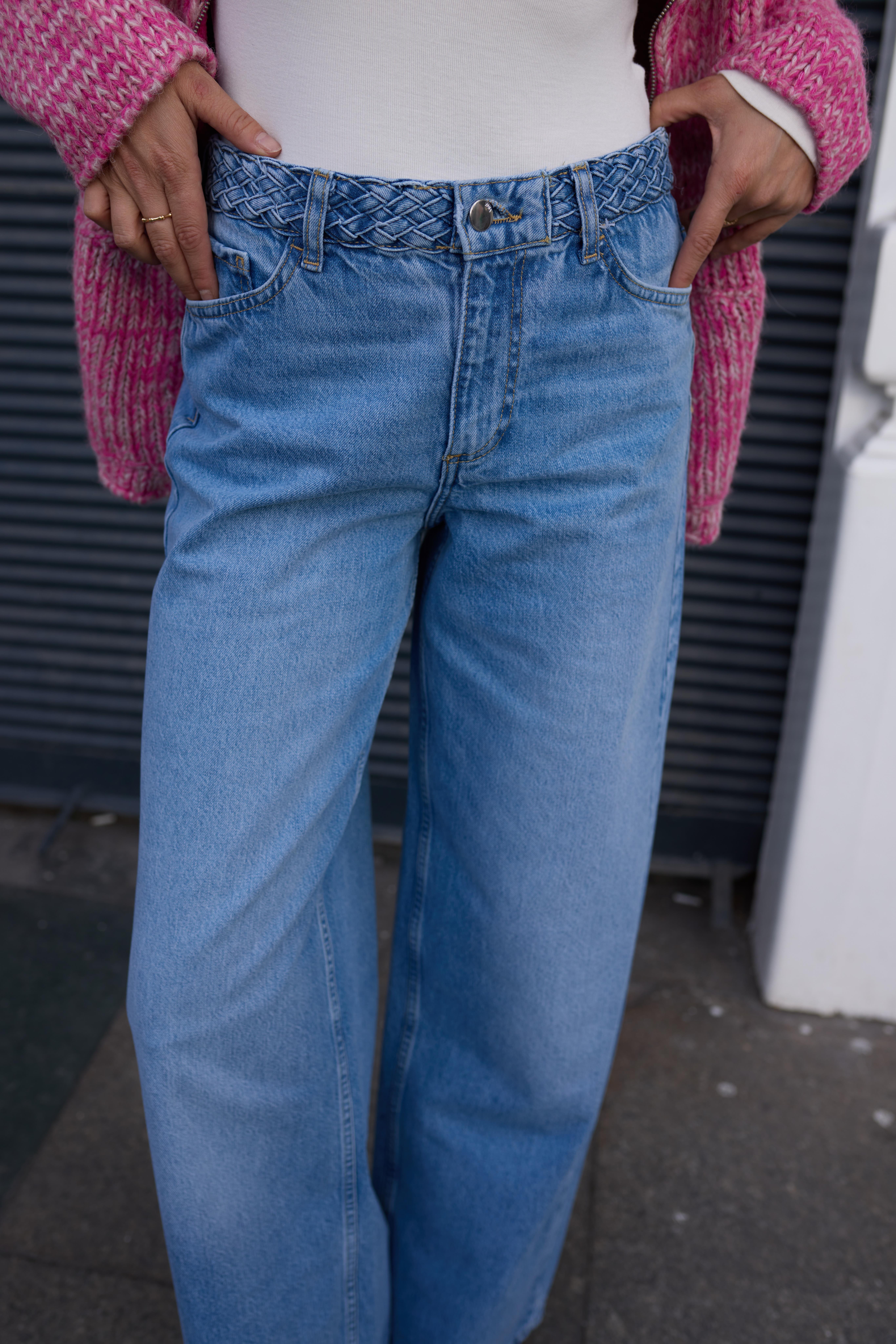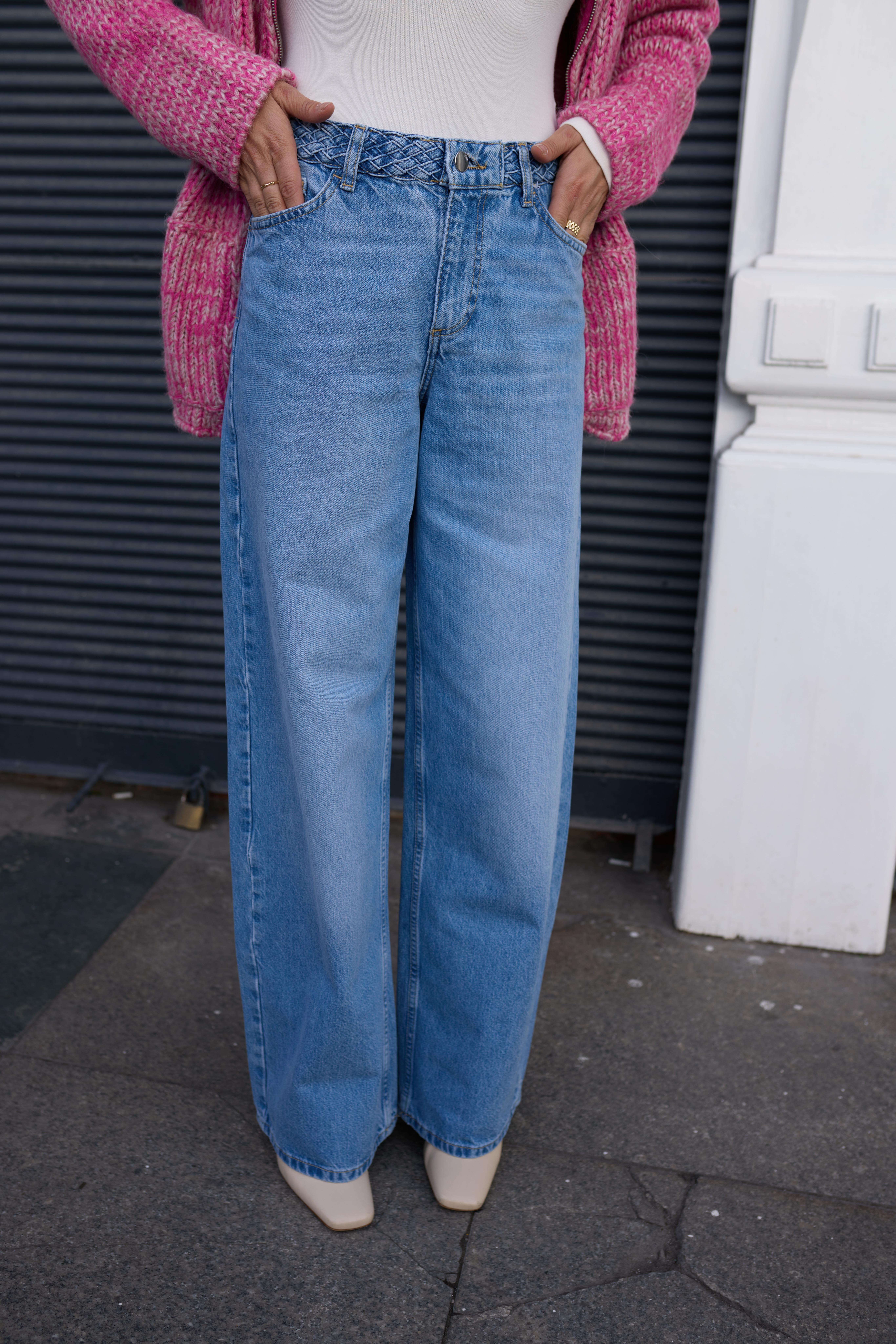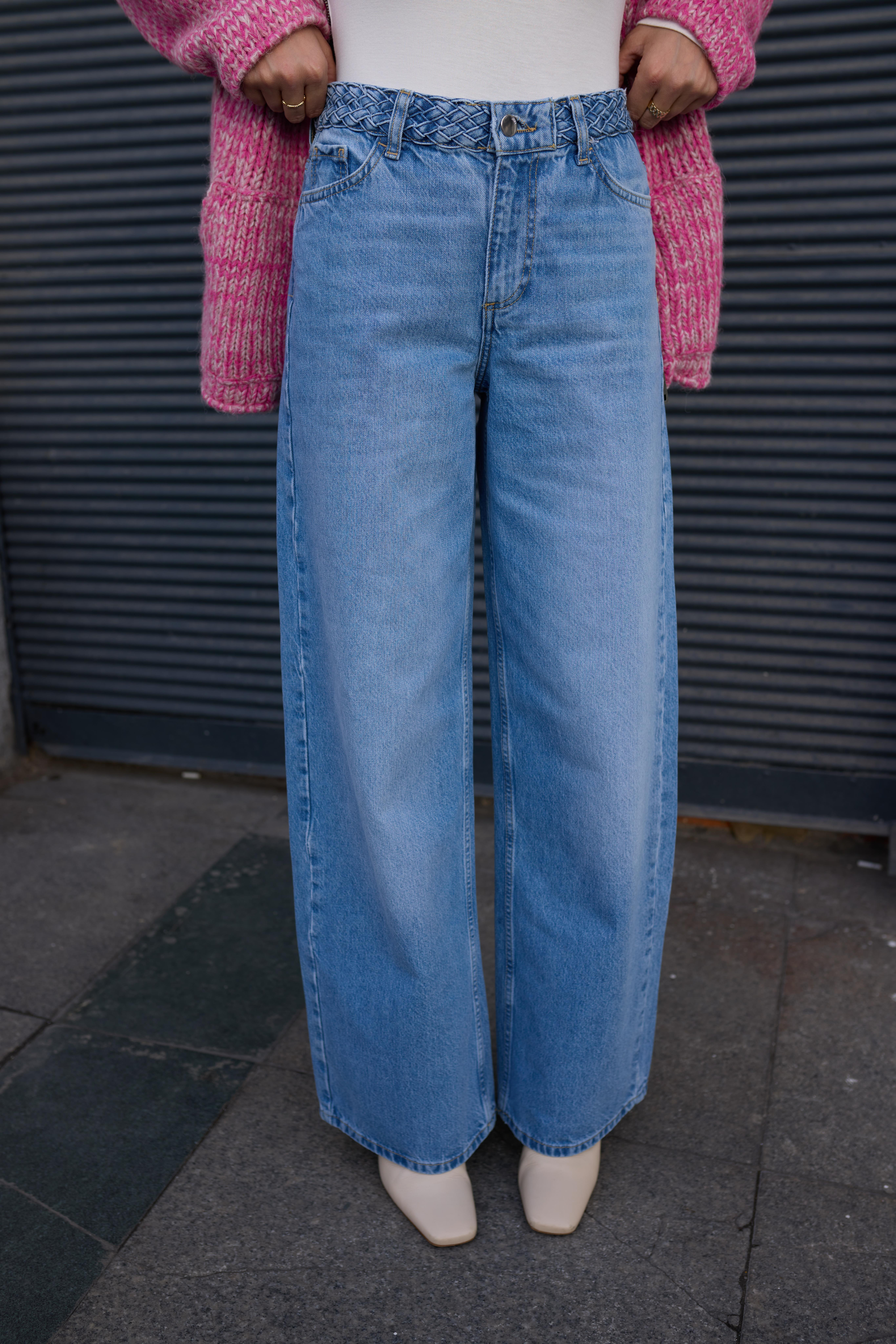 Klasik Jean Rengi Yüksek Bel Kemeri İşleme Detaylı Palazzo Jean Pantolon (114-00611)