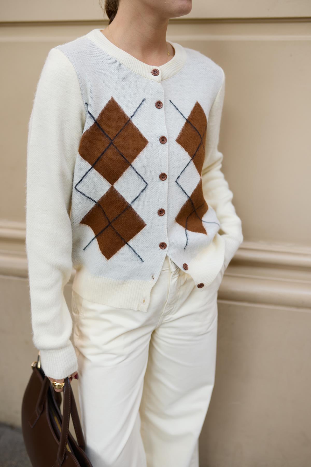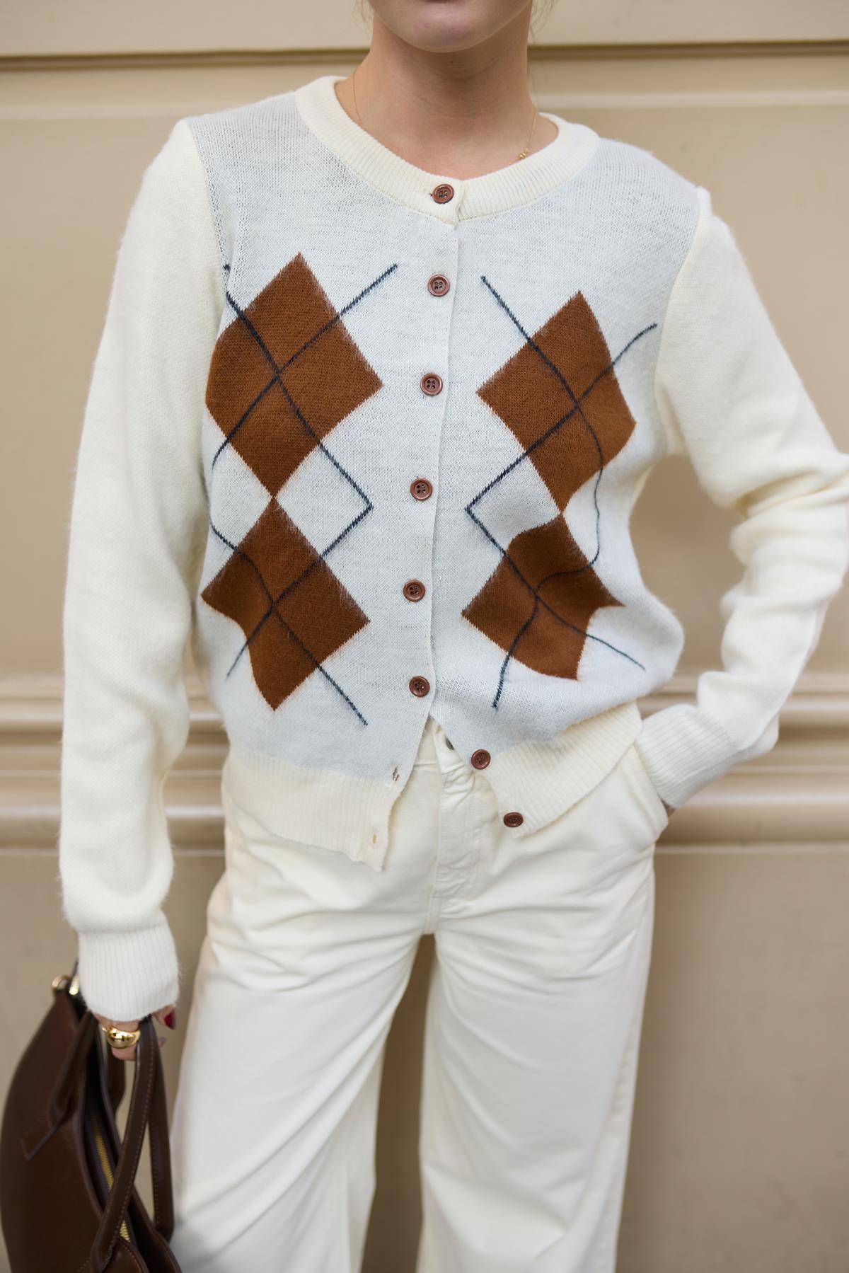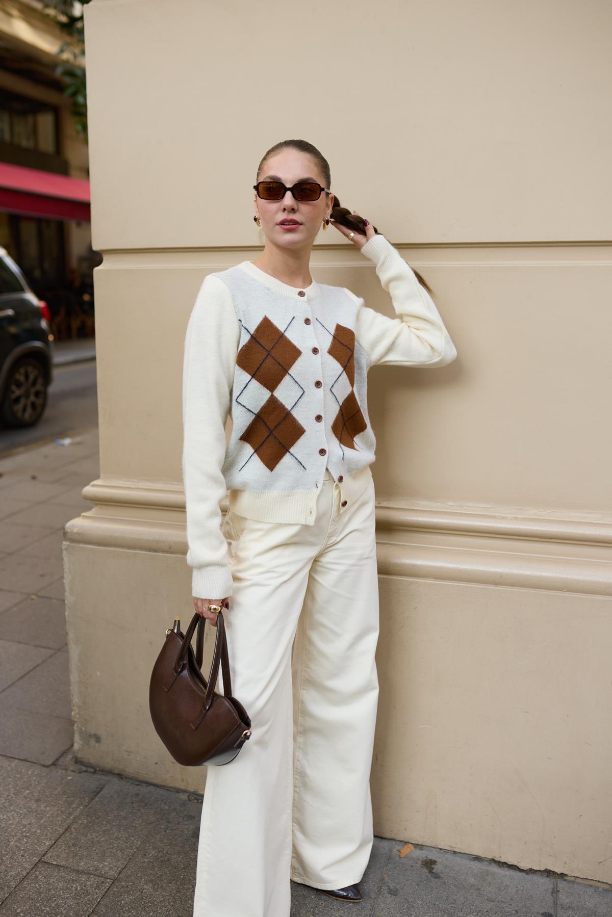 Krem Kemik Düğme Detaylı Ekoseli Hırka (104-00504)