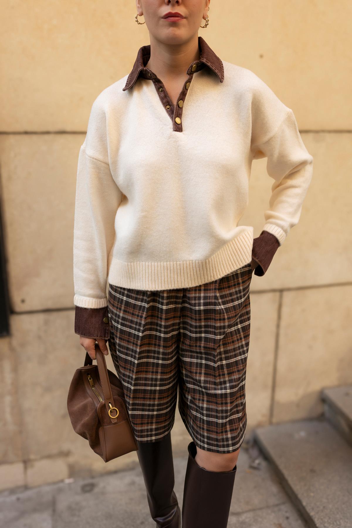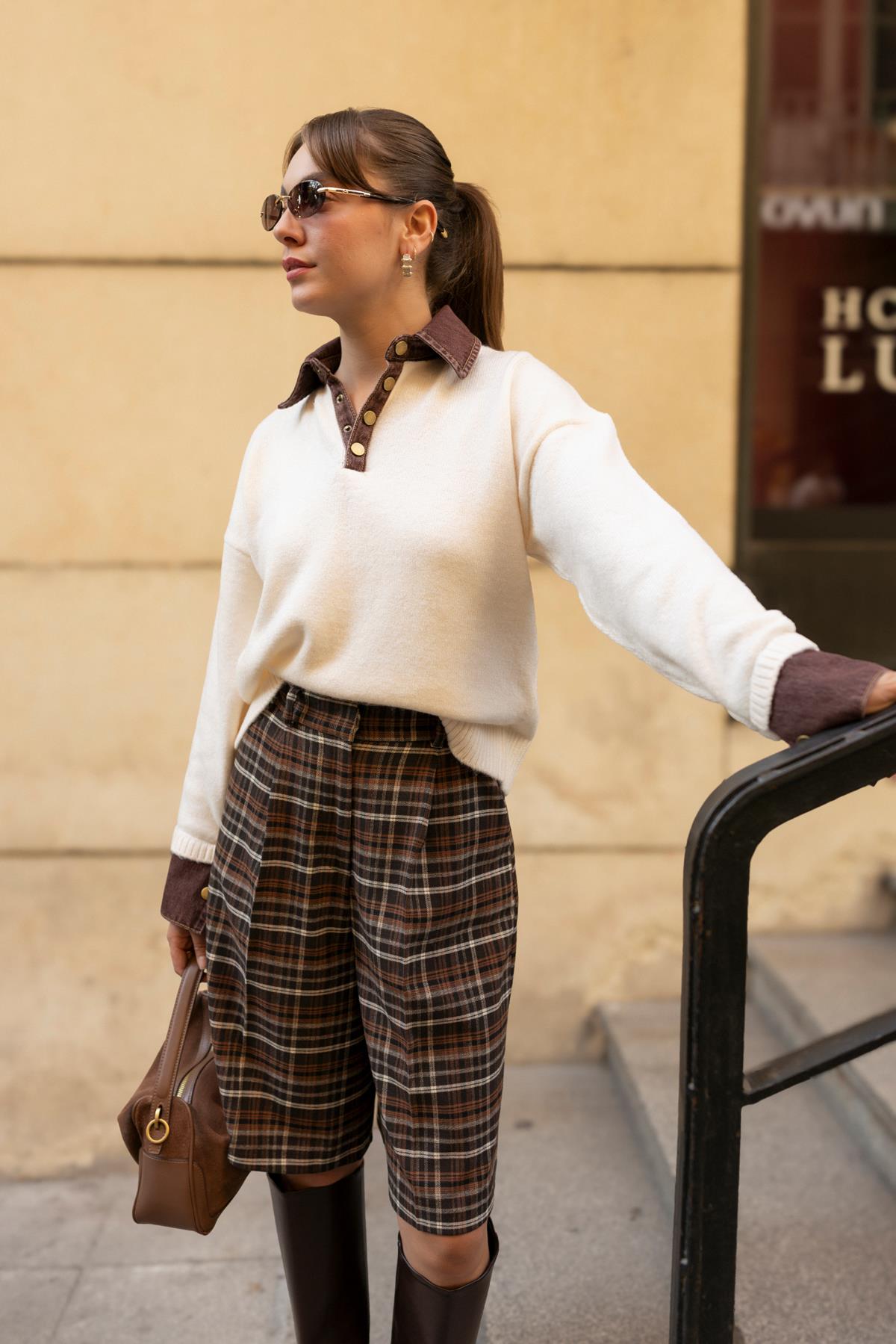 Krem Polo Yaka Parça Denim Detyalı Triko (108-00712)