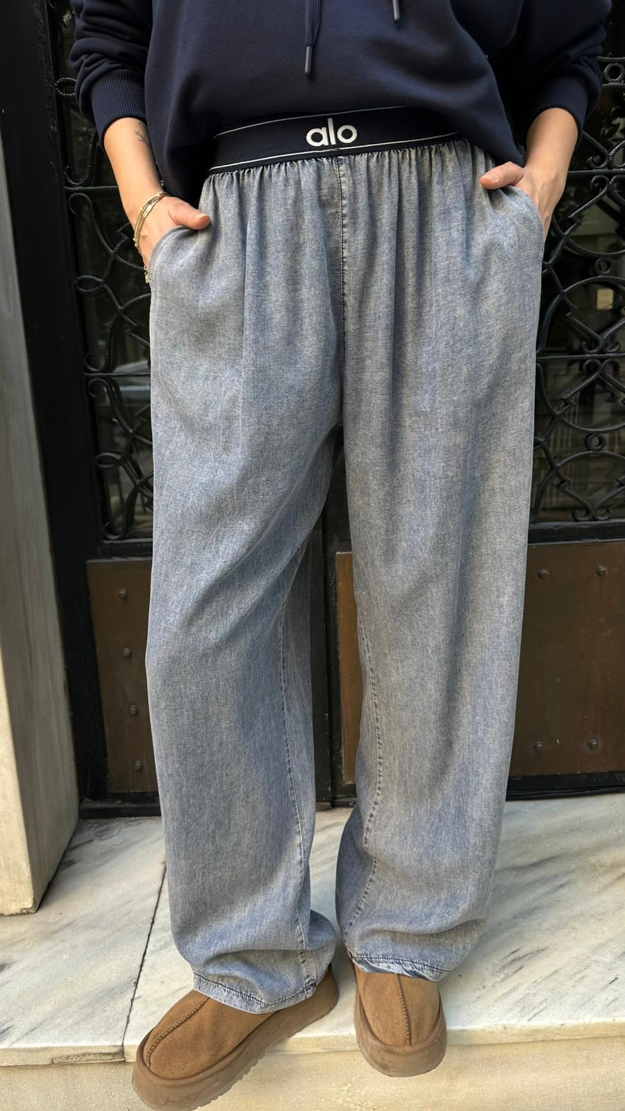 Lacivert Beli Lastikli Ve Yazı Detaylı Denim Pantolon