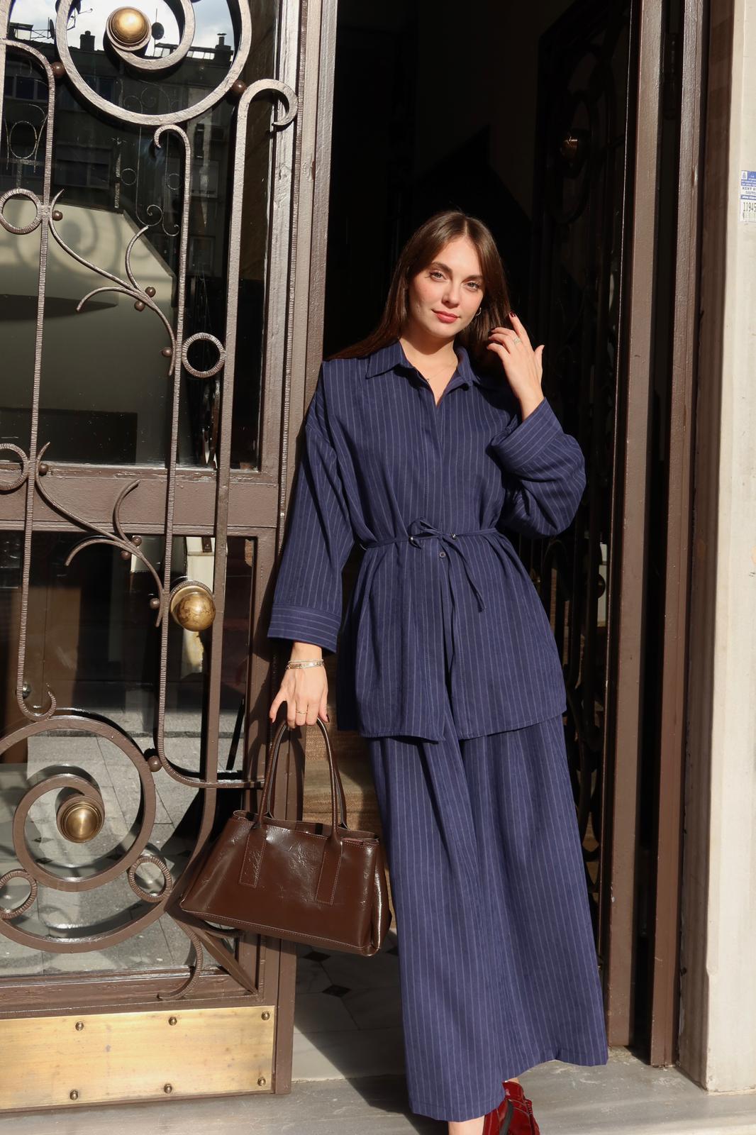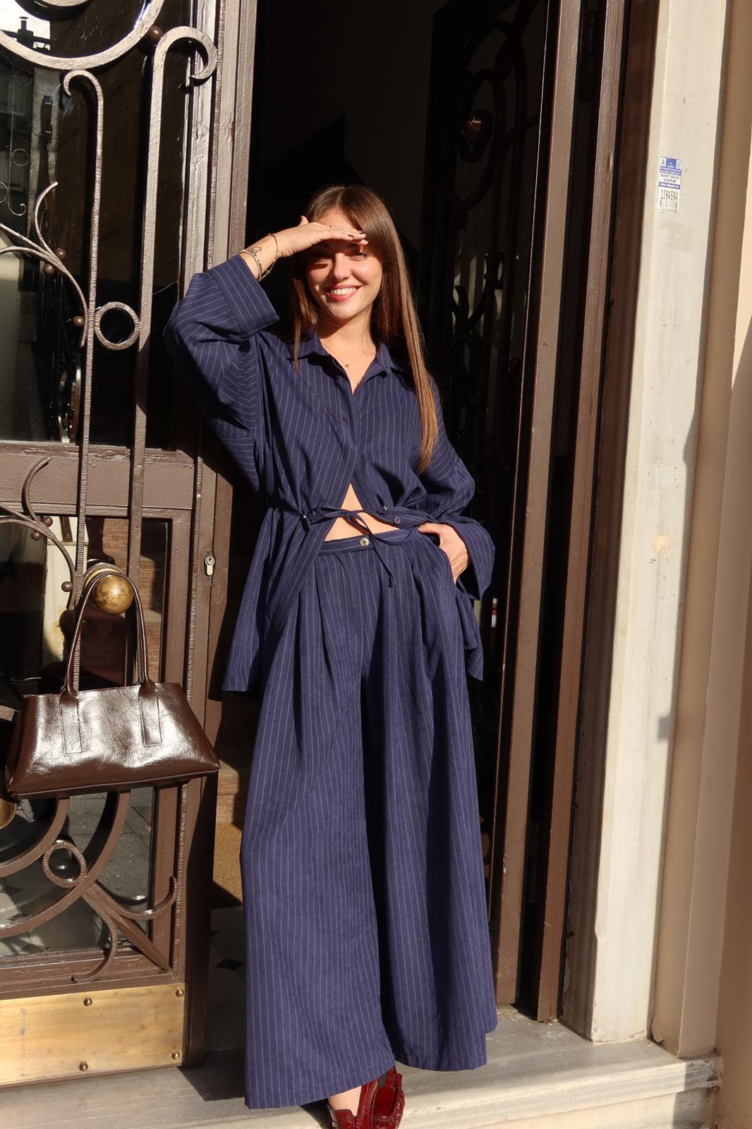 Lacivert Çizgili Kuşak Detaylı Gömlek Pantolon Takım (122-00854)