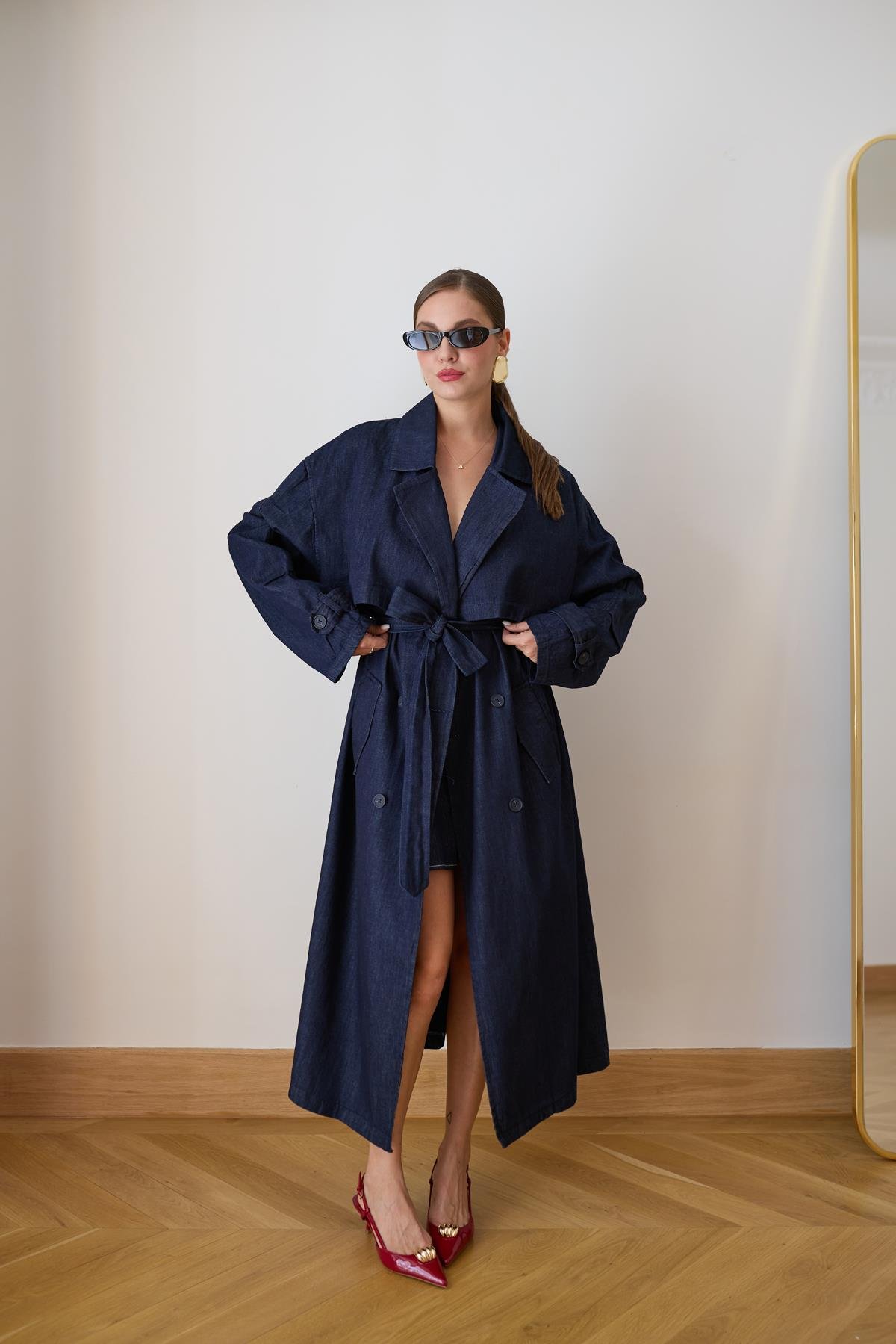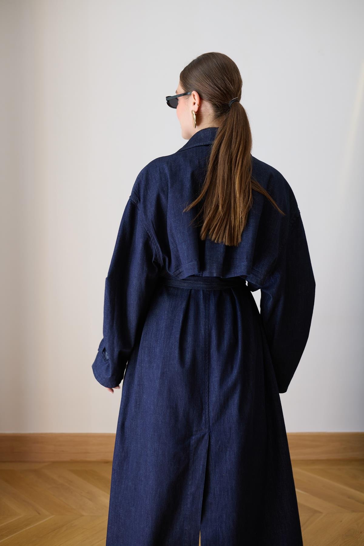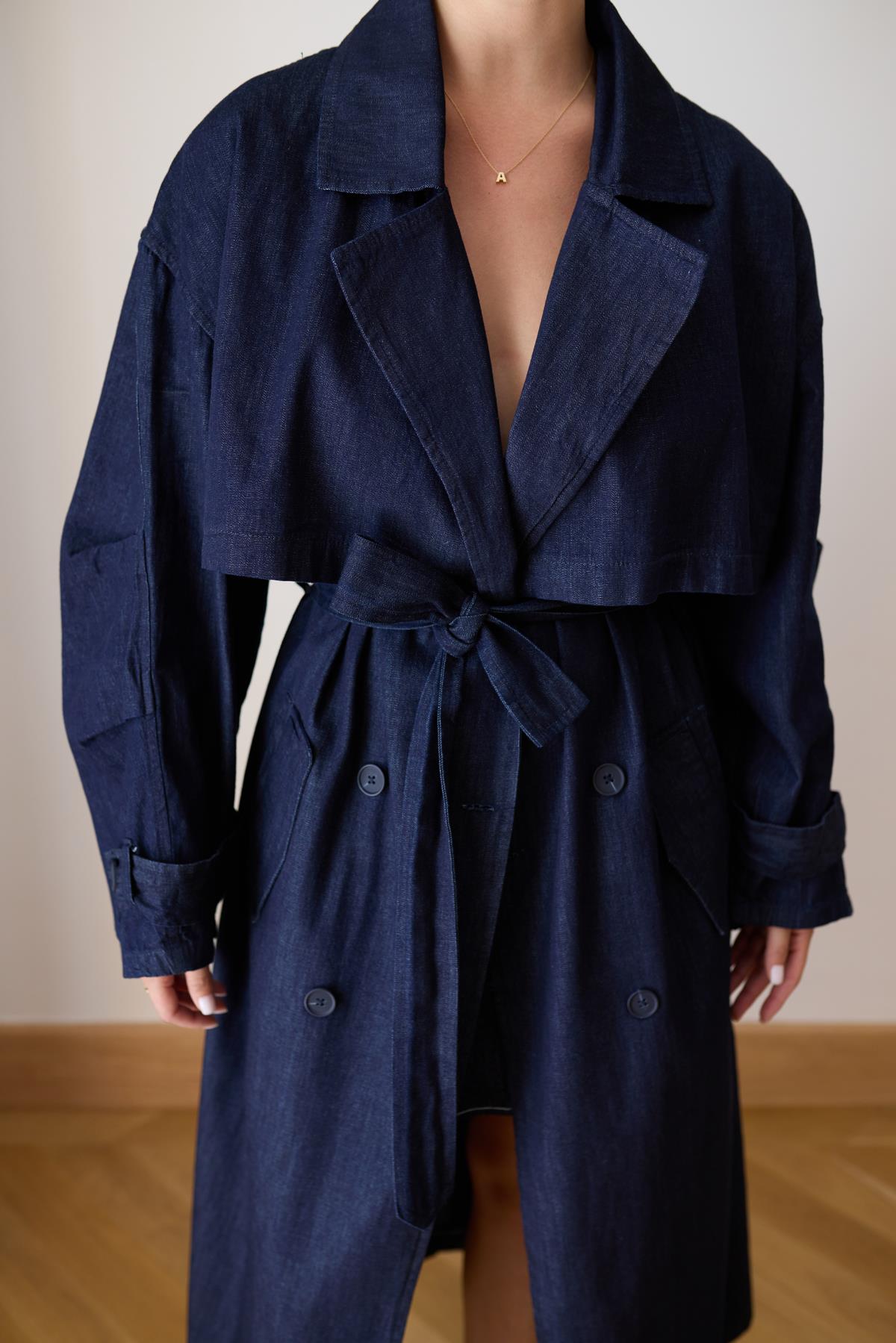 Lacivert Parça Detaylı Oversize Denim Trençkot