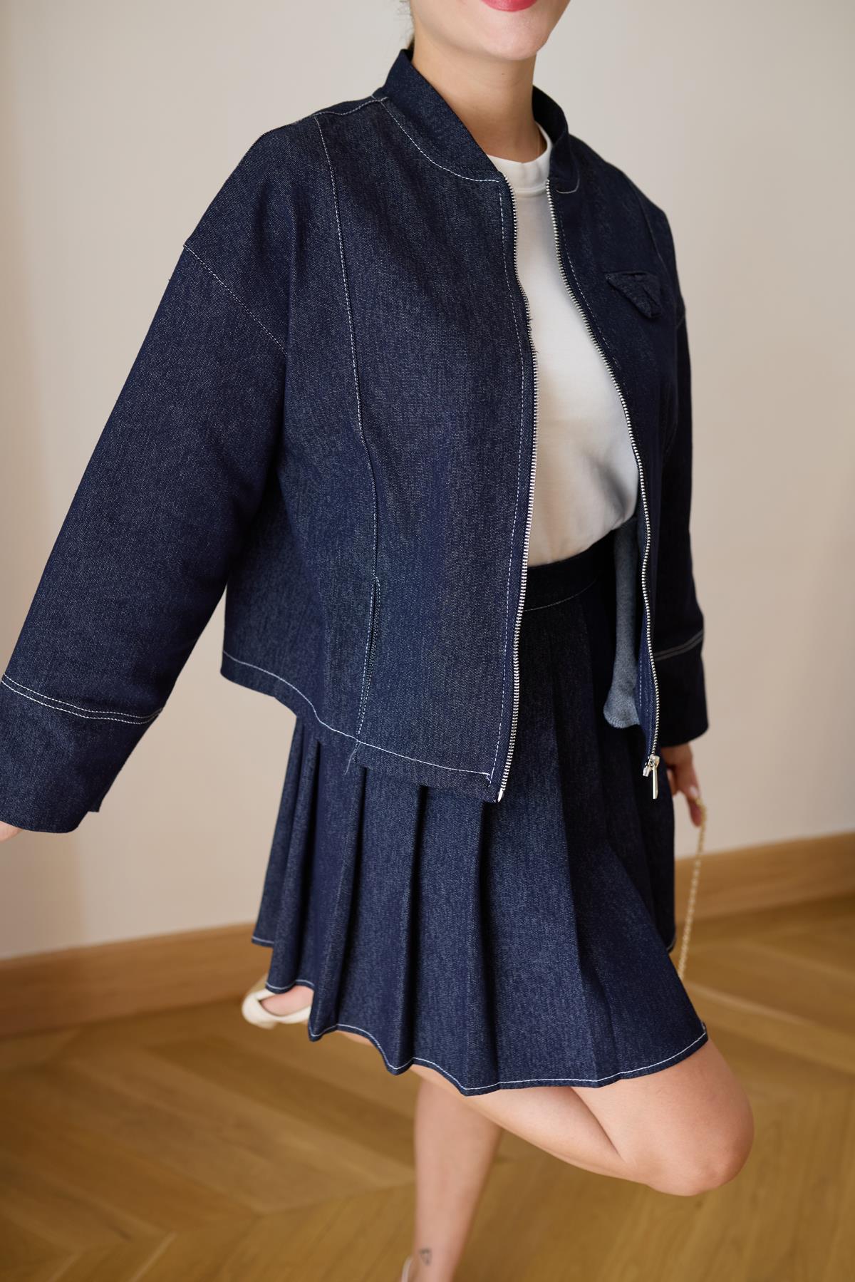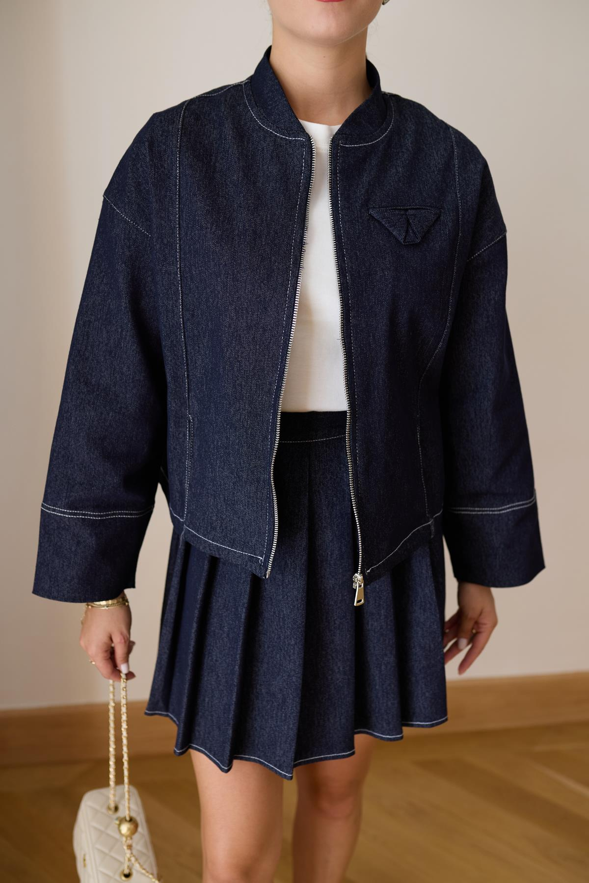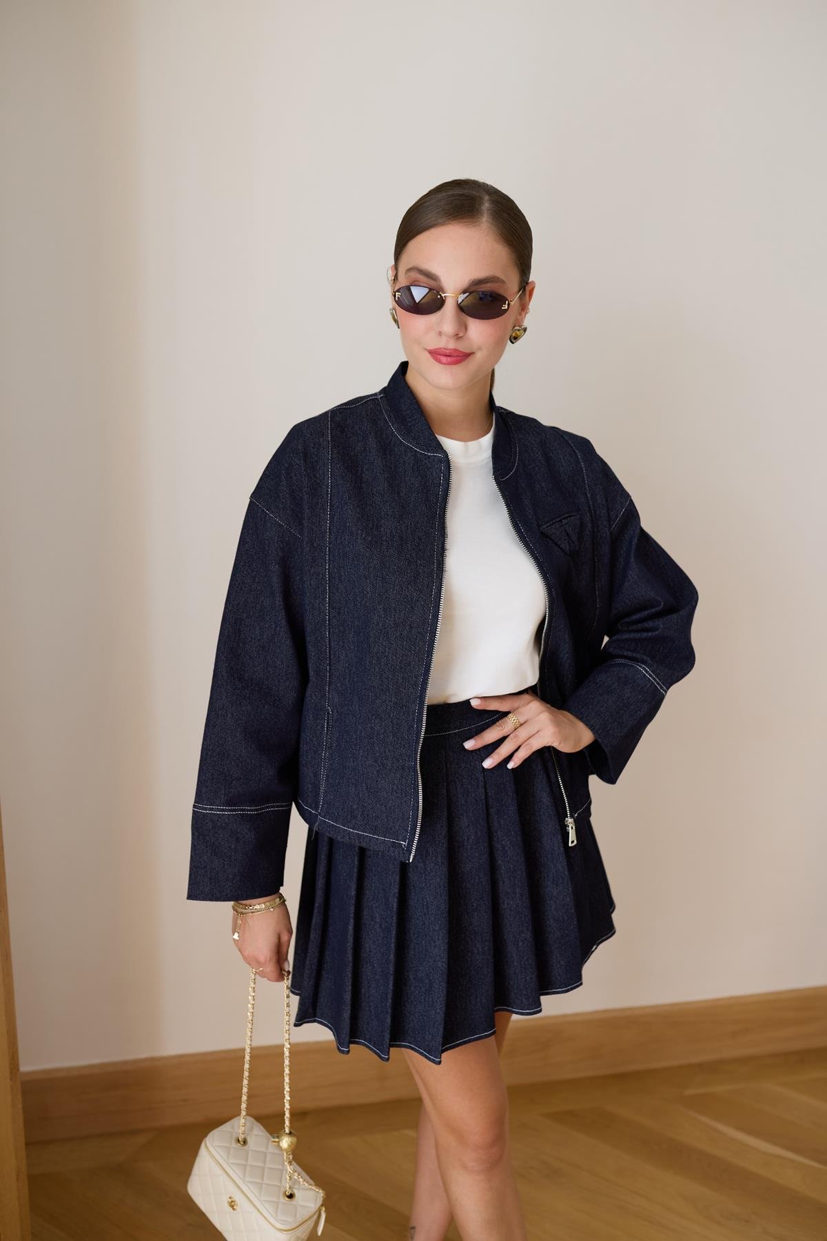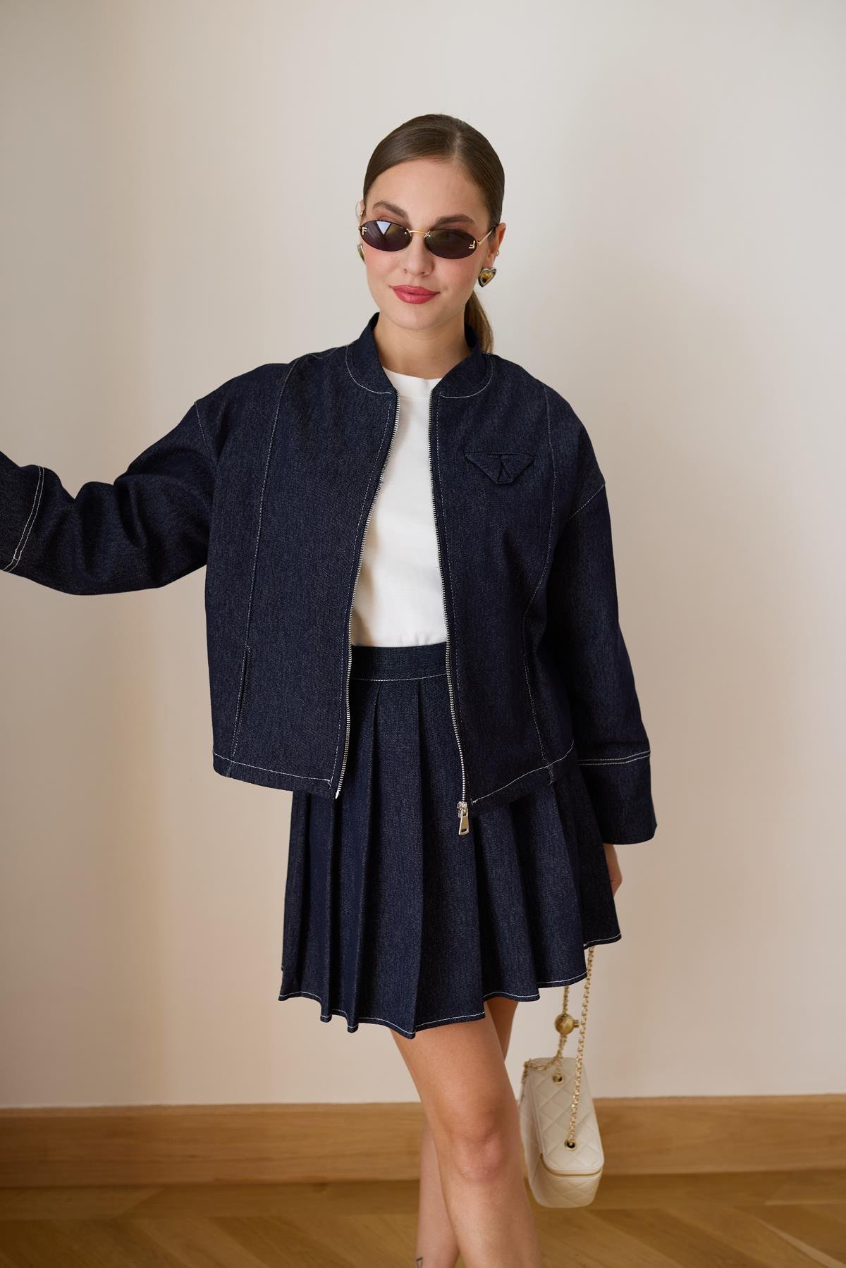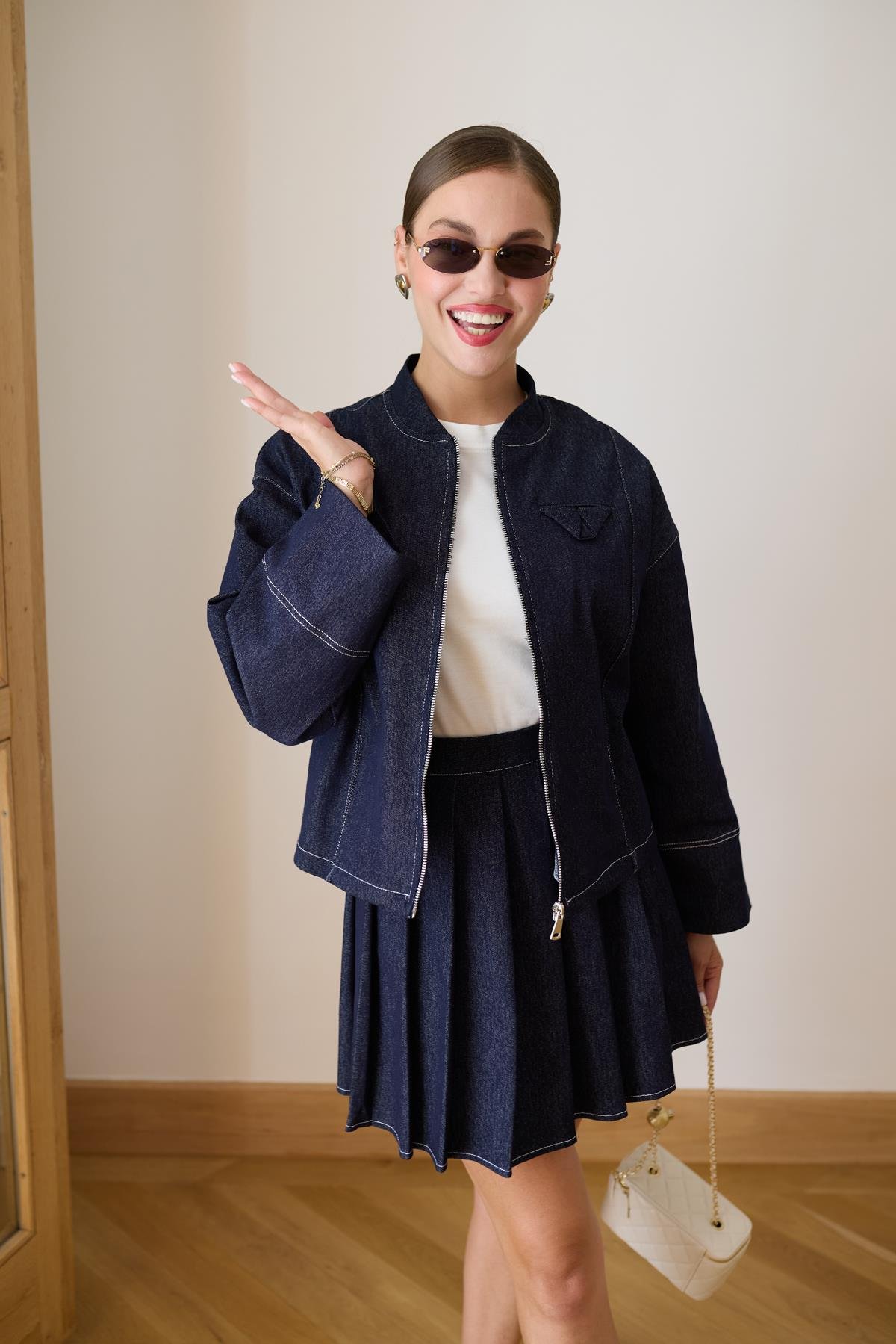 Lacivert Pileli Mini Etek Ceket Likralı  Denim Takım