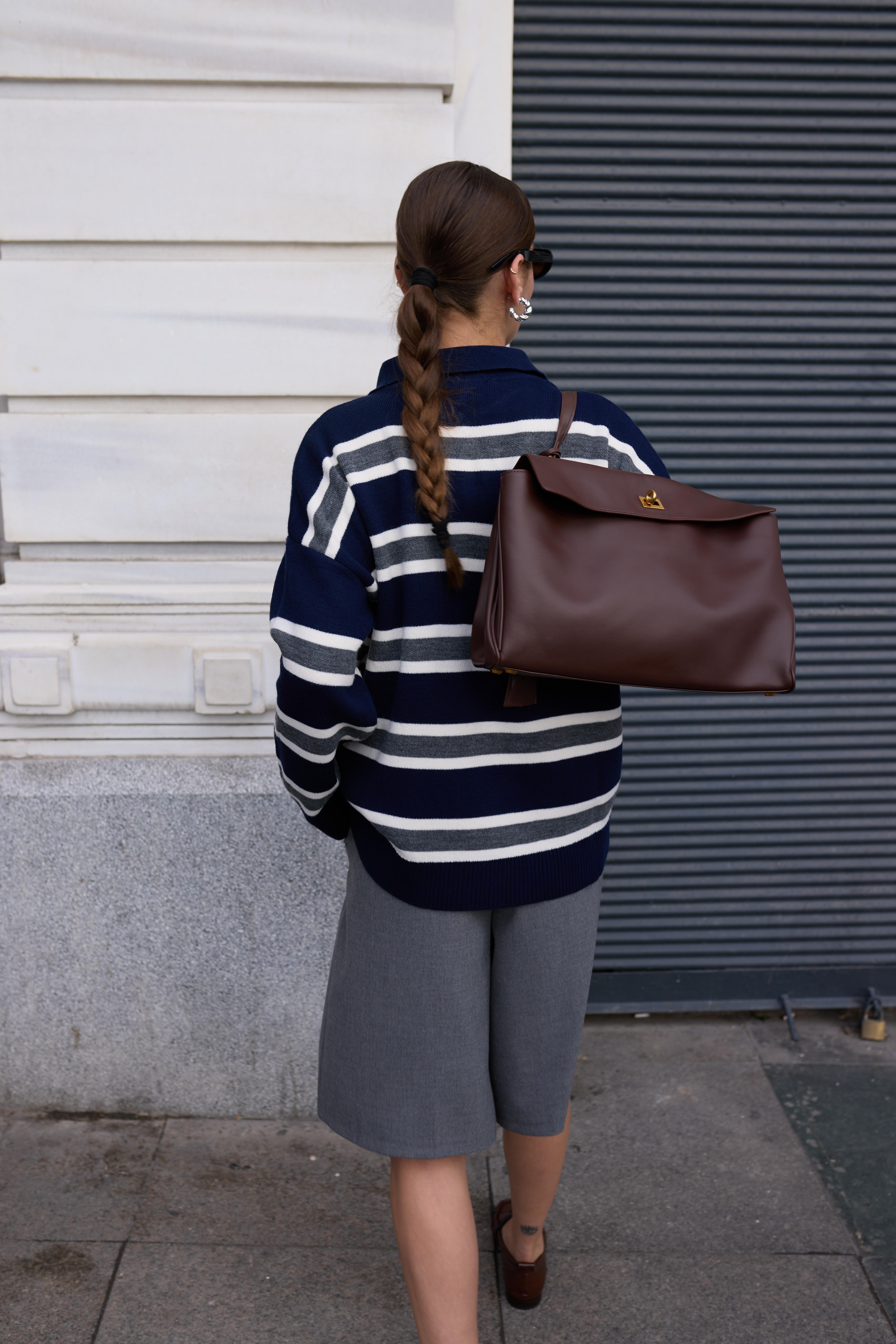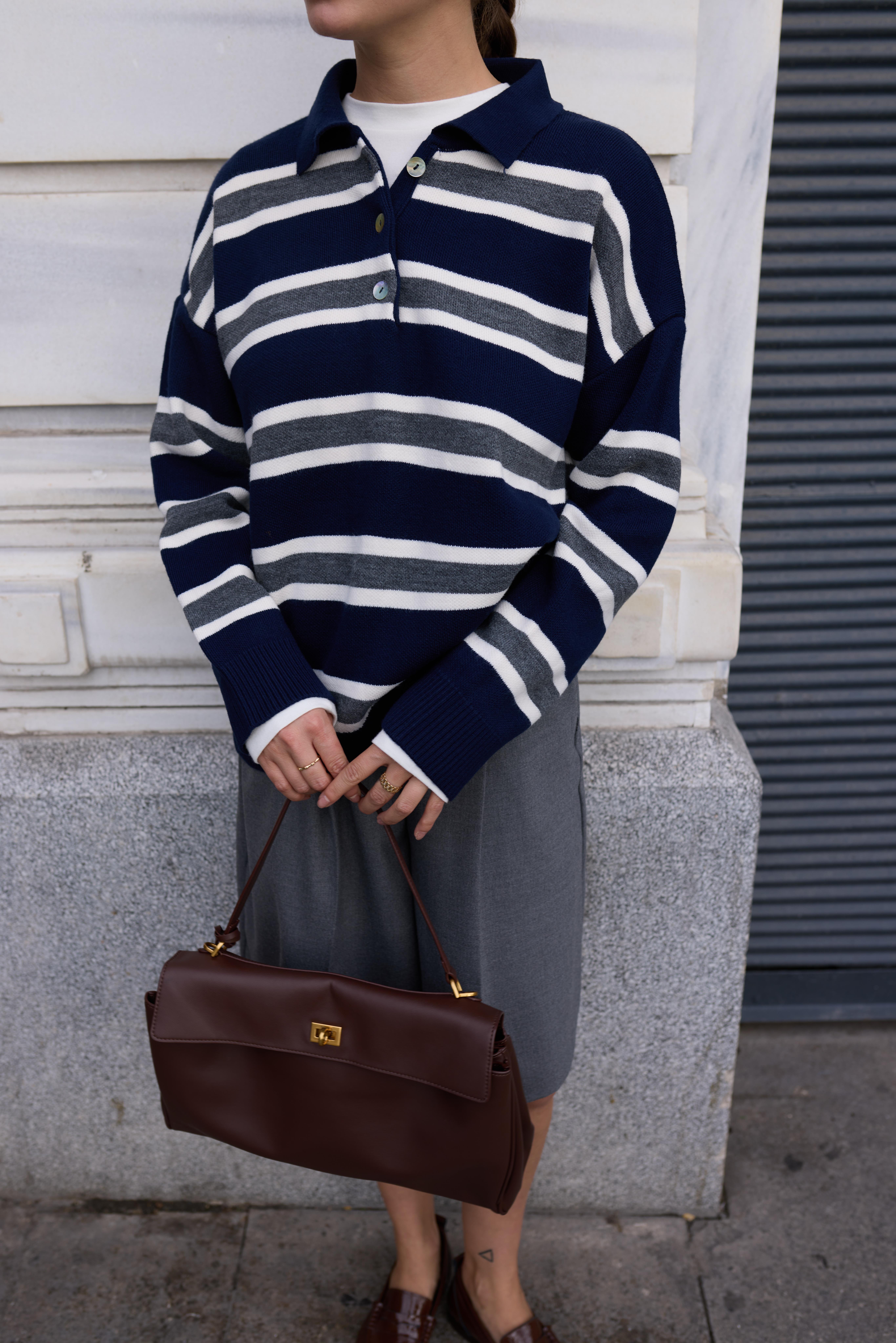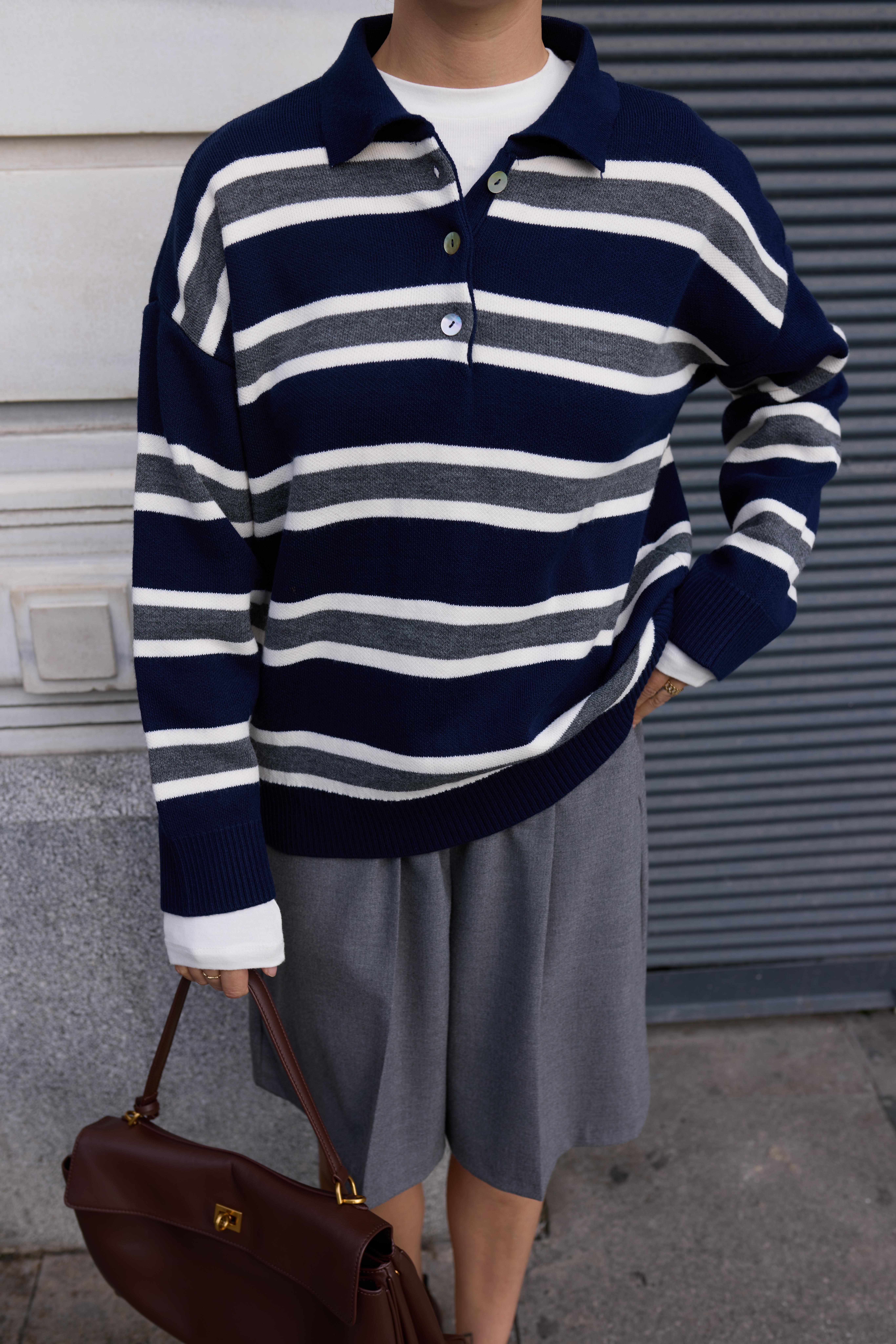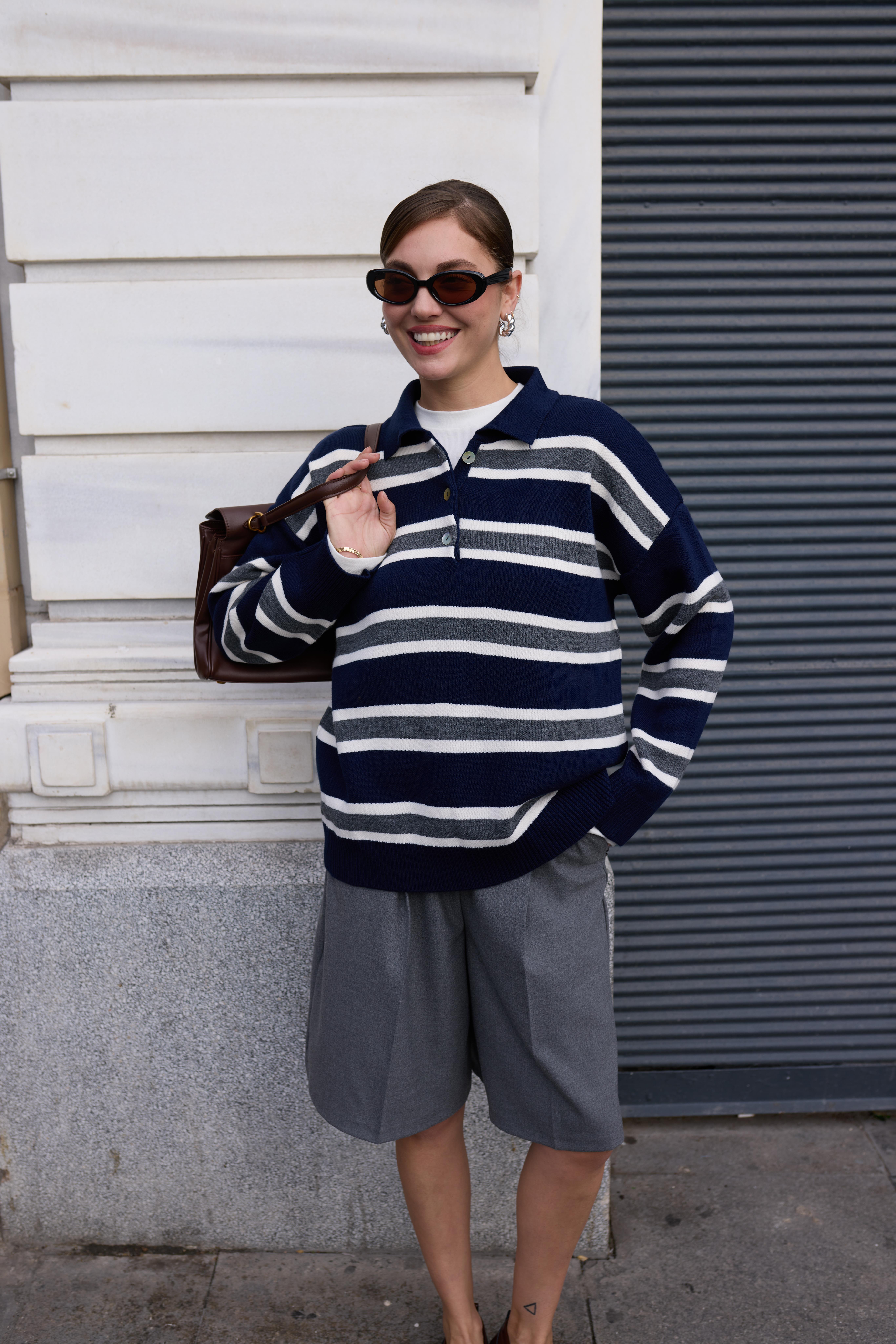 Lacivert Polo Yaka Çizgili Oversize Triko (108-00711)