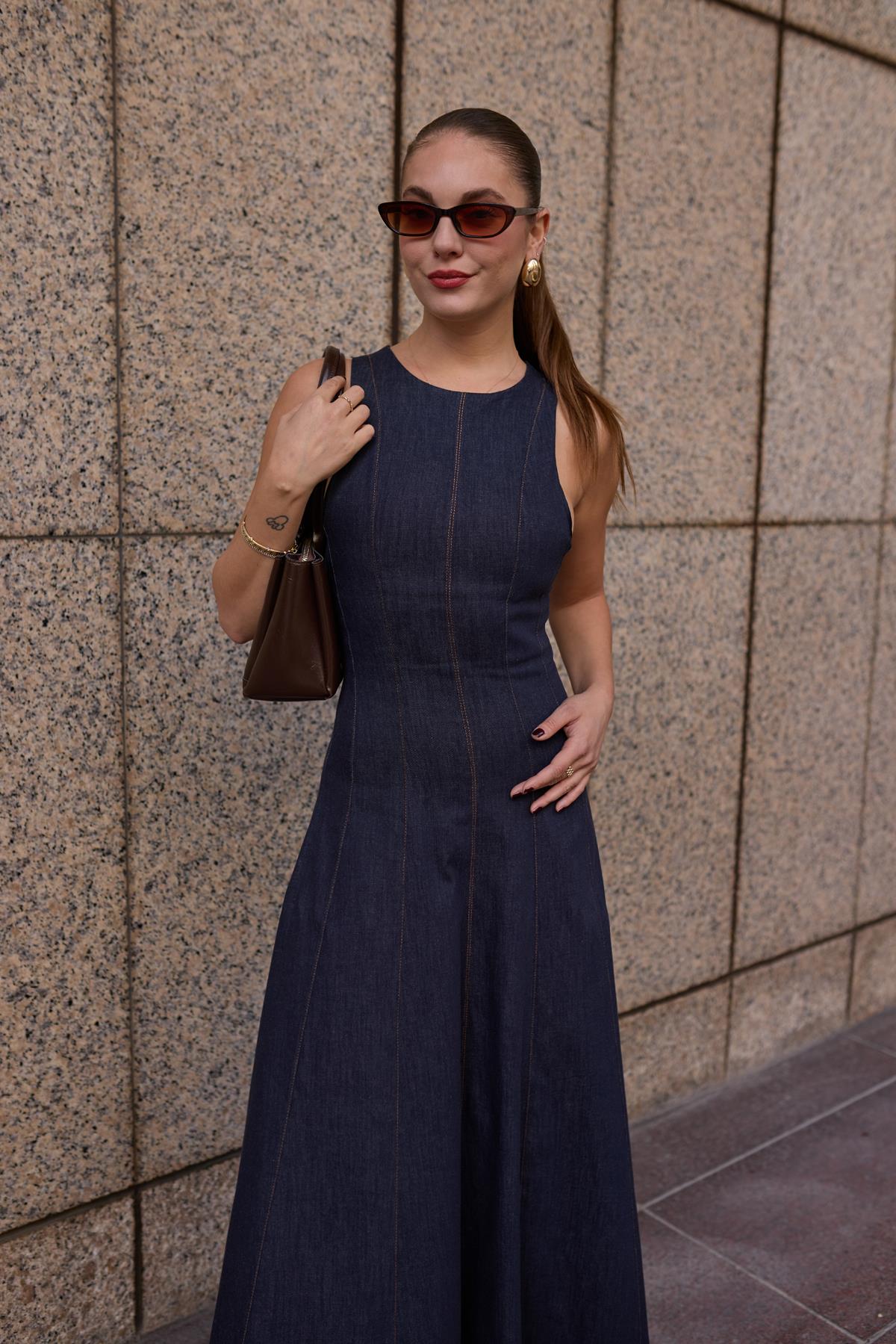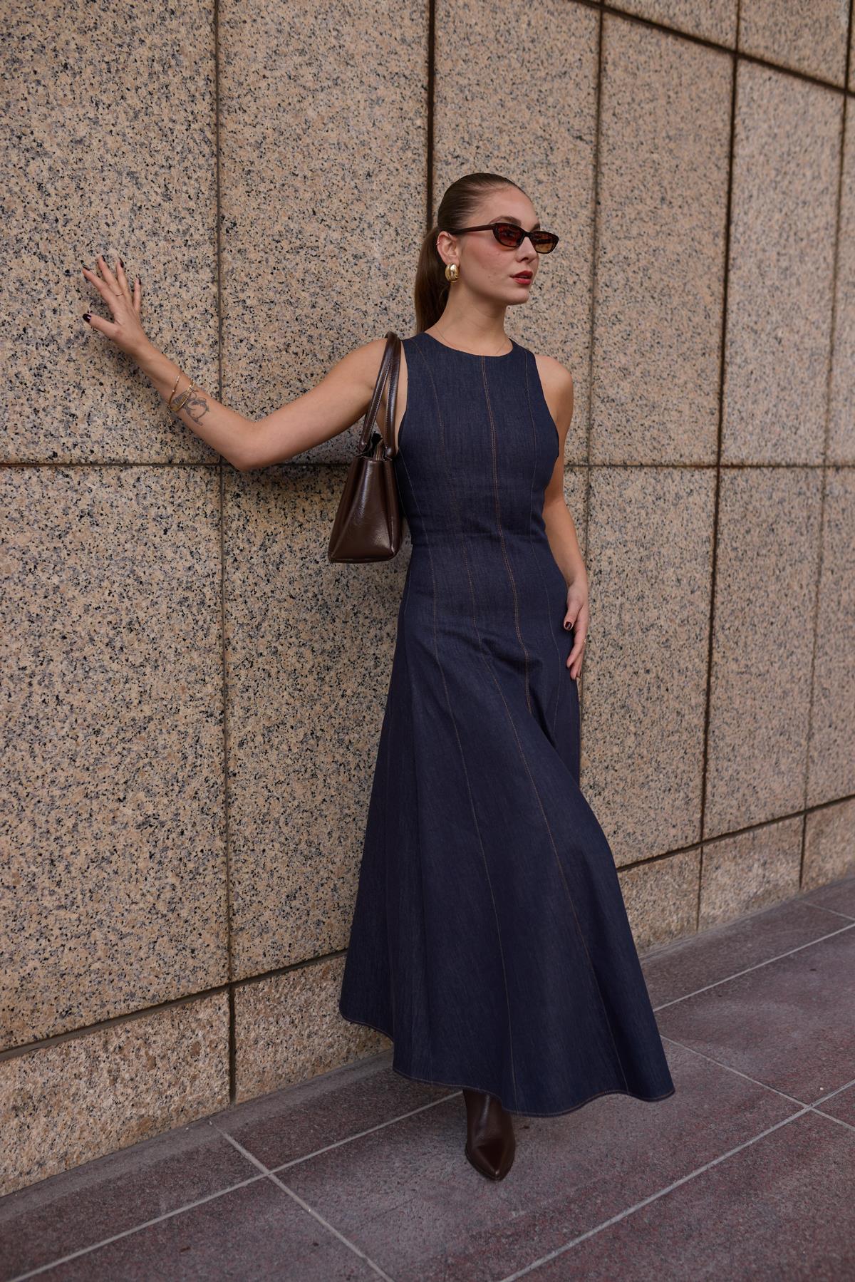 Lacivert Sıfır Kol Dikiş Detaylı Denim Elbise (101-01811)