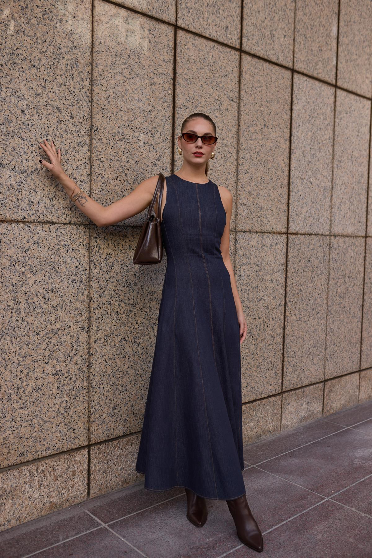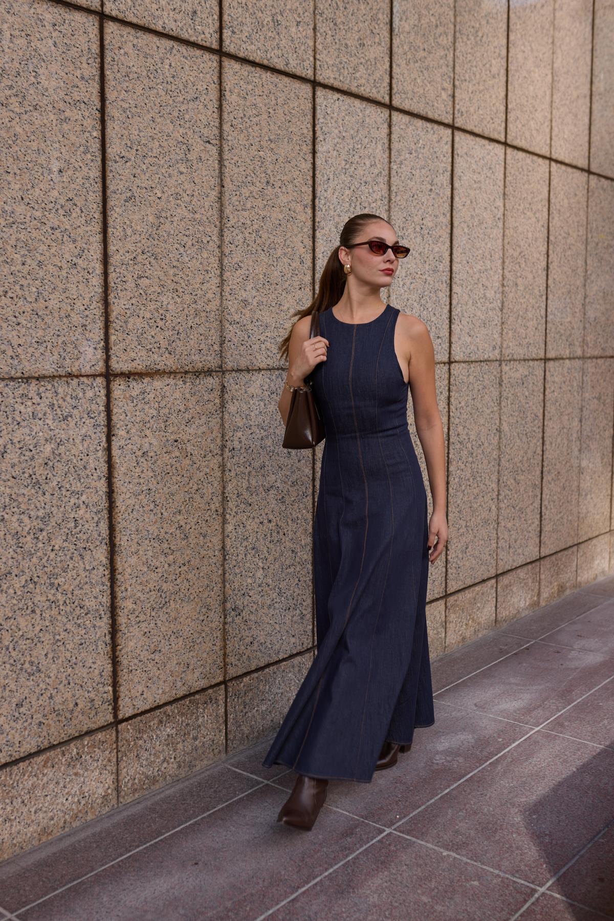 Lacivert Sıfır Kol Dikiş Detaylı Denim Elbise Kahve Sıfır Kol Dikiş Detaylı Denim Elbise