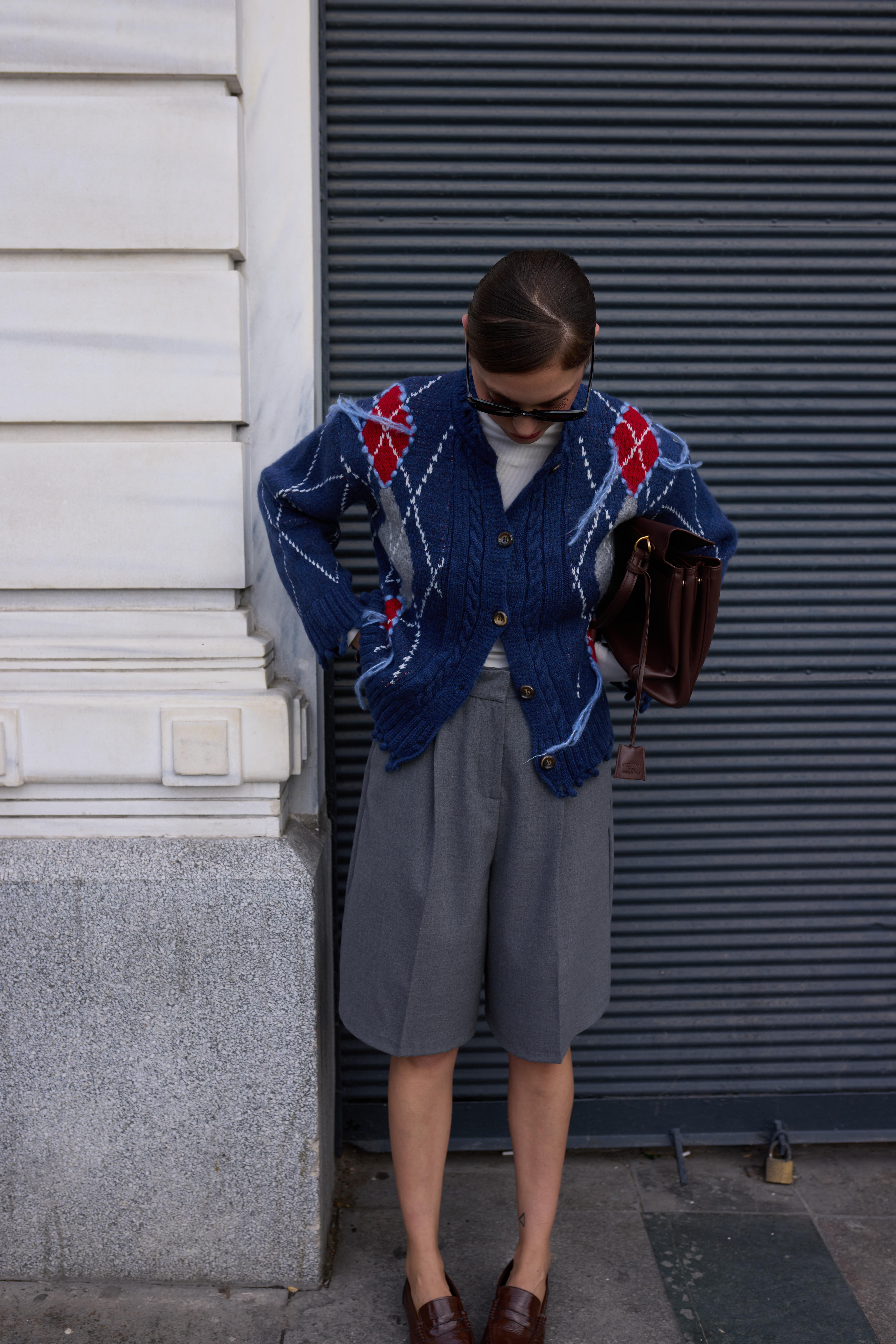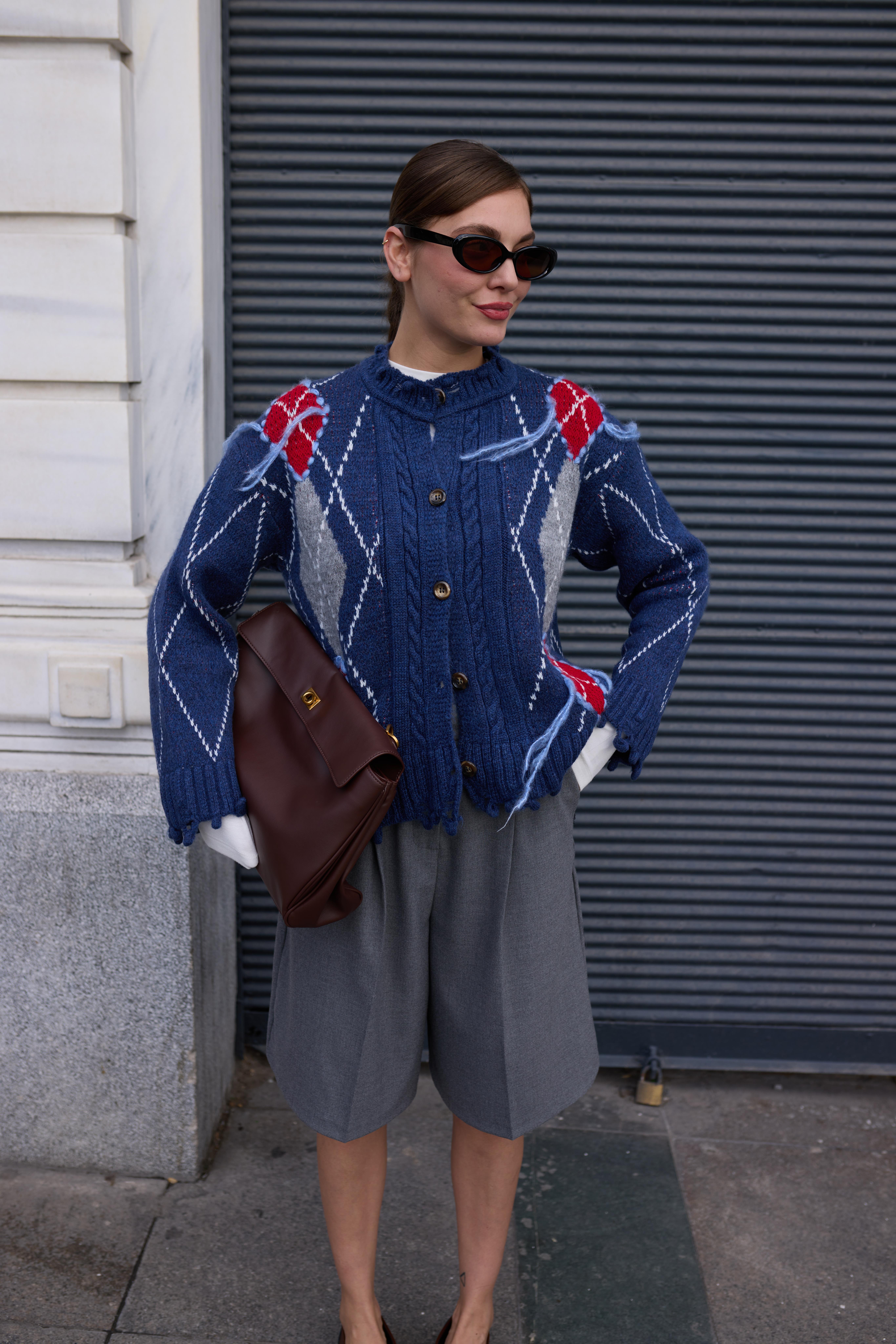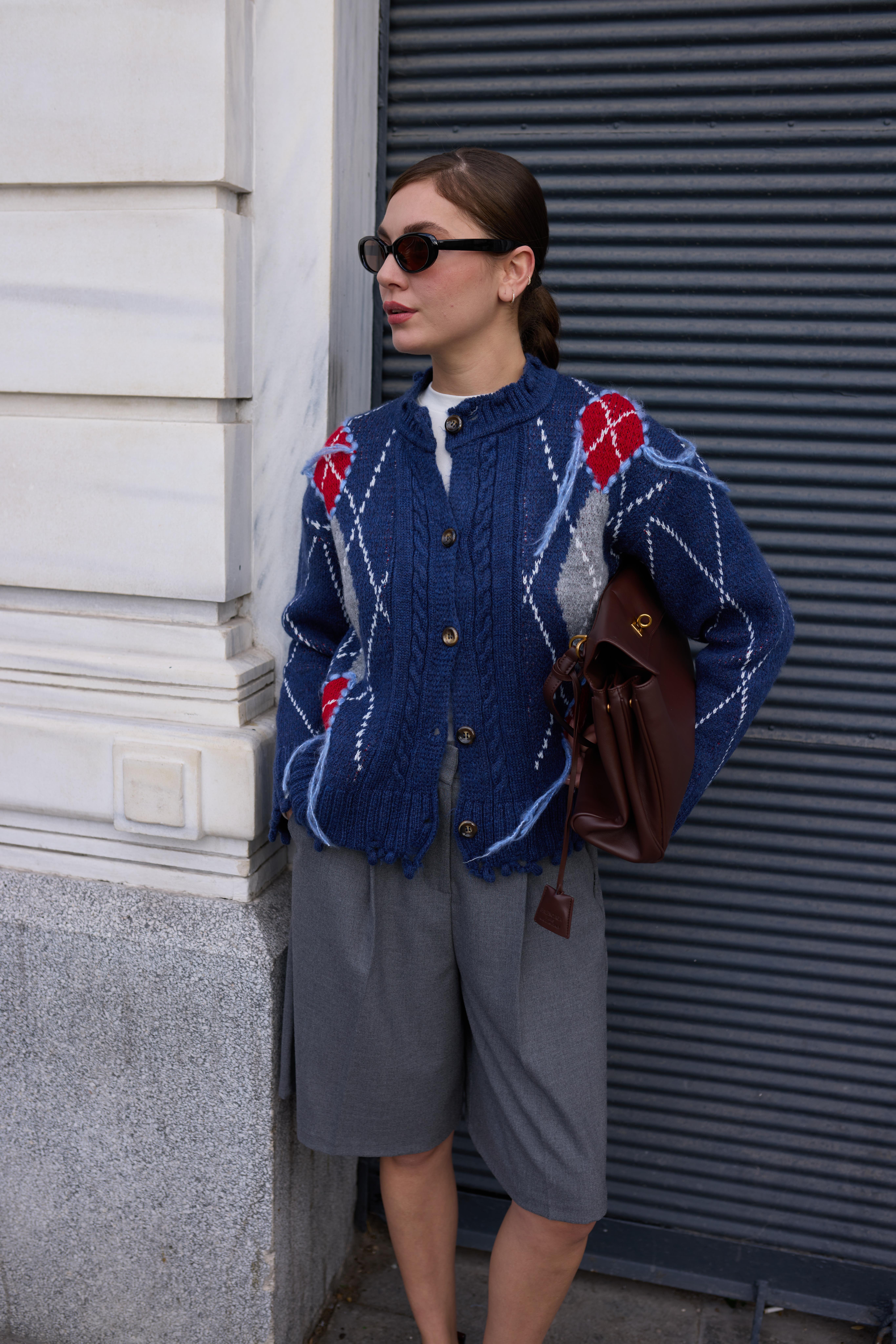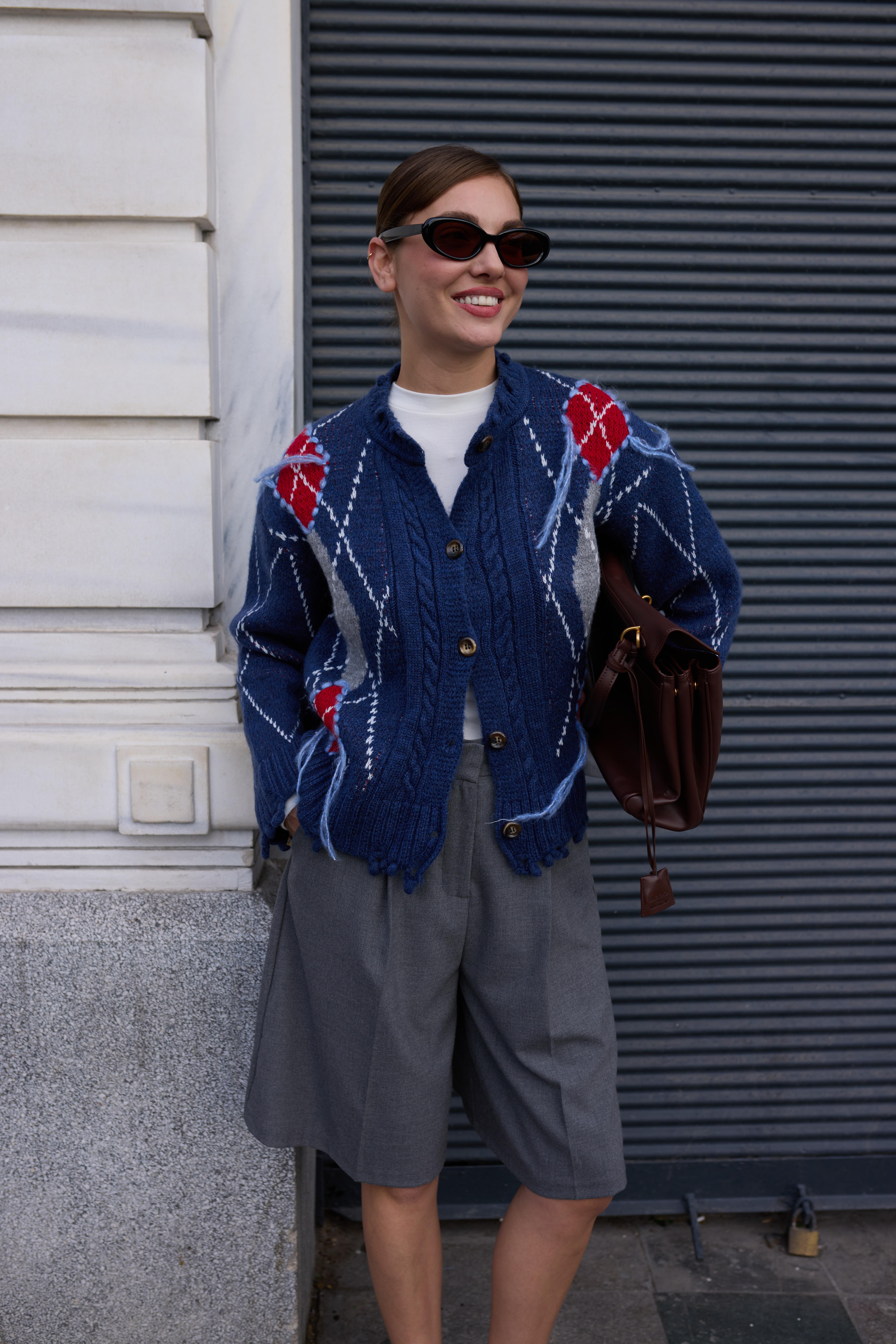 Mavi Baklava Desen Saçaklı Hırka (104-00492)
