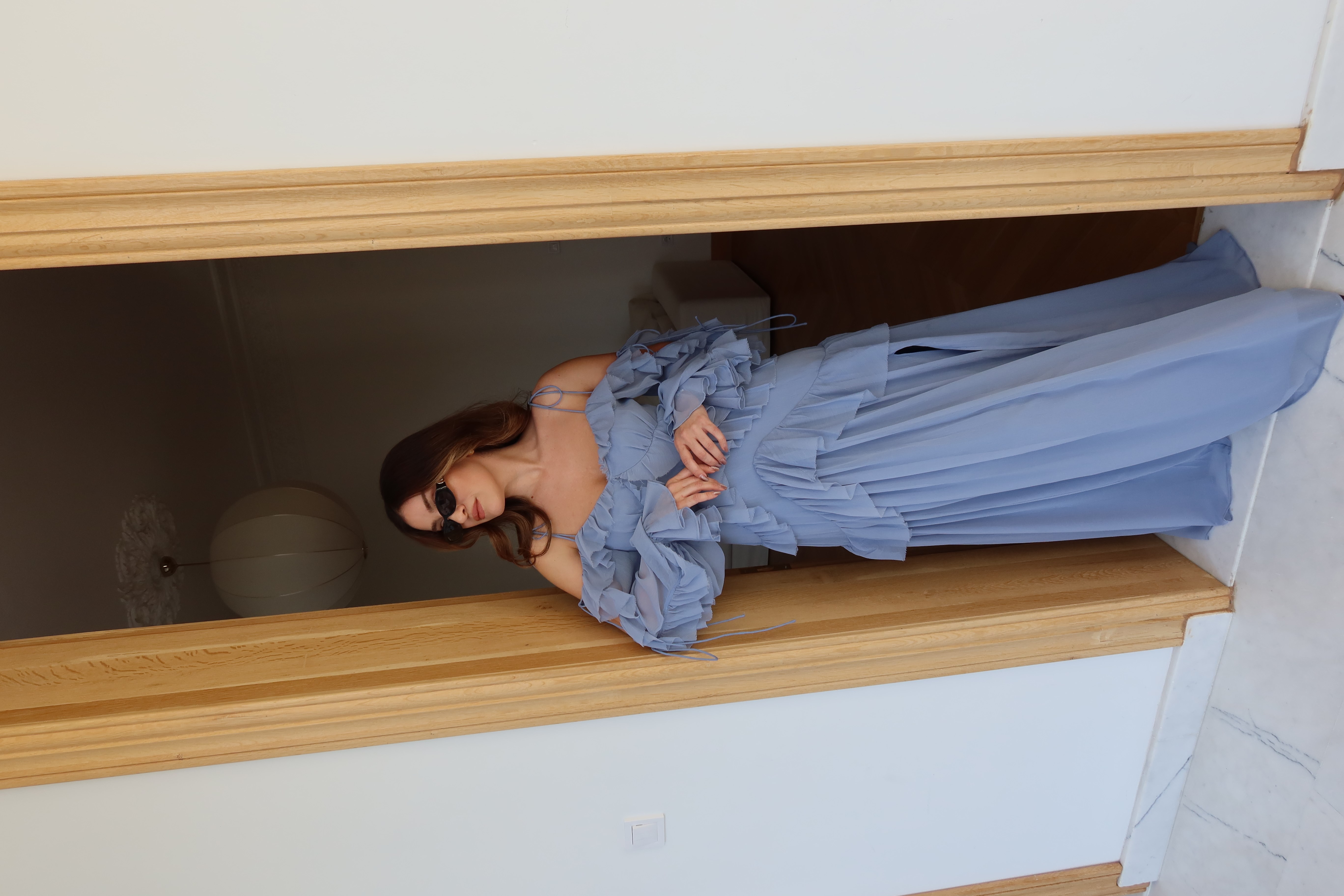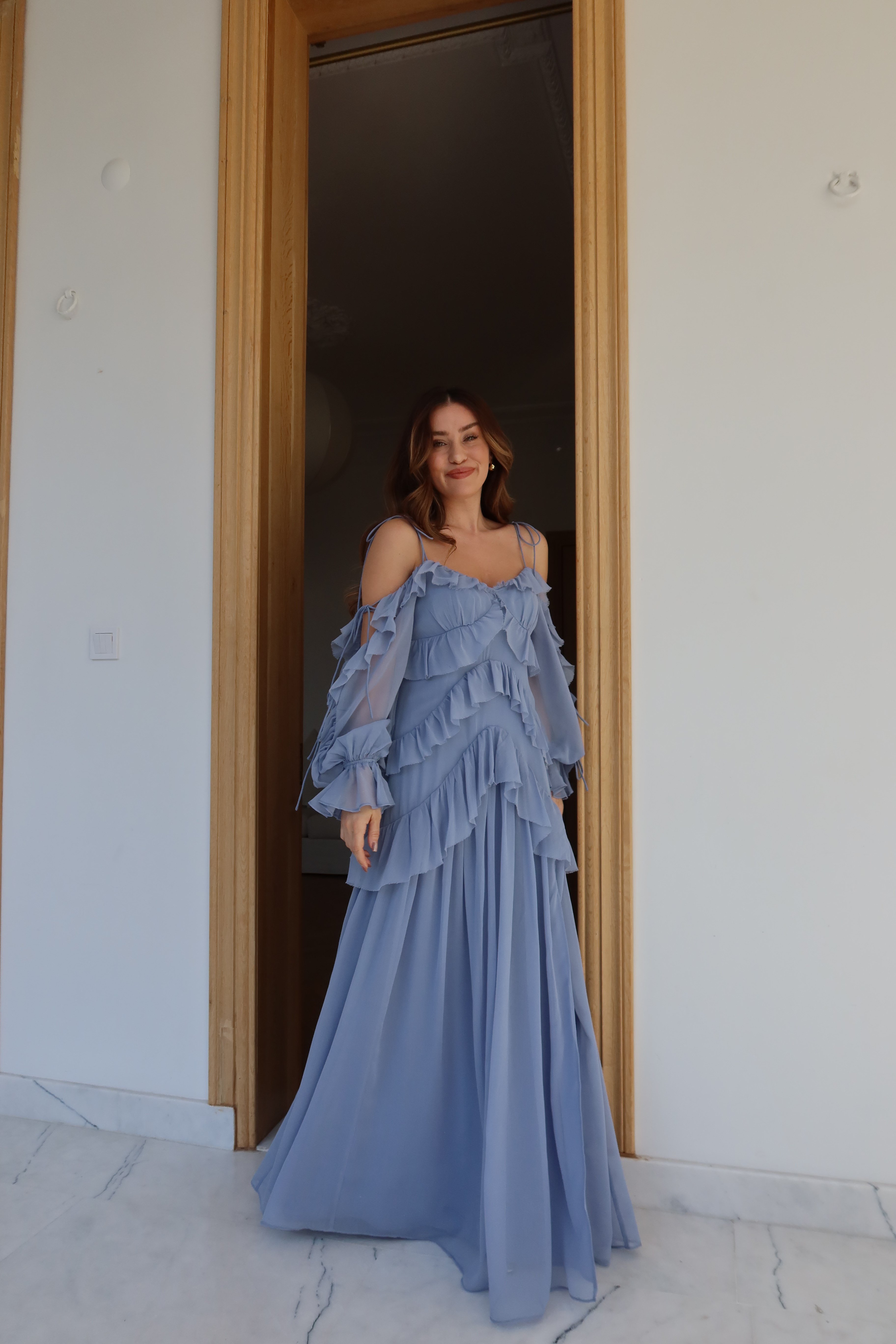 Mavi Fırfır Detaylı Omuzdan Bağlamalı Tasarım Elbise