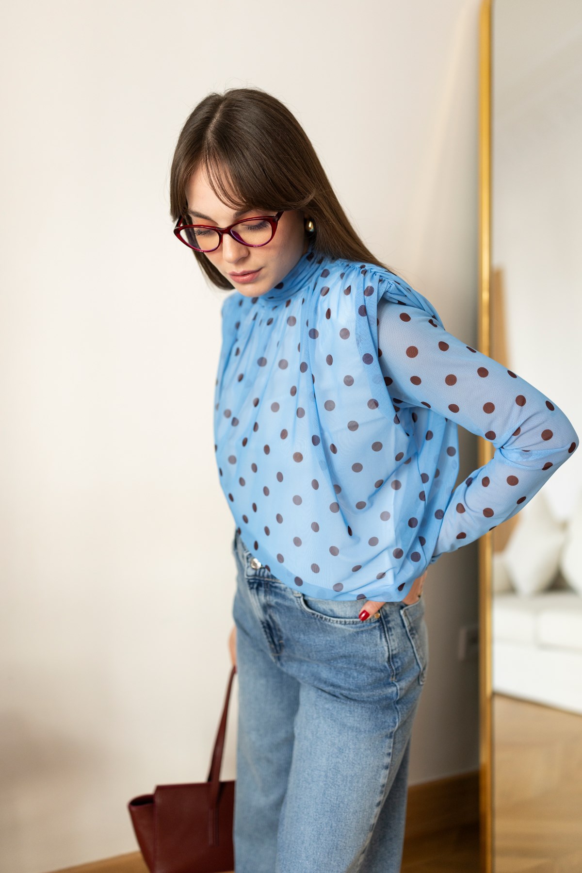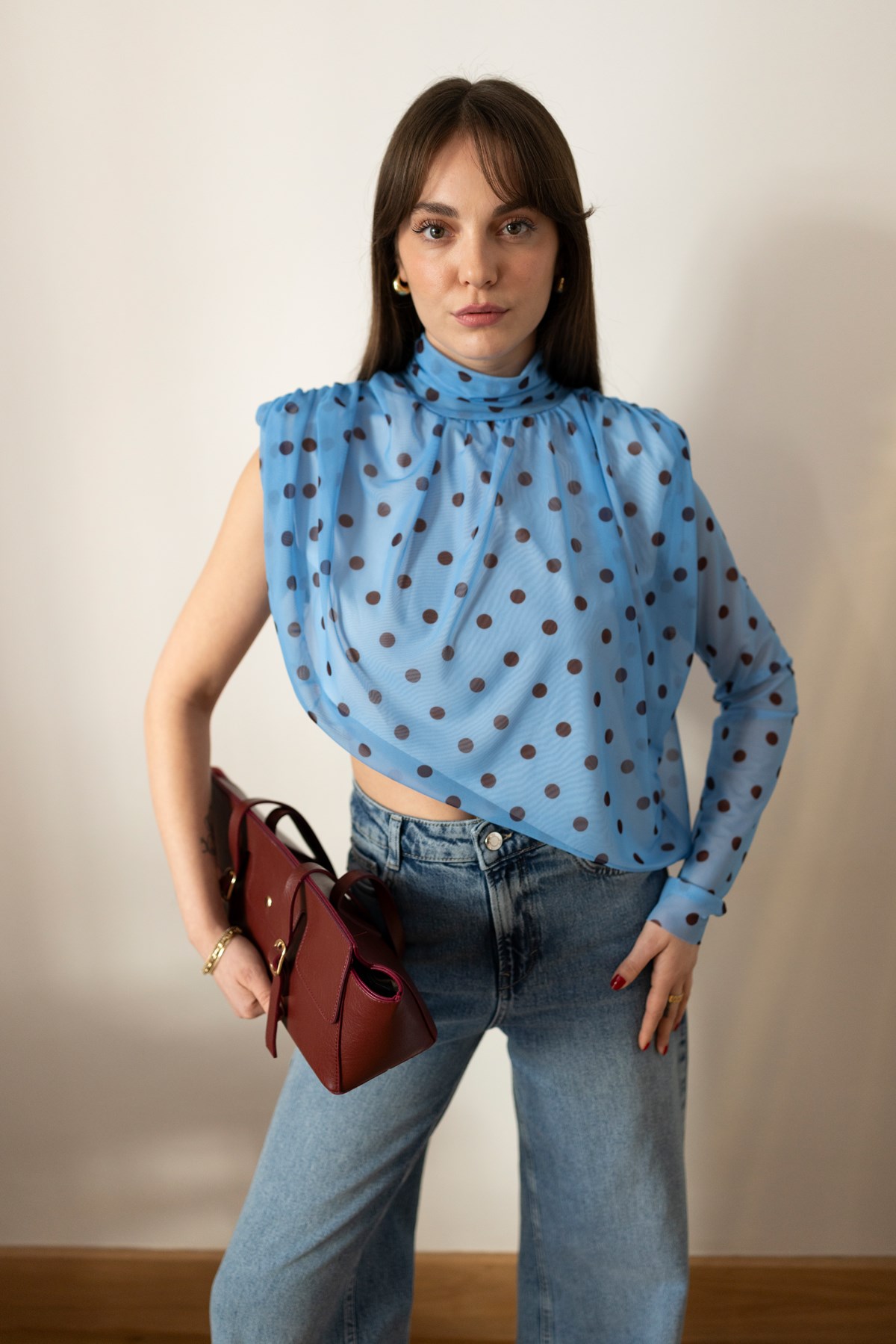 Mavi Tek Kol Detaylı Puantiyeli Bluz (102-00752)