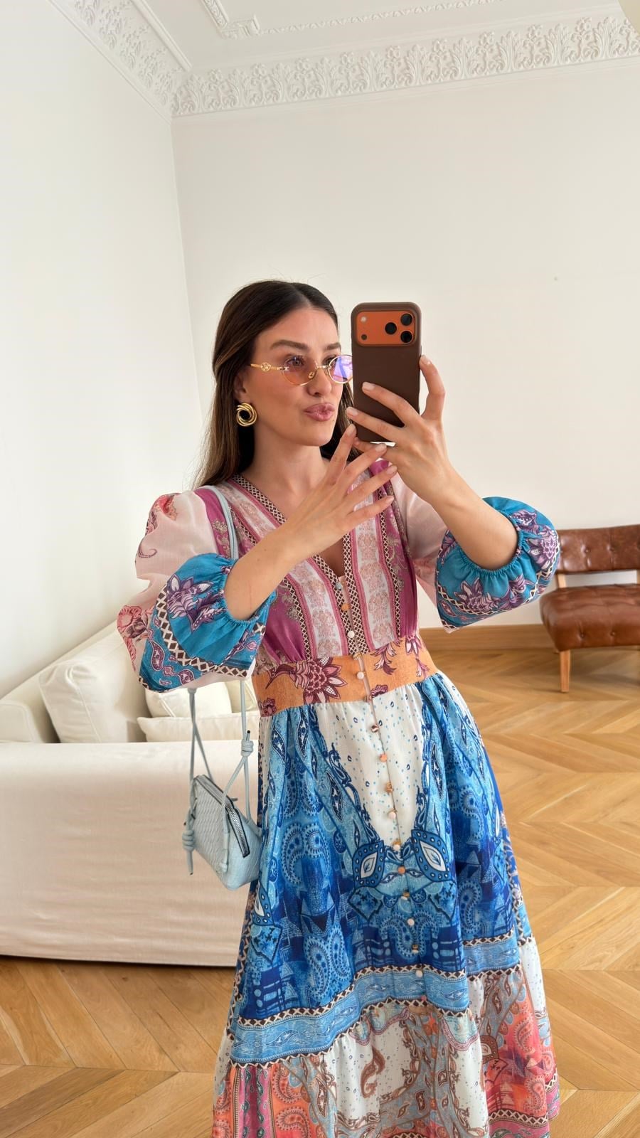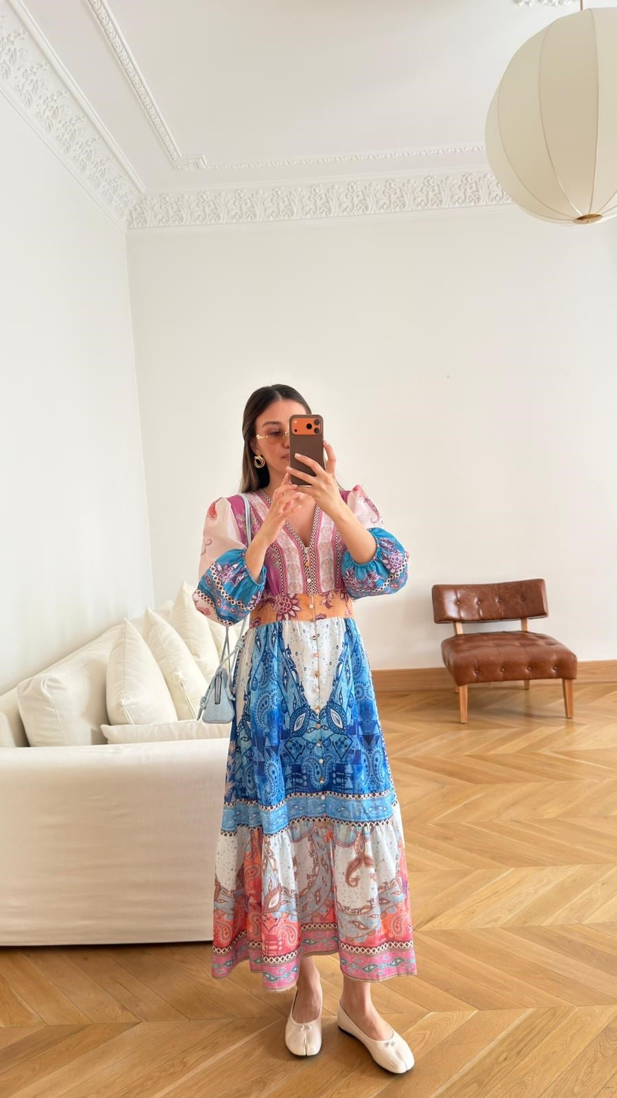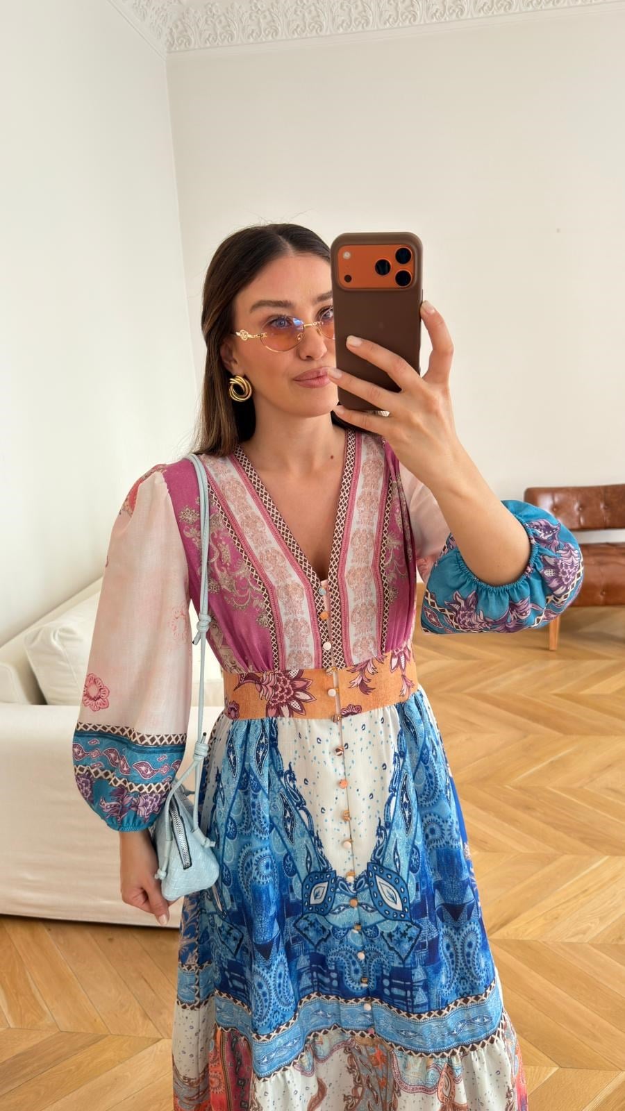 Mavi V Yaka Boydan Düğmeli Etnik Desenli Elbise